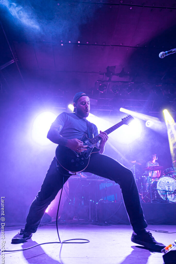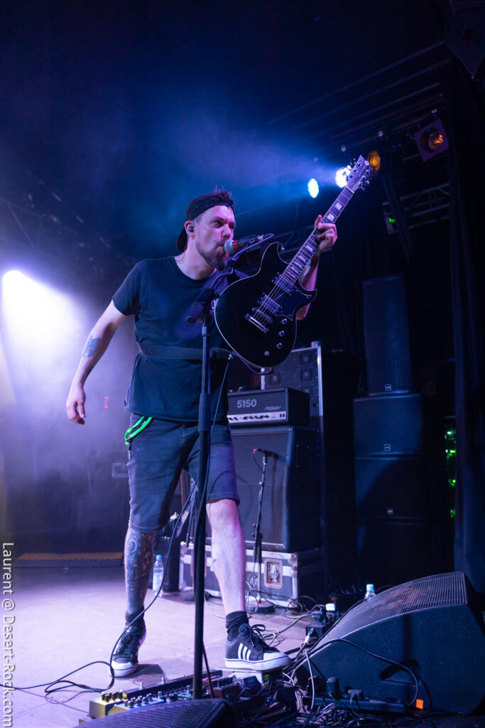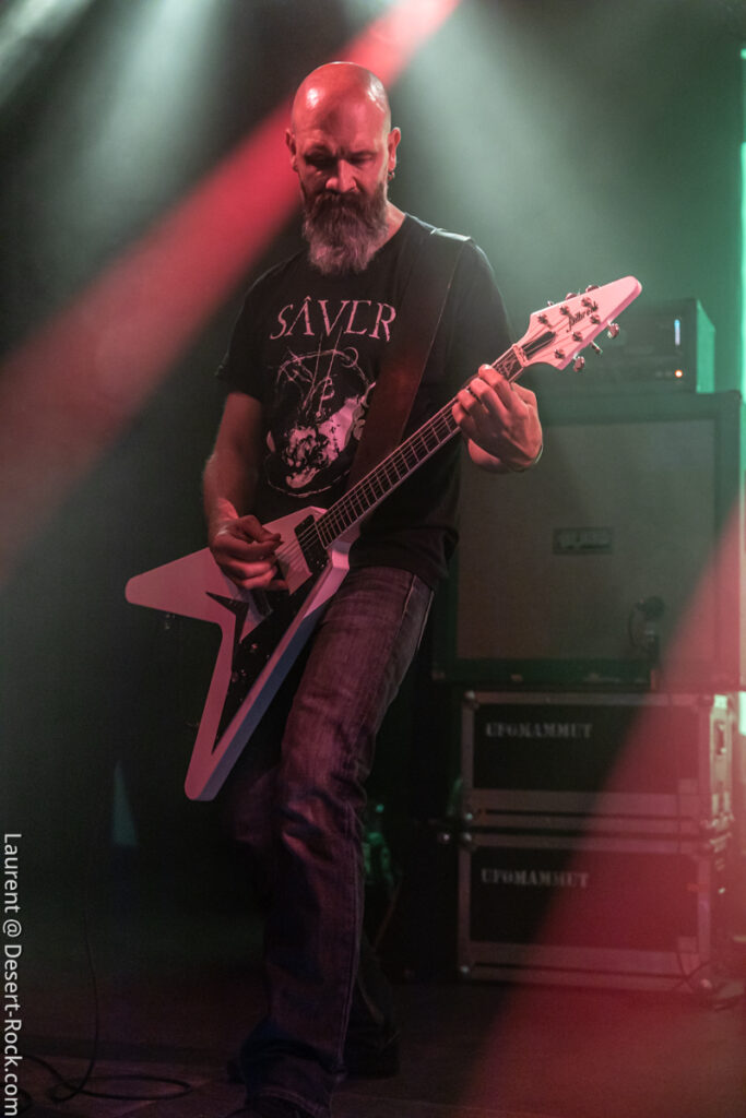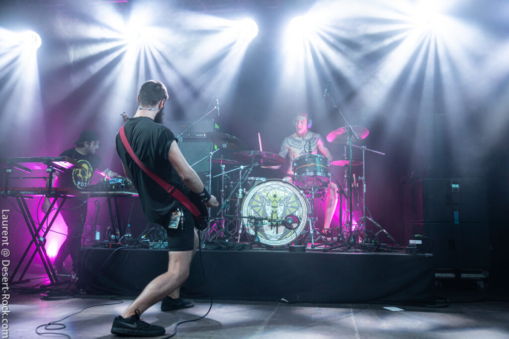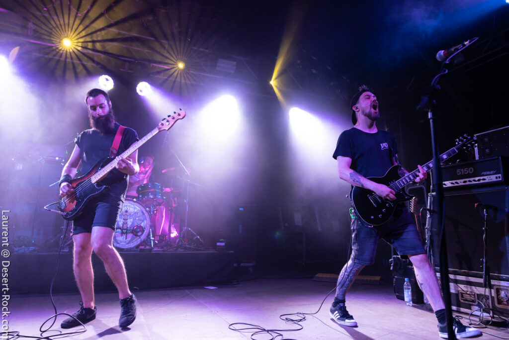 Après avoir reçu un groupe vintage, cette scène accueille des Britanniques qui ne se sont pas déplacés pour enfiler des perles. Après un démarrage bien à la bourre – le premier, mais pas le dernier du festival – Dvne calme tout le monde en attaquant dans leur registre couillu ! Ceux qui piaffaient d’impatience ont la banane : le set est impeccable. Ça bastonne à la guitare et au chant sur les deux flancs de la scène, épaulés par un bassiste charismatique, et dépourvu de micro (mais pas de pilosité), au centre, tandis que l’homme bidouillant les machines se cache dans la pénombre en fond de scène. On a carrément changé de registre et les lourds de l’assistance se délectent des vocaux hurlés sur fond de grattes distordues. Il faut pourtant reconnaître à la bande d’Édimbourg (avec un français dans le lot) un sacré talent quand ils abordent les parties moins rentre-dedans de leur set durant lesquelles le travail de l’homme au clavier se fait très présent alors que se déploient des vocaux plus éthérés. Un gros coup de cœur pour cette prestation aussi excellente qu’inattendue.