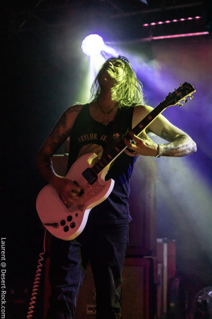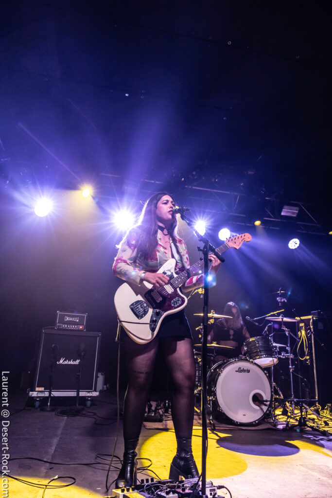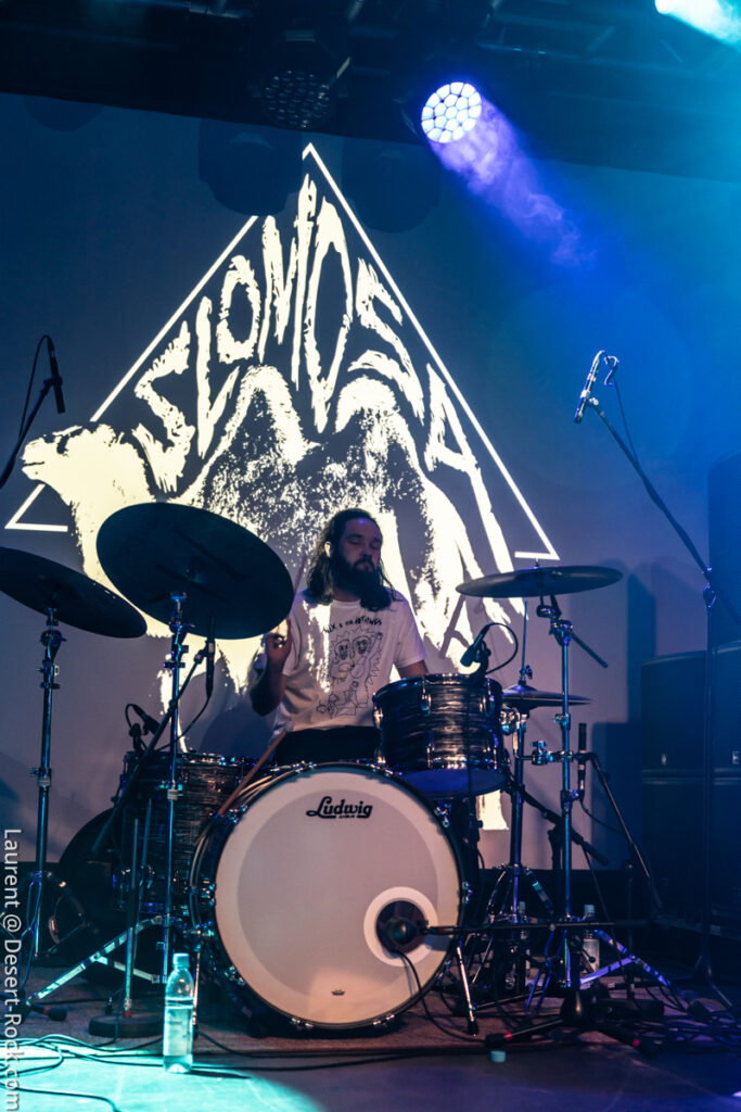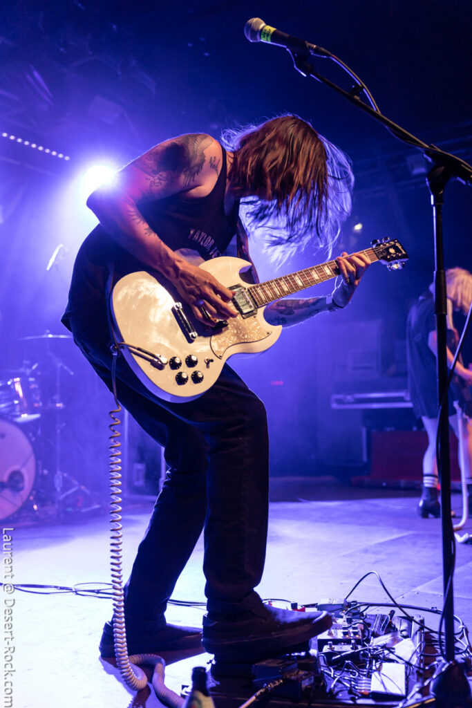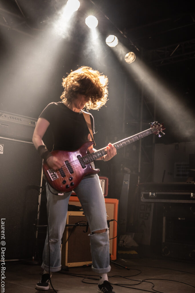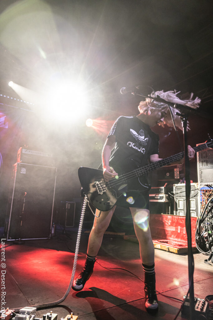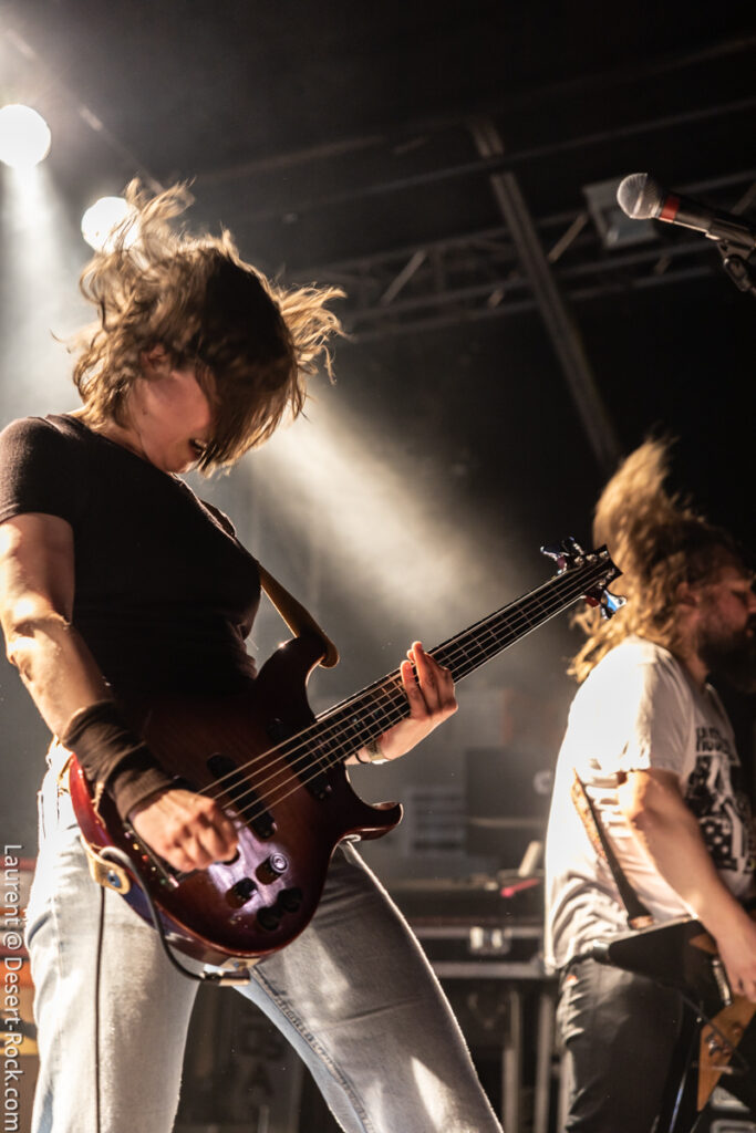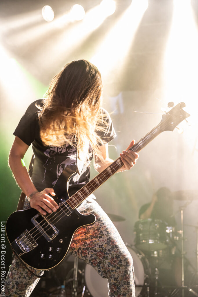 Le trio féminin de Berlin constituait la bizarrerie du festival question registre musical, et c’est devant une foule compacte que le dernier concert du festival sera déployé avec un retard frisant le scandale pour les personnes âgées que nous sommes devenues. 1000Mods avaient terminé leur prestation depuis un énorme moment quand enfin les lumières se sont éteintes dans la salle baptisée Sound Stage le temps d’un week-end. C’est aussi devant la plupart des musiciens présents sur scène durant la journée que les membres du groupe sont arrivées à tour de rôle (batterie, basse puis guitare) pour envoyer le premier morceau. La discographie du groupe entre punk daté, Riot grrrl engagé, grunge, garage et rock est congrue, avec un long format et un court, mais leur présence scénique dans les fêtes stoner est régulière. Avec un capital sympathie au top et leur frontwoman charismatique, Kat, le groupe a maintenu éveillé le public déjà chauffé à blanc par le groupe précédent en envoyant sa sauce très accessible et fort propice aux expressions gestuelles les plus diverses.