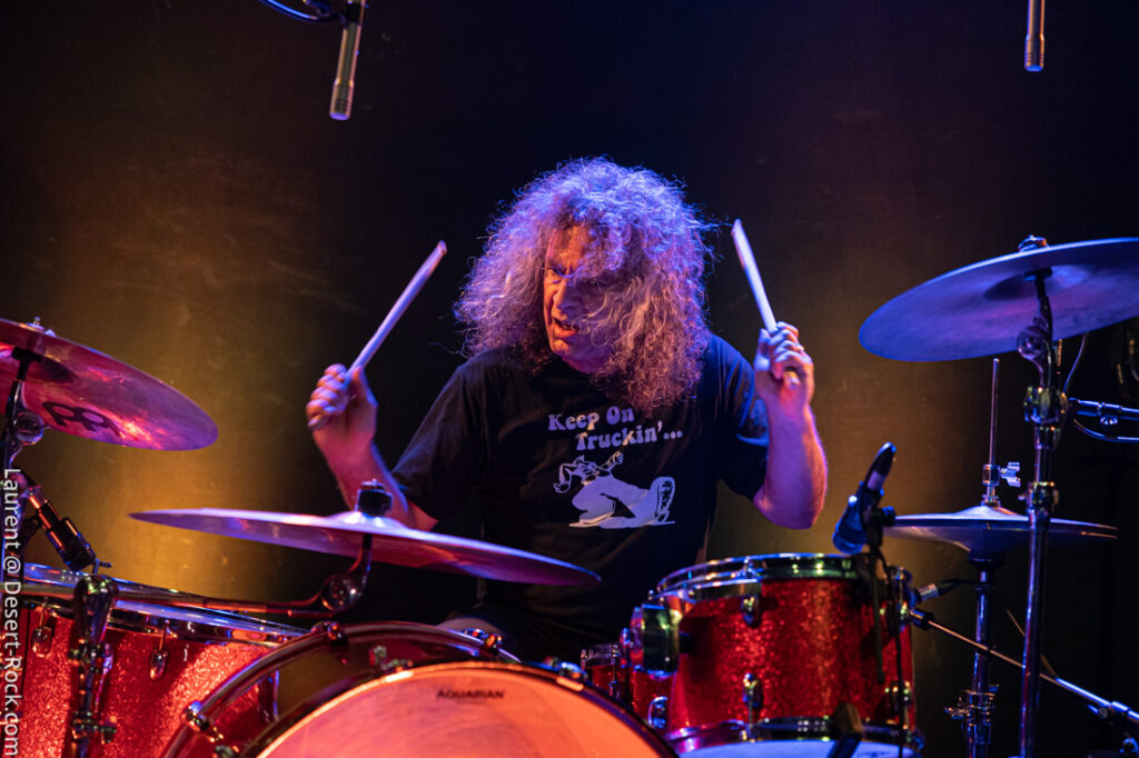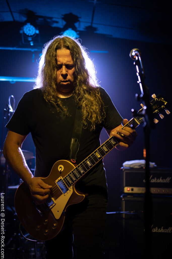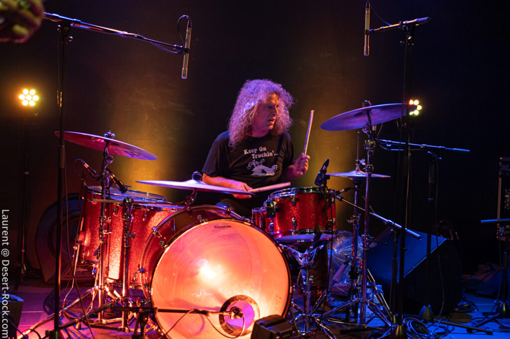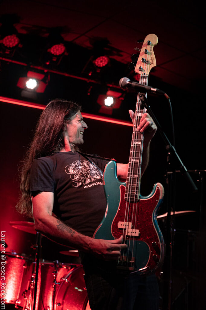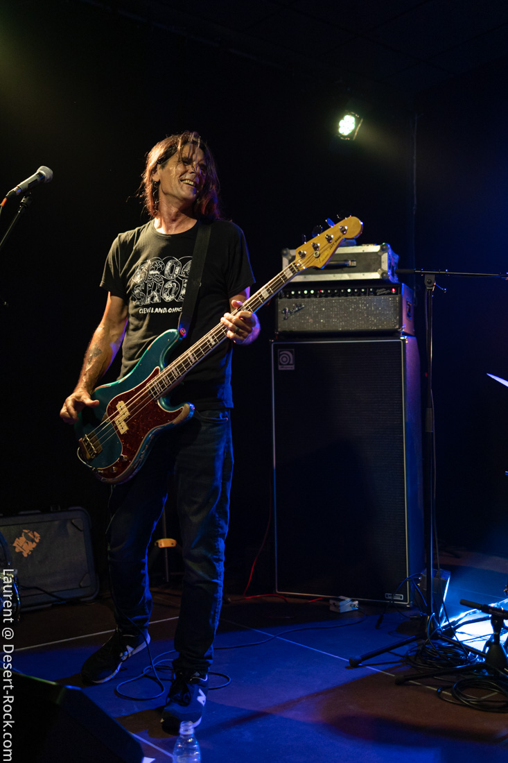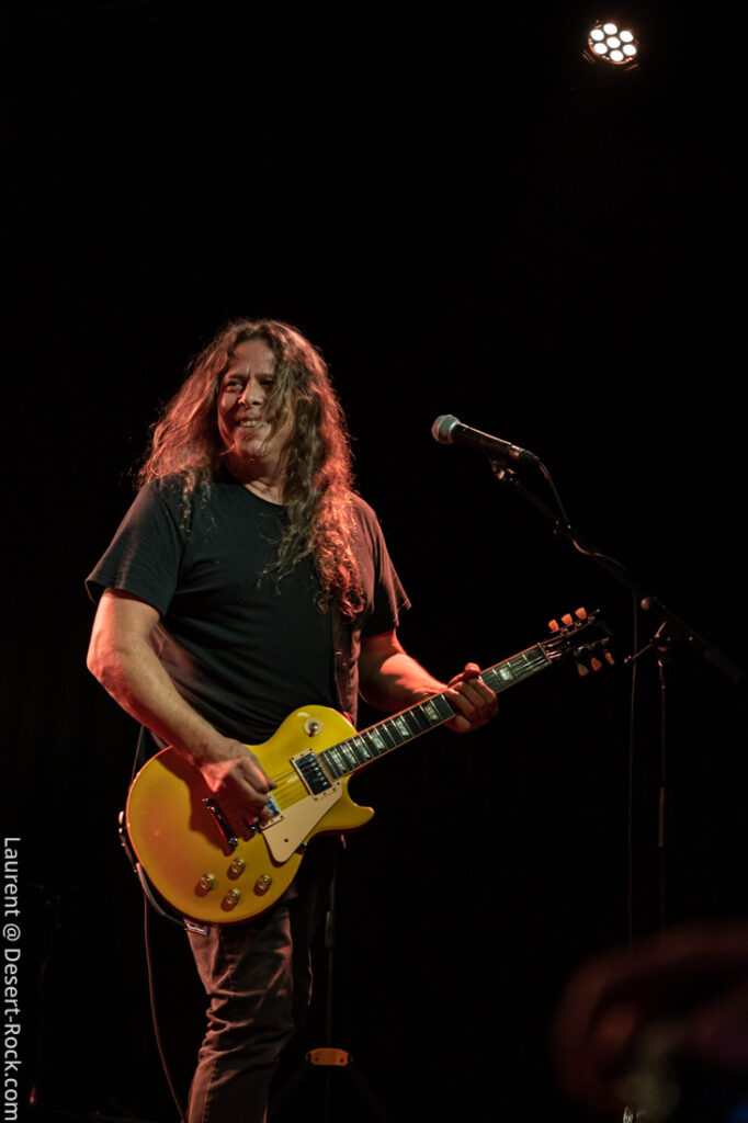 Quoi qu’il en soit, le groupe se chauffe sur une instru dérivée du « Frankenstein » de Edgar Winter en mode énervé, pour enchaîner direct, à son habitude, sur leur standard catchy « Hope You Die ». Le son est impeccable, et les gars sont en grande forme : ça joue, voire, comme me le souffle mon voisin dans l’assistance, « ça tricote ». La dextérité des musiciens est bien connue et documentée, et les voir sous nos yeux ne fait que nous le rappeler : Garrett Sweeny, le « petit nouveau » lead guitarist de Monster Magnet depuis quand même une douzaine d’années (!!) est un brillant soliste, peu démonstratif, mais d’une efficacité redoutable. Peu d’effets, peu de digressions, peu de gesticulations, mais du riff du riff du riff, et au milieu, des soli-éclairs, véloces et percutants. De l’autre côté de la scène, l’ineffable Chris Kosnik, désormais ancien Monster Magnet (il y a été remplacé par le discret Alec Morton ces dernières années) ne se dépare pas de son éternel sourire, et délivre entre chaque titre quelques bons mots au public, vannes bon enfant et contextualisations bienvenues de certaines chansons. Son jeu de basse, entre groove de forcené, mélodiste hors pair et technique impeccable (il faut voir les doigts de sa main gauche danser sur les cordes…), vient faire un lien parfait entre les leads de Sweeny et la pure rythmique, où il est épaulé par l’impeccable Bob Pantella, machine à rythme indéboulonnable. Techniquement, ça se plante là, mais sans démonstration, toujours au profit de brulots stoner jams nerveux et acérés, taillés pour le live, pleins d’énergie, de riffs glorieux et de soli météorites.