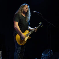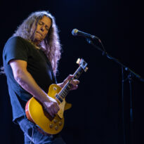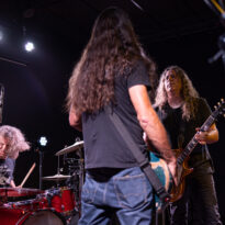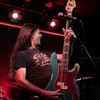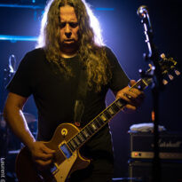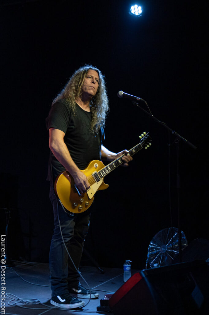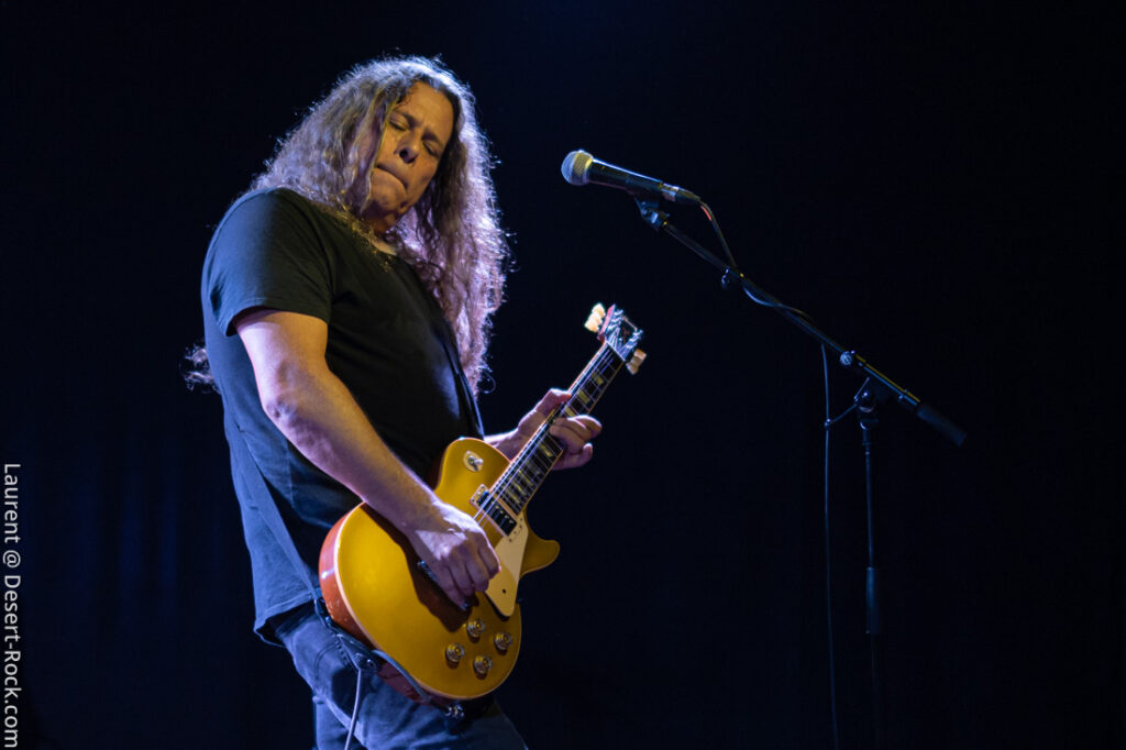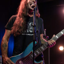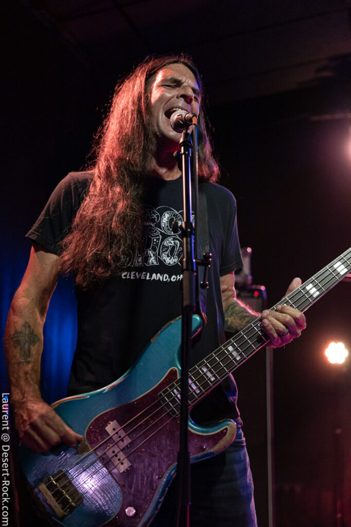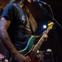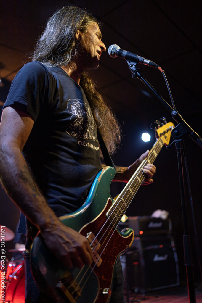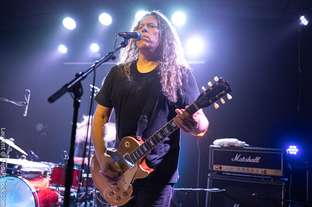 Quoi qu’il en soit, le groupe se chauffe sur une instru dérivée du « Frankenstein » de Edgar Winter en mode énervé, pour enchaîner direct, à son habitude, sur leur standard catchy « Hope You Die ». Le son est impeccable, et les gars sont en grande forme : ça joue, voire, comme me le souffle mon voisin dans l’assistance, « ça tricote ». La dextérité des musiciens est bien connue et documentée, et les voir sous nos yeux ne fait que nous le rappeler : Garrett Sweeny, le « petit nouveau » lead guitarist de Monster Magnet depuis quand même une douzaine d’années (!!) est un brillant soliste, peu démonstratif, mais d’une efficacité redoutable. Peu d’effets, peu de digressions, peu de gesticulations, mais du riff du riff du riff, et au milieu, des soli-éclairs, véloces et percutants. De l’autre côté de la scène, l’ineffable Chris Kosnik, désormais ancien Monster Magnet (il y a été remplacé par le discret Alec Morton ces dernières années) ne se dépare pas de son éternel sourire, et délivre entre chaque titre quelques bons mots au public, vannes bon enfant et contextualisations bienvenues de certaines chansons. Son jeu de basse, entre groove de forcené, mélodiste hors pair et technique impeccable (il faut voir les doigts de sa main gauche danser sur les cordes…), vient faire un lien parfait entre les leads de Sweeny et la pure rythmique, où il est épaulé par l’impeccable Bob Pantella, machine à rythme indéboulonnable. Techniquement, ça se plante là, mais sans démonstration, toujours au profit de brulots stoner jams nerveux et acérés, taillés pour le live, pleins d’énergie, de riffs glorieux et de soli météorites.