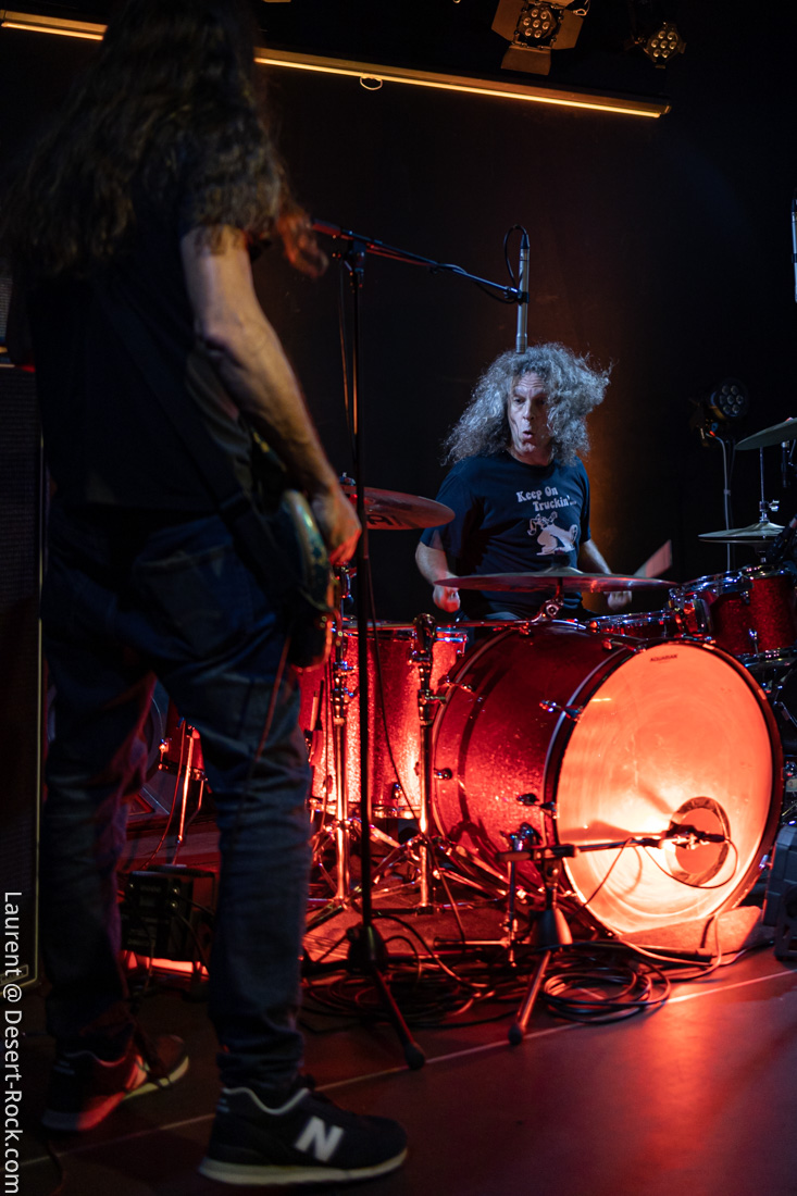 Pas de première partie (c’est dommage, il y a pas mal de formations locales qui auraient apprécié, sans doute, de partager les planches avec ce groupe culte), on a donc juste le temps de papoter un peu et on est jetés direct dans le bain, à l’heure prévue, où l’assistance vient garnir en quelques minutes la petite salle. Même s’il n’y a pas des centaines de personnes, la capacité de la salle est parfaitement adaptée – pour un groupe qui a peu tourné en Europe dans sa carrière, et encore moins en headliner, prétendre à une plus grosse affluence ne serait pas raisonnable.