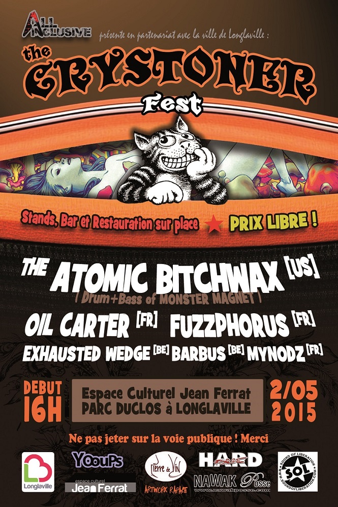 Rendez-vous donc le samedi 2 mai 2015 à Longlaville (54) à la frontière Belge et Luxembourgeoise à partir de 16h pour se baffrer de son velu, jugez plutôt: Atomic Bitchwax, Oil Carter, Fuzzphorus, Barbus, Exhausted Wedge, MyNodz.