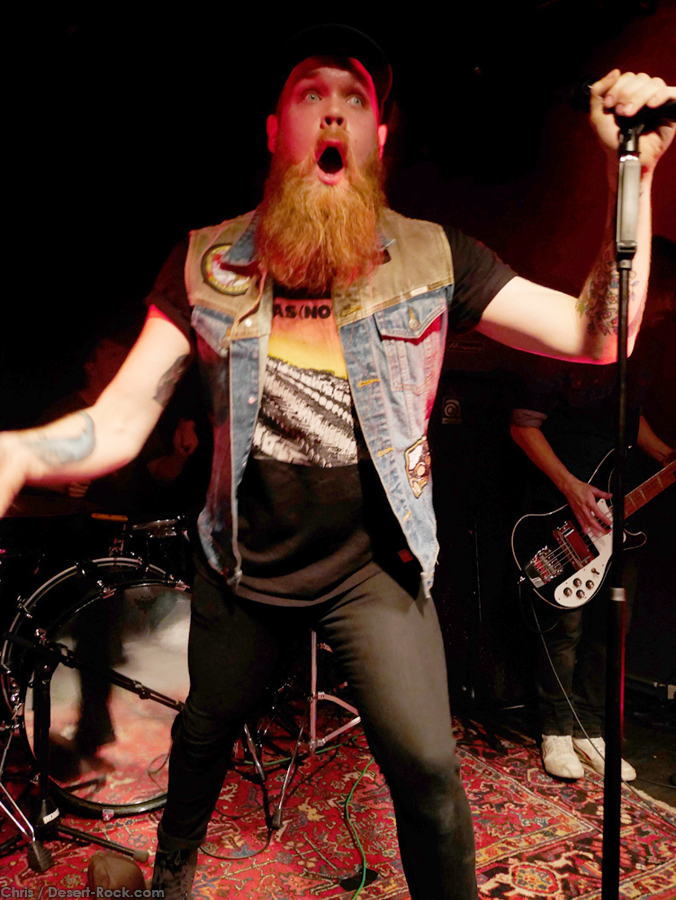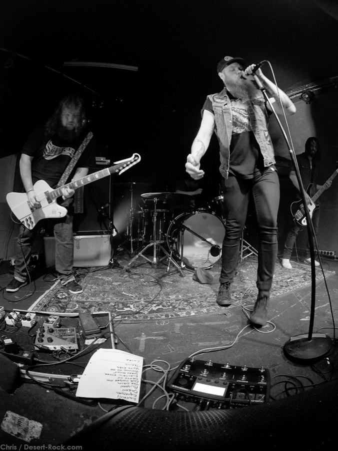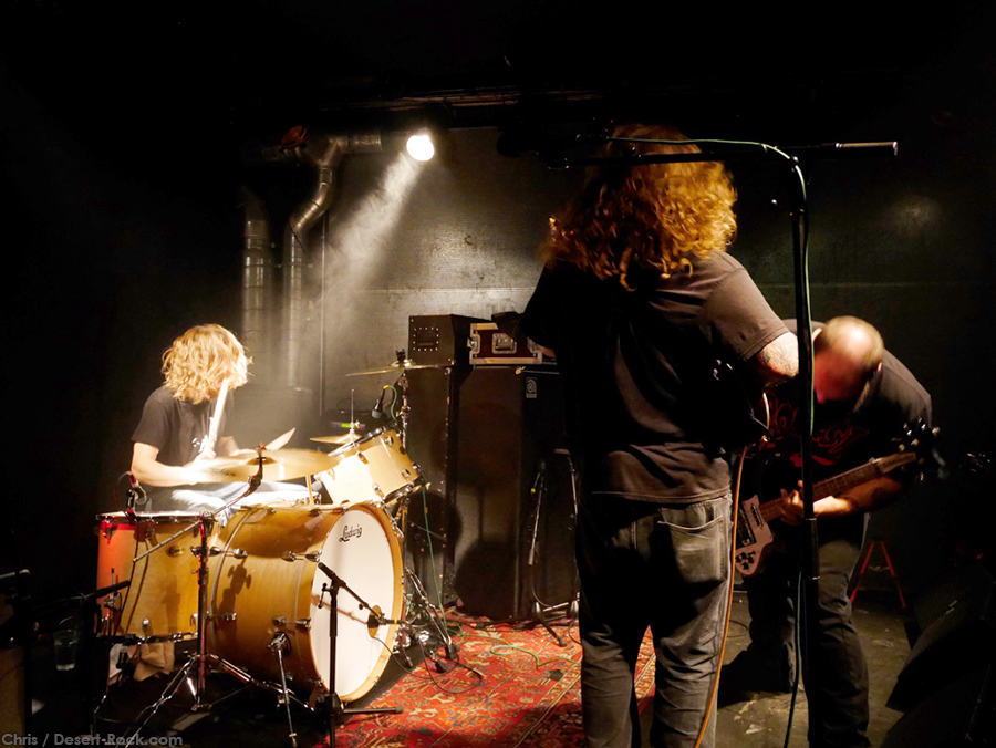 Après avoir échangé quelques mots avec les personnes connues de nos services, le moment est rapidement venu de se rendre dans les soubassements pour entendre les amplis balancer du gras car dans ces contrées on ne badine pas avec les horaires. Je me fraye assez facilement un passage au milieu de la foule intergénérationnelle – et au sein de laquelle la gente féminine est bien représentée – pour atteindre le bords scène surélevé de quelques centimètres par rapport au plancher des vaches où Brandon et Mike se chauffent en trépignant d’impatience alors que le frontman de The Midnight Ghost Train a visiblement dû régler de toute urgence un problème technique. Le son tourne agréablement et lorsque le fort sympathique Steve s’en revient, le trio US se lance dans un long plan instrumental en guise d’intro : « Along The Chasm » qui ouvre tout comme sur leur dernier opus. Les lascars sont visiblement bien en place, leurs faciès arborent d’énormes sourires et notre ami qui tourne les boutons au fonds de la salle a opté pour un son énorme : la soirée débute sous les meilleurs auspices pour ce concert plein bien avant l’ouverture des portes.