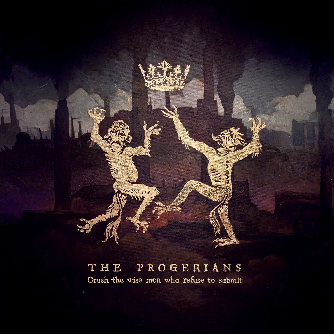 Crush The Wise Men Who Refuse To Submit, le second long-format de The Progerians sort sur Mottow Soundz qui compte parmi ses poulains une autre histoire belge qui envoie du lourd : La Muerte. Cette proximité nationale ainsi que discographique se prolonge, entre ces deux formations, dans la déclinaison de leur art entre urgence, aliénation et barbarie. Un mode d’expression nécessairement très qualitatif à mes yeux qui est soutenu par une pochette au visuel apocalyptique sur lequel se côtoient 2 diablotins dignes d’une illustration moyenâgeuse (la connivence avec Sardonis n’est par ailleurs pas uniquement visuelle ; les anciens s’en souviennent) sur fond d’usines, rappelant la célèbre Battersea Power Station, qui crachent aux cieux leurs fumées sombres. Le ton est donné : pas d’ode aux Combis VW et aux arcs-en-ciel psychédéliques dans ce bestiaire même si « Graven » est plus abordable dans un style heavy rock/stoner bien appuyé ; il en va de manière similaire avec l’intro de « Netjeret » qui fait illusion quelques instants avant de se prolonger dans un style plus doom et fort répétitif sur lequel les chants sont scandés.