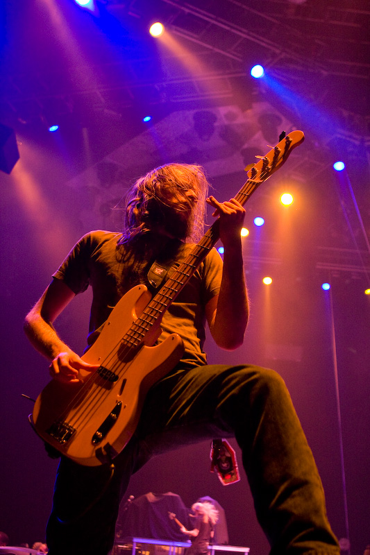 L’heure est vite venue pour The Sword de monter sur scène Un peu trop vite venue, l’heure, d’ailleurs ! Le groupe entame ses premiers accords vers 18h45, soit 15 minutes avant l’heure annoncée d’ouverture des portes ! Pas cool Premier choc : le son est pourri ! Bercy n’a jamais été réputé pour son acoustique irréprochable (euphémisme), mais là, un certain sommet est atteint. Une sorte de bouillie sonore emplit Bercy, si bien qu’il faut bien à chaque fois un couplet et un refrain pour reconnaître un morceau Même si le son s’avère plus acceptable devant la scène, depuis les gradins, c’est une horreur. Encore une fois, pas cool. Les musiciens évoluent comme ils peuvent pour occuper tous les coins de cette scène : l’effet est sympa mais ils sont un peu perdus surtout parce qu’on le les voit pas ! On ne peut pas dire que le groupe bénéficie d’un festival de lumières : quelques spots rougeoyants ou bleus baignent vaguement la scène, mais globalement les musiciens évoluent dans une atmosphère sombre et nébuleuse peu amène. Comble du ridicule : à quelques centimètres d’un musicien, non seulement on le voit à peine arriver, mais il faut quelques secondes pour le reconnaître ! Quel dommage