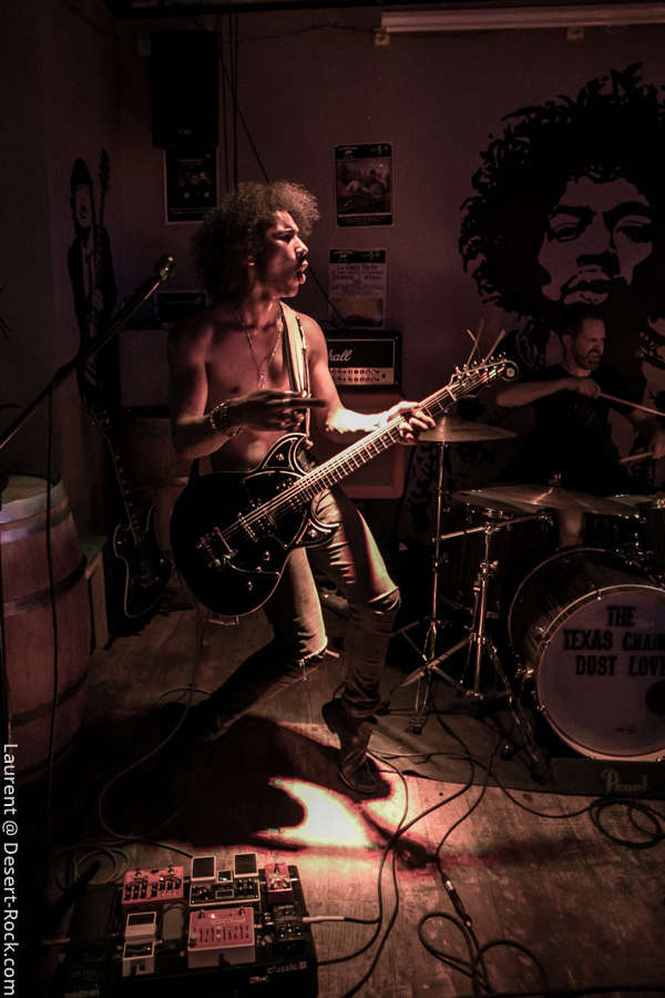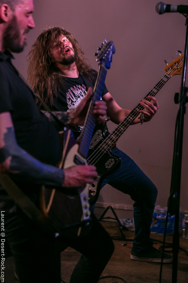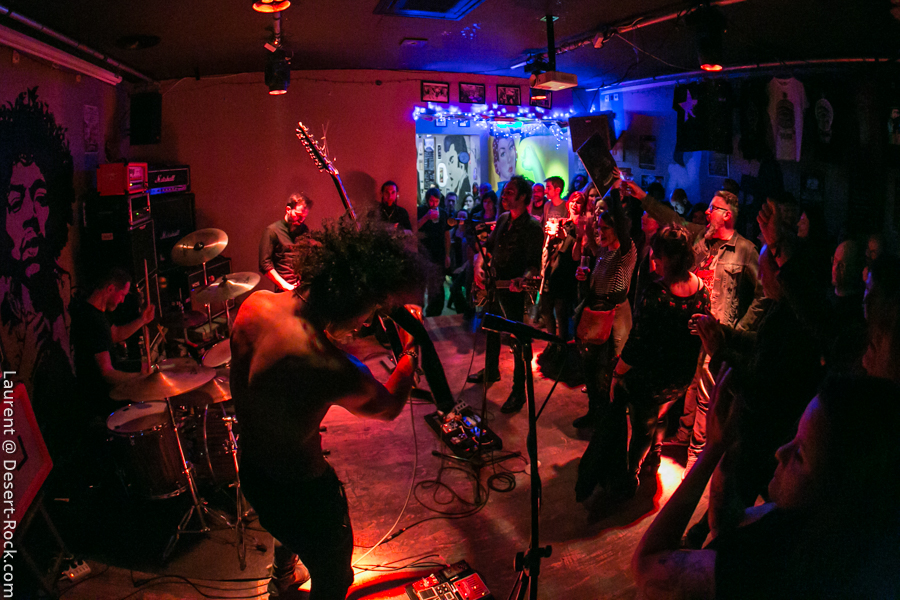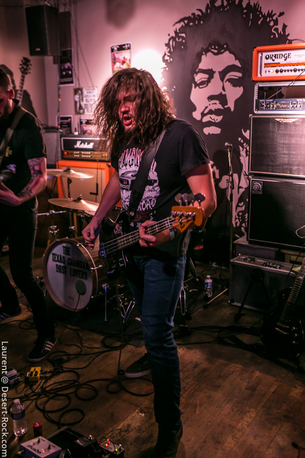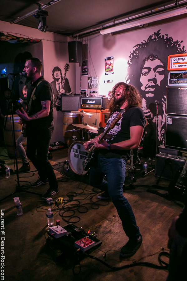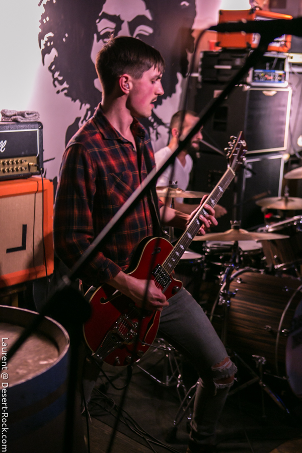 C’est les nantais de Inglorious Bad Stars qui ouvrent les débats dans un club qui commence à gentiment se remplir. Le groupe est plutôt jeune, et a jusqu’ici eu peu d’opportunités de s’exporter hors de sa Loire-Atlantique natale, il profite donc de cette opportunité pour exprimer son potentiel et son énergie. Musicalement le quatuor propose un set solide et généreux : ça joue bien, et la bonne humeur est là, communicative. Musicalement, les compos sont bonnes, les riffs taillent bien et les rythmiques tournent bien. On entend un peu trop souvent des plans emblématiques de QOTSA, mais ce n’est pas si mal intégré… Scéniquement, y’a de l’envie, mais ça reste un peu en retenue, sauf du côté de Maxime à la basse, qui a de l’énergie à revendre. Bref, un set sympa et apprécié !
