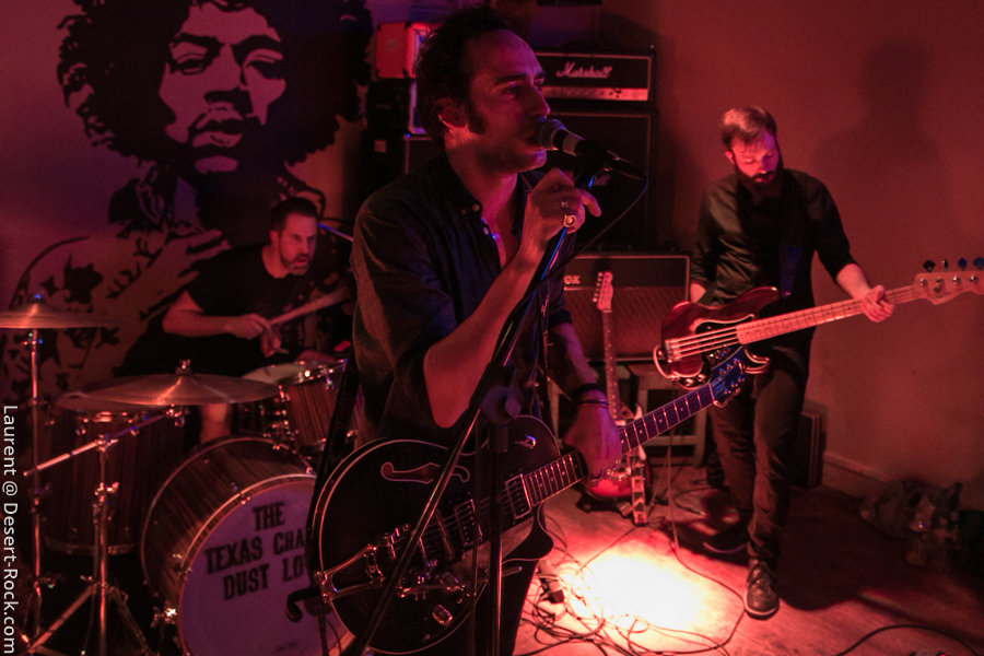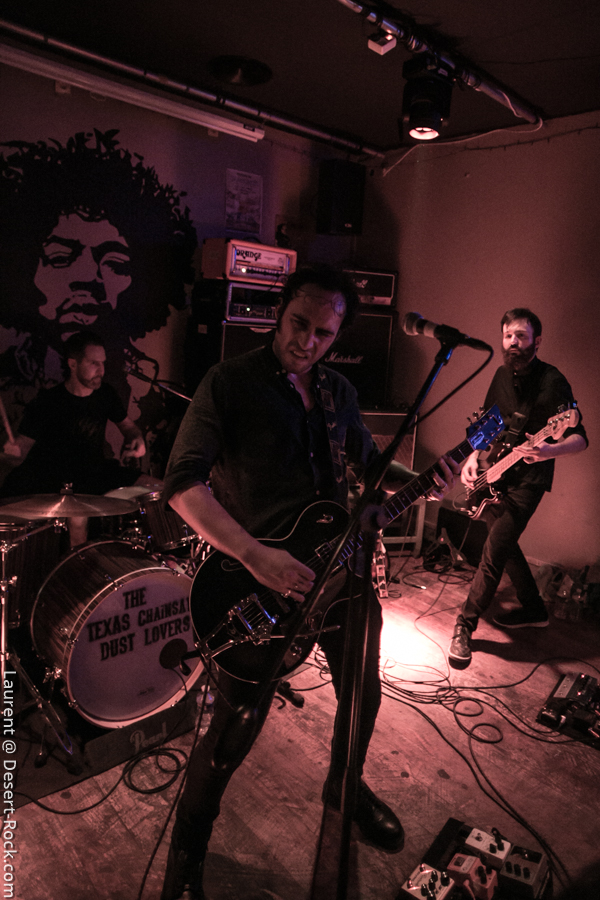 Même pas le temps de siroter une bière que les premiers accords des Texas Chainsaw Dust Lovers retentissent dans l’arrière salle dédiée au concert. Autre ambiance, sur scène (et bim, mise en place d’un éclairage rouge, certes plus « théatral » mais un peu trop ennuyeux à l’usure sur un concert entier) mais aussi dans le public ! Clairement, il y a des amateurs de notre quatuor parigo-nantais ce soir. Et on les comprend ! Les Dust Lovers entament leur set pied au plancher et surprennent très vite par la solidité de leur set : c’est carré, mais pas dans le sens technique ou rigide du terme, car l’interprétation est toujours dans le fun. Les gars se font plaisir et nous font plaisir. Car là dedans, y’a aussi de la compo qui cartonne, comme leur courte discographie en comporte une palanquée (la présence de leur dernier LP, Film Noir, dans notre Top 2017 n’est pas le fruit du hasard).