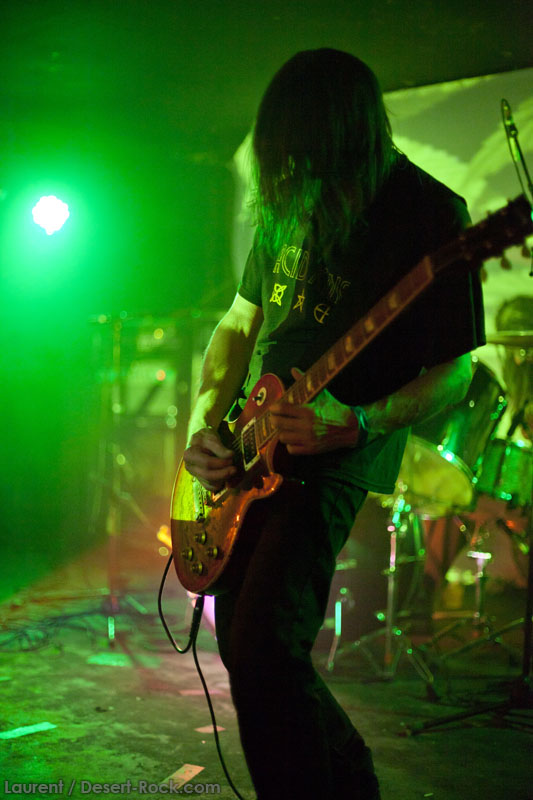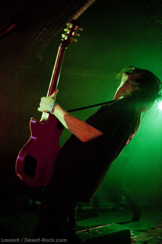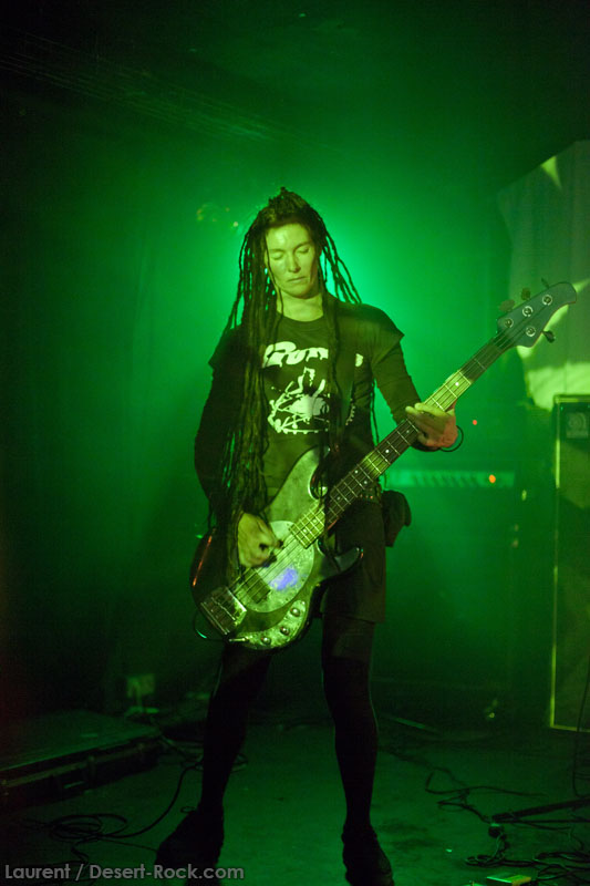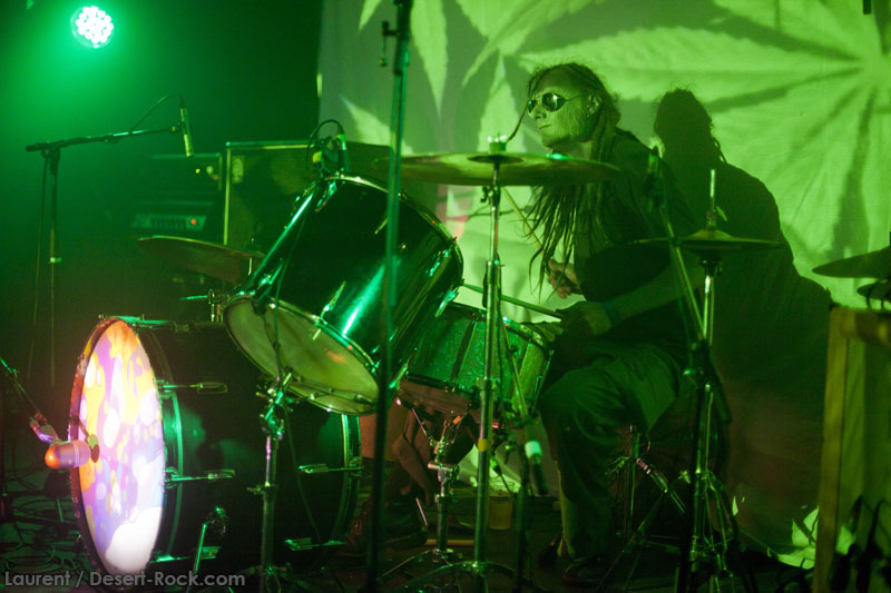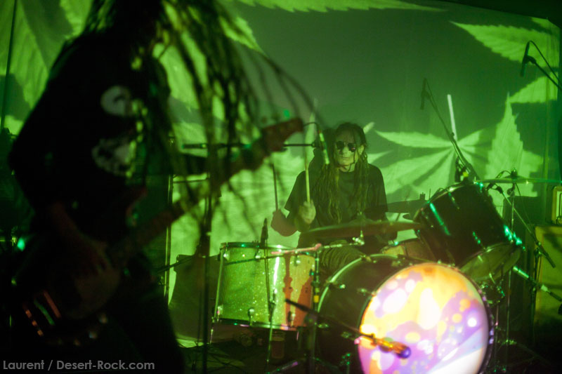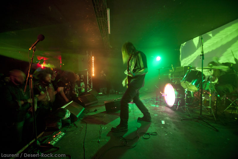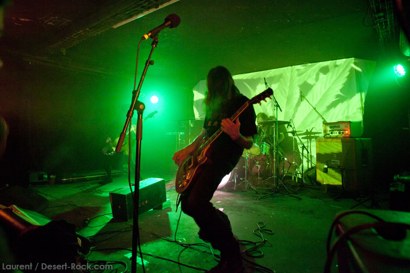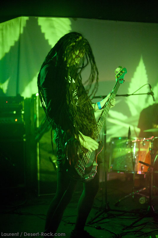 Enfin, Toner Low installe tranquillement son matos, cale sa lampe à lave sur la grosse caisse de Jack, et entame son set dans un ronflement de basse, alors qu’on le croyait encore en plein soundcheck. Les lumières se tamisent (beaucoup !) pour laisser place à un spot verdâtre fixe, et le vidéo projecteur commence à diffuser pendant plus d’une heure de set des feuilles de cannabis en mouvement perpétuel. L’ambiance est dressée et le ton est donné : la soirée sera psyché ou ne sera pas. Le premier riff émerge rapidement du maelstrom sonore et débloque les premières nuques dans le public, qui ne s’arrêteront plus jusqu’à la fin du set. Le doom psyche des hollandais s’installe alors très vite auprès d’un public particulièrement réceptif. Faut dire que Toner Low a roulé sa bosse et son expérience scénique fait son effet : le groupe installe d’abord visuellement une atmosphère propice à la concentration et « l’évasion » du public, grâce à un light show statique et hypnotique, un jeu de scène tout en neutralité (l’introspection est de rigueur) et débite les riffs lancinants non stop pendant une grosse heure. La musique du groupe ne rentre néanmoins pas dans le carcan de la monotonie, et n’a pas la lenteur comme unique registre. Les envolées sont donc nombreuses, les montées en tension régulières et les rythmiques enlevées ne manquent pas. Le public ne s’y trompe d’ailleurs pas, porté par les salves rythmiques et happé par les lignes de basse ronflantes de la belle Miranda et ses immenses dreadlocks ondulant au rythme des basses fréquences… Daan mène le débat à coups de médiators, s’approchant occasionnellement du pied de micro pour émettre quelques râles lointains noyés d’effets, et secoué ponctuellement de spasmes et autres fulgurances guitaristiques, maintenant sous tension un public ravi d’être ainsi immergé dans cette expérience commune. Au bout d’une heure et quelques, le set touche à sa fin (cinq ou six titres ont été joués à ce stade, de mémoire), et le groupe, un peu maladroitement, ne sait pas trop s’il doit quitter la scène ou pas pour un rappel finalement un peu téléphoné mais néanmoins attendu et apprécié. Mieux, passé ce titre, alors que les membres du groupe plient les gaules, Daan, appréciatif des sincères signes de reconnaissance du public, décide de proposer un « vrai » rappel, complètement imprévu (prenant par surprise Miranda, qui, elle, avait déjà quitté la scène). Un geste généreux, apprécié du public, connaisseur.