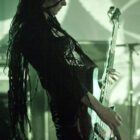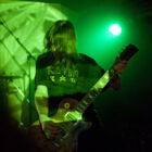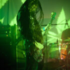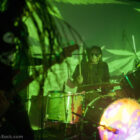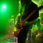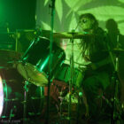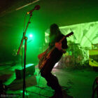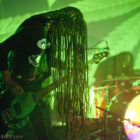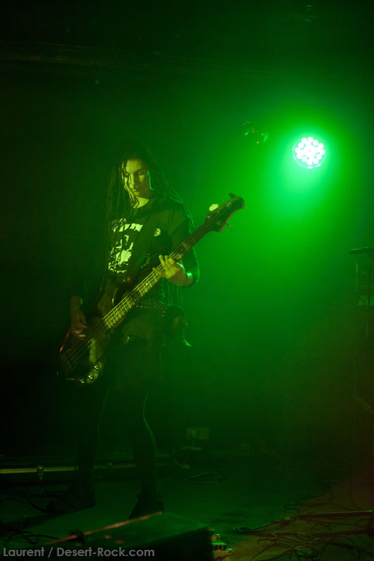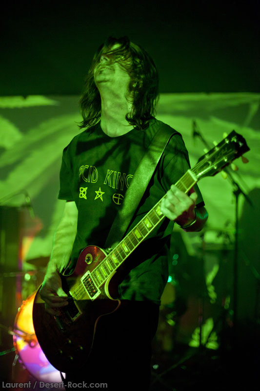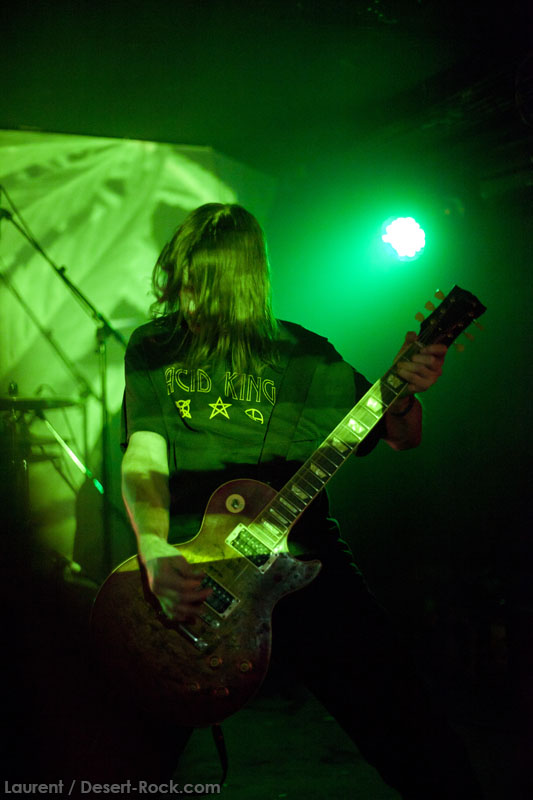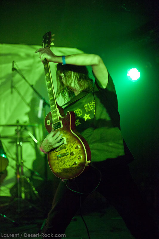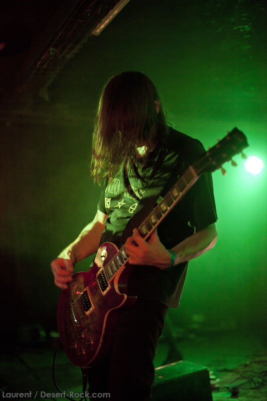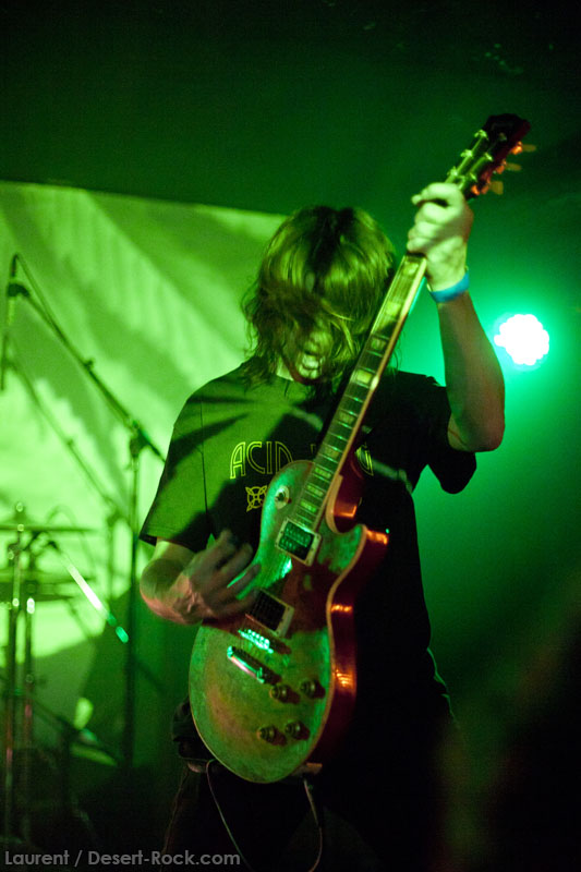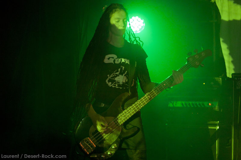 Enfin, Toner Low installe tranquillement son matos, cale sa lampe à lave sur la grosse caisse de Jack, et entame son set dans un ronflement de basse, alors qu’on le croyait encore en plein soundcheck. Les lumières se tamisent (beaucoup !) pour laisser place à un spot verdâtre fixe, et le vidéo projecteur commence à diffuser pendant plus d’une heure de set des feuilles de cannabis en mouvement perpétuel. L’ambiance est dressée et le ton est donné : la soirée sera psyché ou ne sera pas. Le premier riff émerge rapidement du maelstrom sonore et débloque les premières nuques dans le public, qui ne s’arrêteront plus jusqu’à la fin du set. Le doom psyche des hollandais s’installe alors très vite auprès d’un public particulièrement réceptif. Faut dire que Toner Low a roulé sa bosse et son expérience scénique fait son effet : le groupe installe d’abord visuellement une atmosphère propice à la concentration et « l’évasion » du public, grâce à un light show statique et hypnotique, un jeu de scène tout en neutralité (l’introspection est de rigueur) et débite les riffs lancinants non stop pendant une grosse heure. La musique du groupe ne rentre néanmoins pas dans le carcan de la monotonie, et n’a pas la lenteur comme unique registre. Les envolées sont donc nombreuses, les montées en tension régulières et les rythmiques enlevées ne manquent pas. Le public ne s’y trompe d’ailleurs pas, porté par les salves rythmiques et happé par les lignes de basse ronflantes de la belle Miranda et ses immenses dreadlocks ondulant au rythme des basses fréquences… Daan mène le débat à coups de médiators, s’approchant occasionnellement du pied de micro pour émettre quelques râles lointains noyés d’effets, et secoué ponctuellement de spasmes et autres fulgurances guitaristiques, maintenant sous tension un public ravi d’être ainsi immergé dans cette expérience commune. Au bout d’une heure et quelques, le set touche à sa fin (cinq ou six titres ont été joués à ce stade, de mémoire), et le groupe, un peu maladroitement, ne sait pas trop s’il doit quitter la scène ou pas pour un rappel finalement un peu téléphoné mais néanmoins attendu et apprécié. Mieux, passé ce titre, alors que les membres du groupe plient les gaules, Daan, appréciatif des sincères signes de reconnaissance du public, décide de proposer un « vrai » rappel, complètement imprévu (prenant par surprise Miranda, qui, elle, avait déjà quitté la scène). Un geste généreux, apprécié du public, connaisseur.
