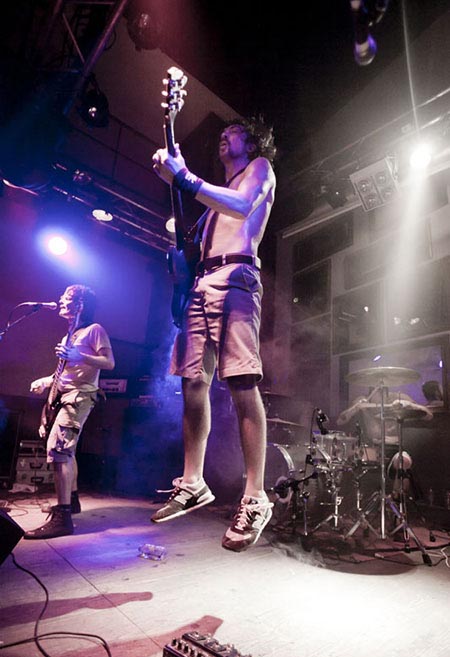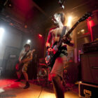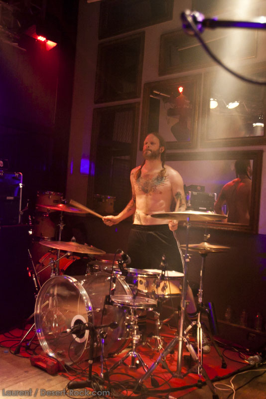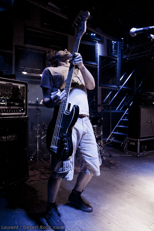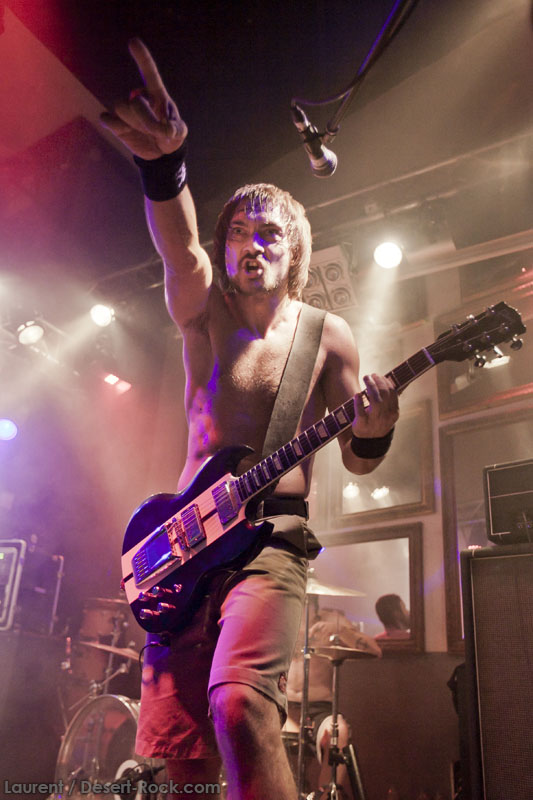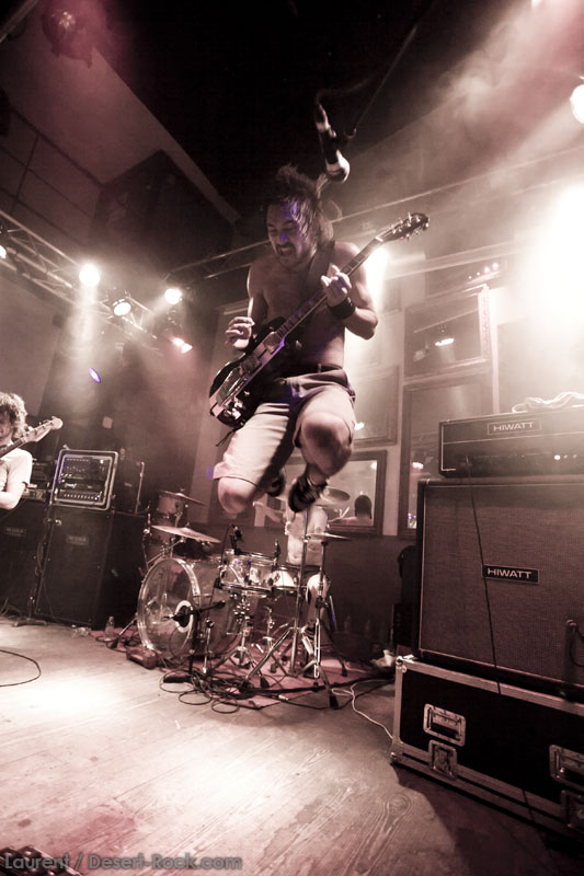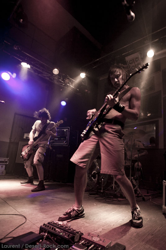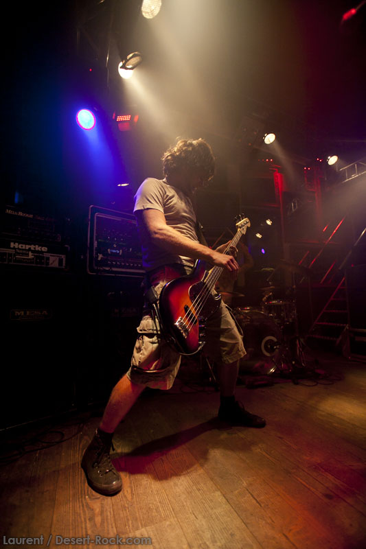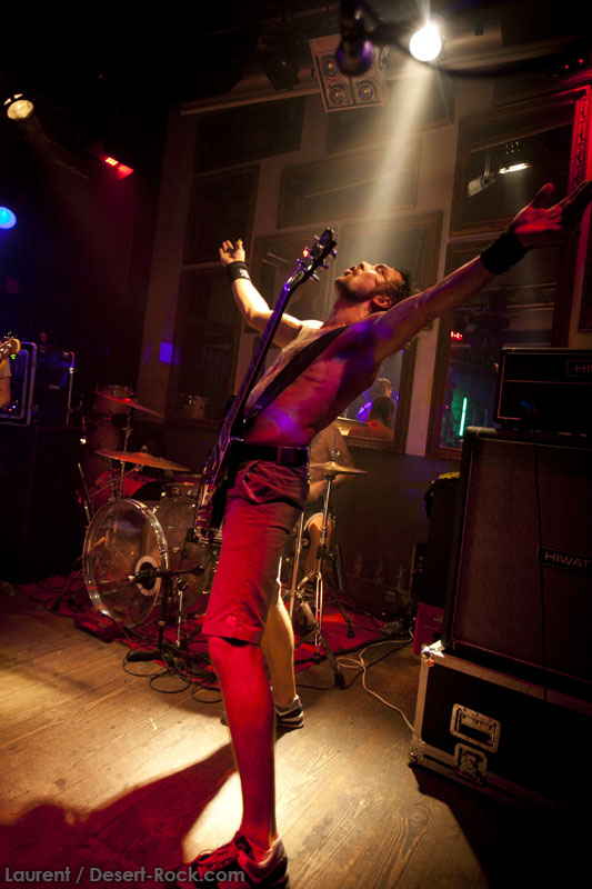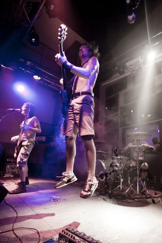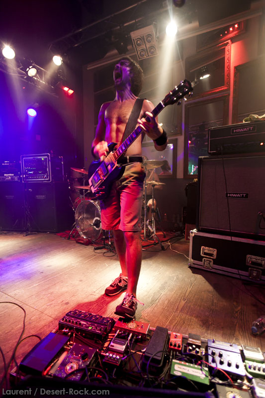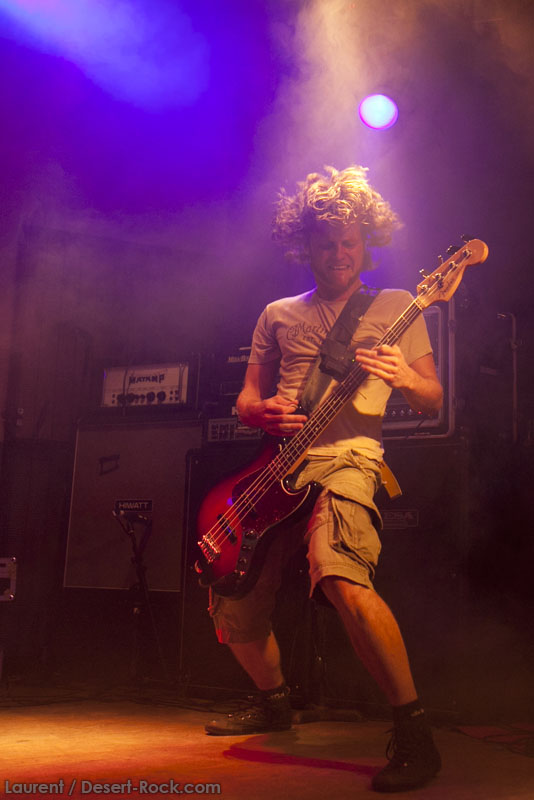 Il est temps pour Truckfighters de monter sur scène. Et alors que retentissent les premiers accords de « Desert Cruiser » et son gros riff fuzzé, on comprend qu’on va probablement prendre une grosse claque. Ozo à la basse tient bien la baraque, il assure non seulement des vocaux puissants mais aussi des grosses lignes de basse, rondes, saturées et percutantes juste comme il faut. Mais comme d’hab, les yeux s’orientent inévitablement vers Dango et sa gratte : comme possédé, le guitariste à l’allure improbable (un bonhomme un peu dégingandé, grand et mince, torse nu en shorts et une paire de tennis toutes pourries) saute dans tous les sens tel un pois sauteur, écrase son immense rack de pédales d’effets à toutes occasions, virevolte, harangue le public. Un beau duo en effet ! La set list est impeccable, le groupe enchaînant sur le très catchy « Traffic » puis « Last Curfew », des titres comportant des passages plus calmes, bien retranscrits en live, à l’image de l »épique « Chameleon » qui fait son apparition un peu plus tard. Pas difficile dans une discographie à la cohérence implacable de faire ses courses. Du coup, le groupe se permet même le luxe de faire une incartade dans ses productions plus « rares » (« Helium 28 » issu d’un split album avec Firestone).
