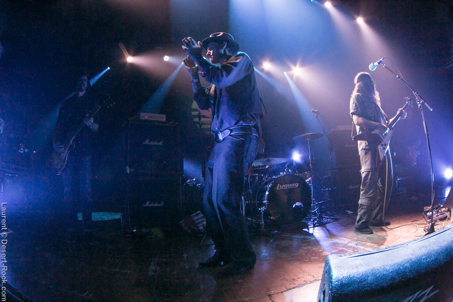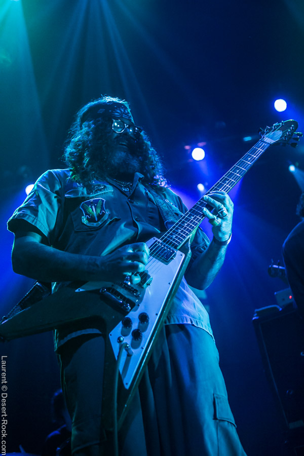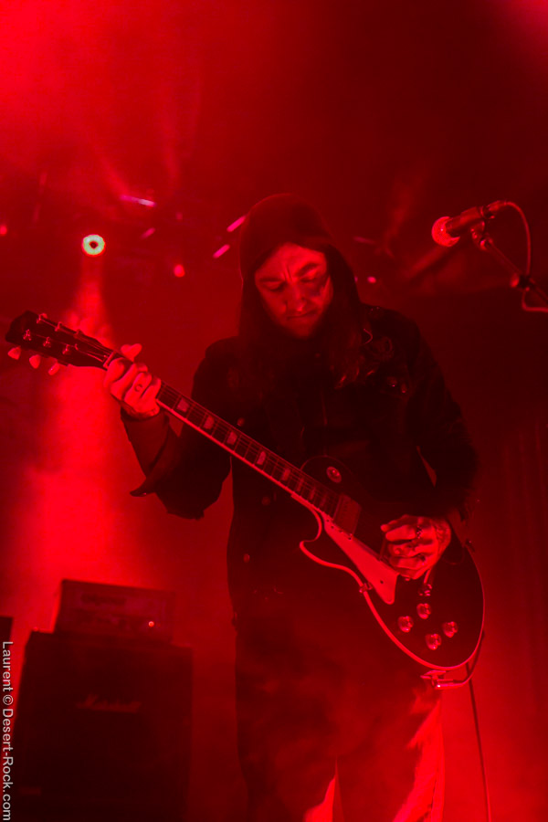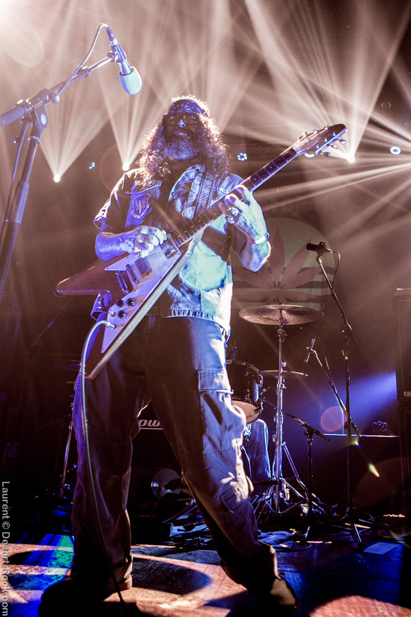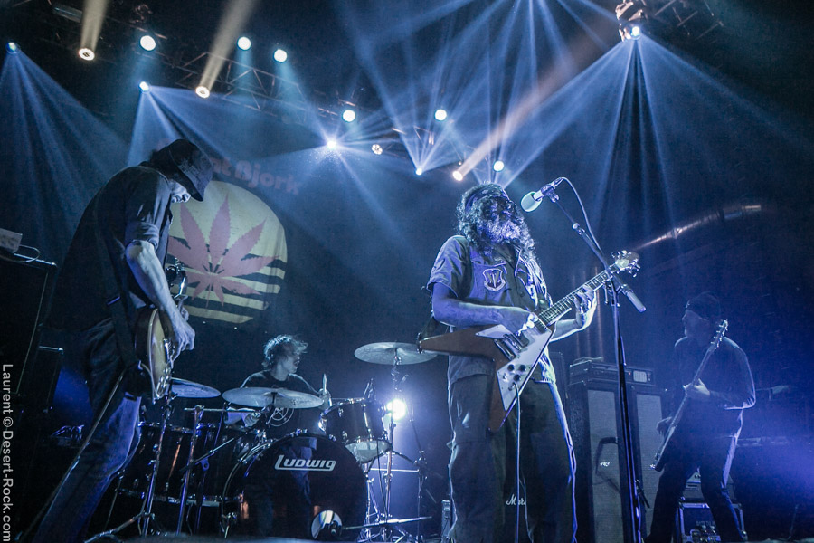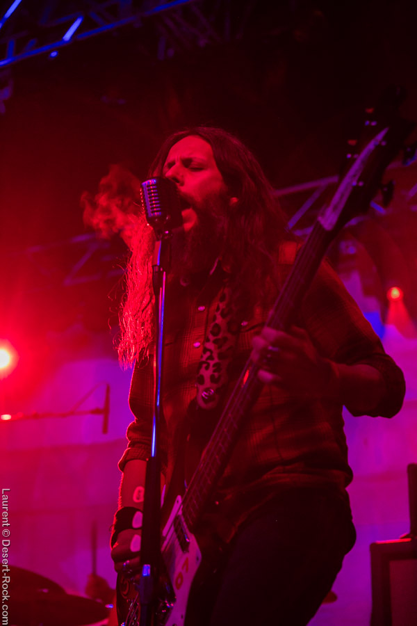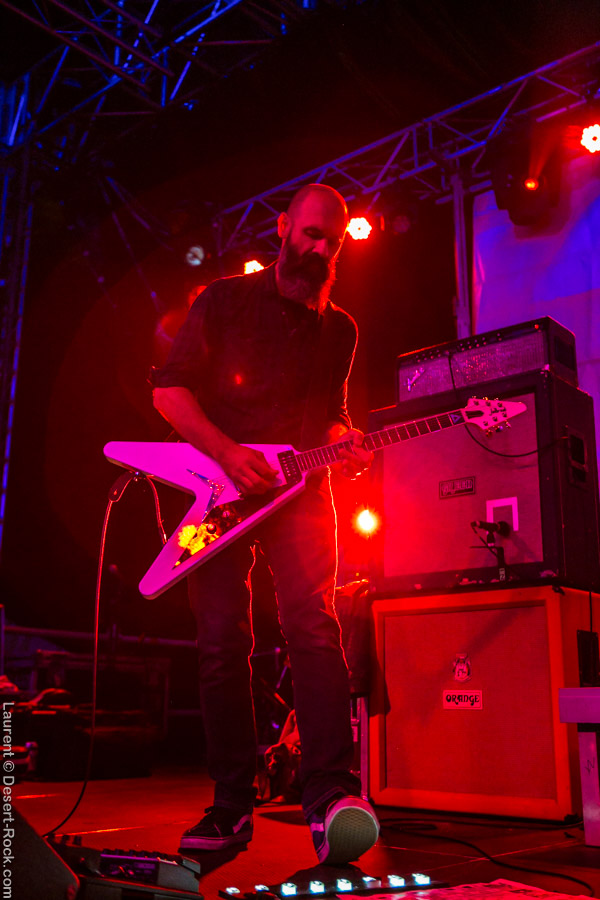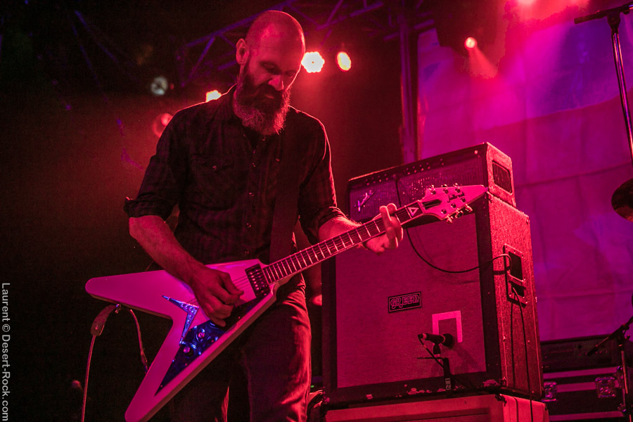 Après ce set du grand frisé du désert, une autre figure emblématique du genre se prépare à se lancer dans la bataille : le trio transalpin Ufomammut se prépare tandis que le public termine sa translation vers la seconde scène. Sans projection vidéo, le set se basera sur la musique du groupe uniquement, et c’est finalement tout ce qui compte. On a digéré pas mal de contrastes musicaux assez violents aujourd’hui en passant d’un groupe à l’autre, grâce à une affiche riche et variée ; mais le contraste entre le chantre du desert rock US et les doomeux européens va s’avérer dur à encaisser pour les cortex les plus fragiles. Car Ufomammut, encore une fois, n’est pas venu pour faire dans la dentelle. Ça commence très fort et la tension reste au point fort sur tout leur set. Baignant dans un light show rougeâtre plutôt apathique (mais rien d’inédit ici chez Ufomammut) les trois musiciens s’engagent sur un set qui défrisera une part de l’assistance par son audace : voilà que nos bonhommes commencent leur prestation en se lançant dans l’interprétation par le menu de leur dernière galette, sortie il y a quelques jours à peine ! Audacieux ! Sacrée confiance en soi et en la qualité de ce (remarquable, il est vrai) disque. En conséquence, le public est un peu pris à froid au début, mais les nuques se réchauffent très très vite, et dès le premier quart du set, le headbanging-yeux fermés-sourcils froncés-mâchoire serrée devient le sport le plus pratiqué entre le premier rang et la table de mixage. Et l’art d’Ufomammut prend toute son ampleur dans cette nouvelle performance, envoûtant un public rapidement consentant à l’aide de ses riffs-pachydermes poussés ad libitum tendance hypnose lancinante, enchaînés par des breaks en forme de virages bienveillants pour amener les spectateurs jusqu’à la fin d’un set encore une fois impeccable. Classieux, en contrôle, efficace, Ufomammut tient une forme depuis plusieurs mois qui impressionne.