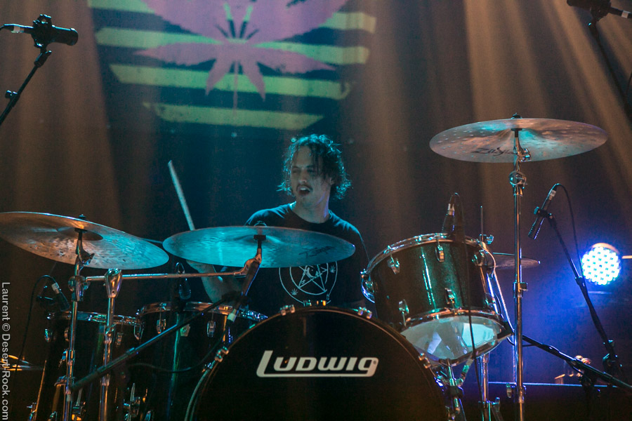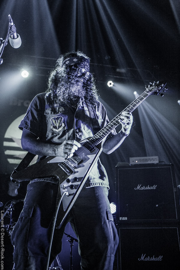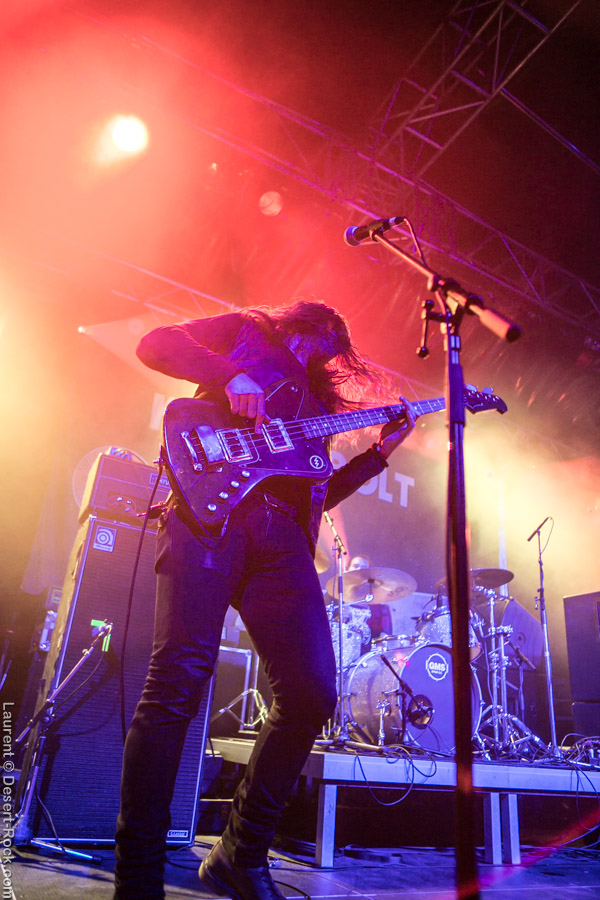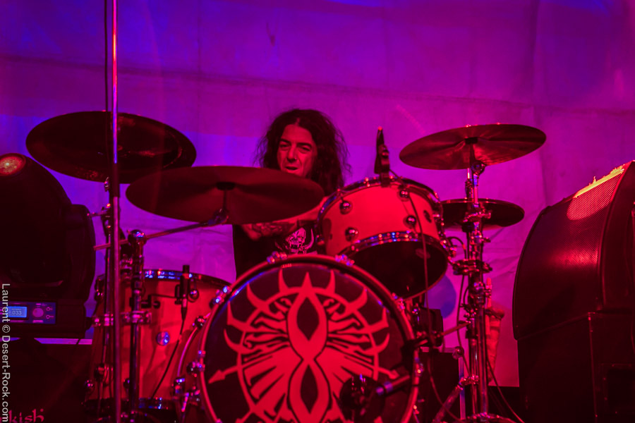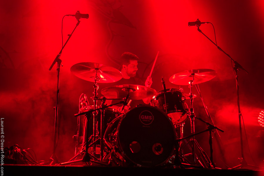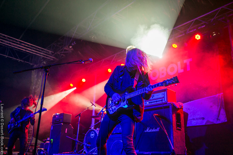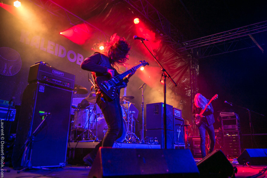 Un tantinet groggys après le passage du rouleau-compresseur étasunien, nous regagnons la petite scène pour assister à la prestation du trio finlandais qui nous avait déjà fait forte impression sur scène par le passé. Hyper en place et en pleine campagne européenne, ces vikings se secouent la tignasse pour un set hard rock qui fleure bon les années quatre-vingt ! Que l’on soit fan ou pas de ce genre quelque peu daté, il faut concéder au groupe d’Helsinki qu’il touche sacrément sa bille et qu’à part si l’on a les conduits auditifs carrément obstrués par de la fiente de pigeon, il est difficile de réfréner des mouvements de nuques tant leur énergique prestation du jour, soignée aux petit oignons, est communicative. Compliqué pour eux de passer à côté des gros gimmicks du genre : soli de guitare et solo de batterie, mais c’est pour la bonne cause (celle de faire remuer nos flasques popotins) et ça plait visiblement aux spectateurs. Plutôt pugnace, leur set gagne en puissance au fur et à mesure qu’il se déroule. Un titre encore inédit sur disque vient se placer en avant dernière position et c’est devant un public acquis à sa cause que les Finlandais mettent un terme à une prestation qui aura mis tout le monde d’accord que l’on soit amateur de grosse sensation d’obédience bourrine ou nostalgiques des années soixante-dix (ou septante c’est comme vous la sentez !). Mission accomplie avec brio pour Kaleidobolt dont on attend avec impatience la prochaine plaque.