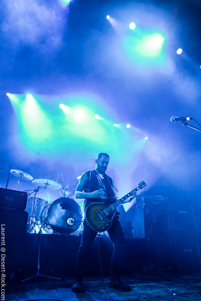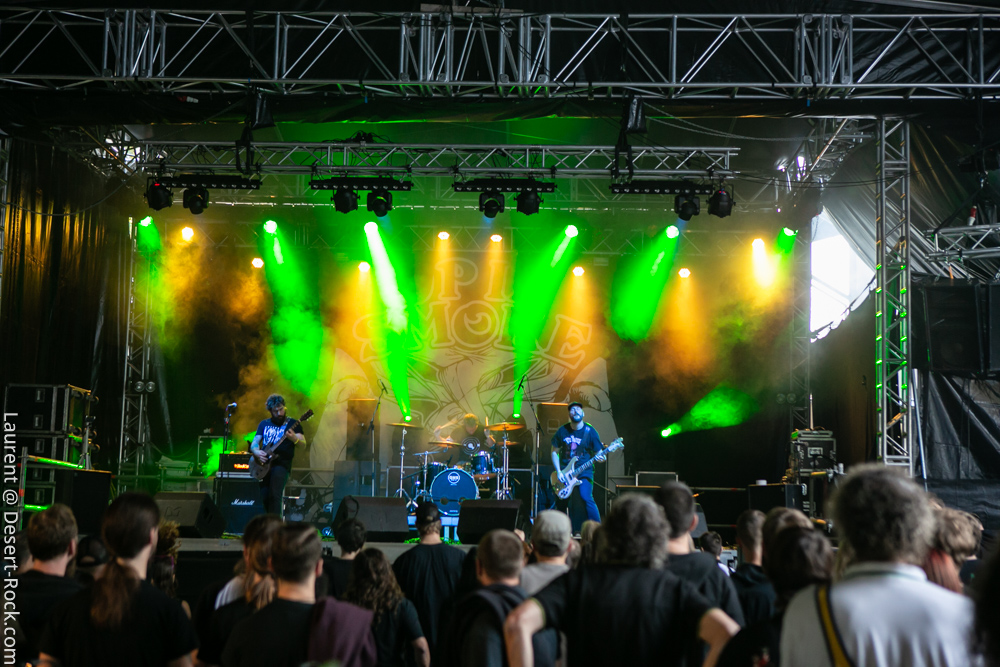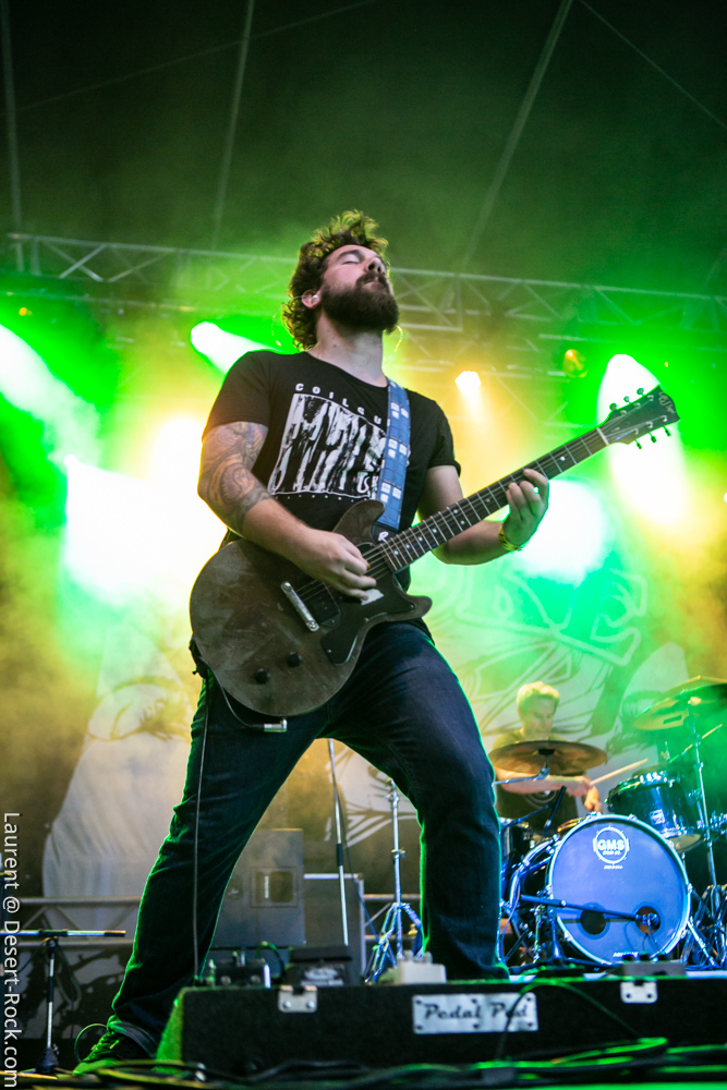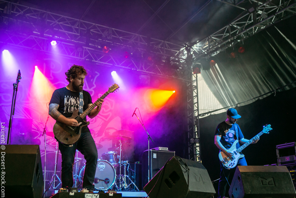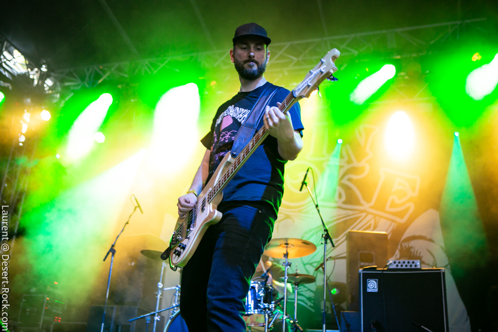 Alors que les rayons de l’astre solaire baignaient encore la banlieue bâloise, la formation suisse ouvrait brillamment les hostilités peu après l’ouverture des portes. Ils ont d’entrée de jeu positionné la manifestation à un niveau élevé, ont profité de l’occasion pour capter de nouveaux fans et ont foutu une bonne branlée à un public fort nombreux à l’heure de l’apéro. Le groupe de Genève représentait le volet local de la programmation même si son lac est à plusieurs centaines de bornes de la zone industrielle de Pratteln. Nous avions déjà eu le plaisir de voir le batteur du trio en ces lieux lors d’une édition précédente avec l’incroyable groupe Intercostal (qui s’est malheureusement terminé tragiquement). Ce véritable métronome, flanqué de ses acolytes à la basse ainsi qu’à la guitare, a envoyé du bois durant 40 minutes intenses qui virent la foule se presser devant la nouvelle structure extérieure du festival (et délaisser les bars d’ordinaire fort courus à ces heures voire même tout du long de l’événement). Au passage, nous notons avec satisfaction que la plus petite des deux scènes a été brillamment réorientée et rehaussée afin de pouvoir permettre à une audience plus nombreuse d’assister confortablement aux shows (le seul bémol sera la hauteur de la scène pour certains photographes de petite taille). Pour en revenir à Six Months Of Sun : ces garçons actifs dans un registre instrumental pas si éloigné que ça des Karma To Burn des temps jadis ont aligné leurs titres avec vigueur. Quelques samples de dialogues du cinéma pour épicuriens (mention spéciale aux chips), leur ont permis de reprendre leur souffle entre chacun des morceaux. Nous avons pris un putain de plaisir d’entrée de festival et vous incitons fortement à aller poser vos oreilles sur les deux LP commis par ces helvètes (dont le fantastique « Below The Eternal Sky » sorti l’an dernier).