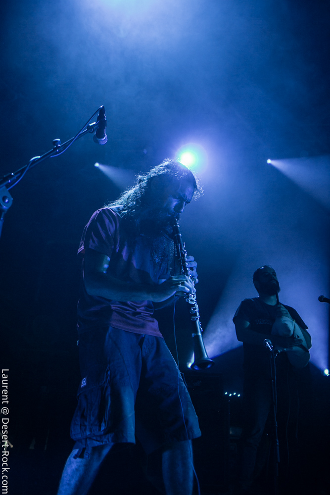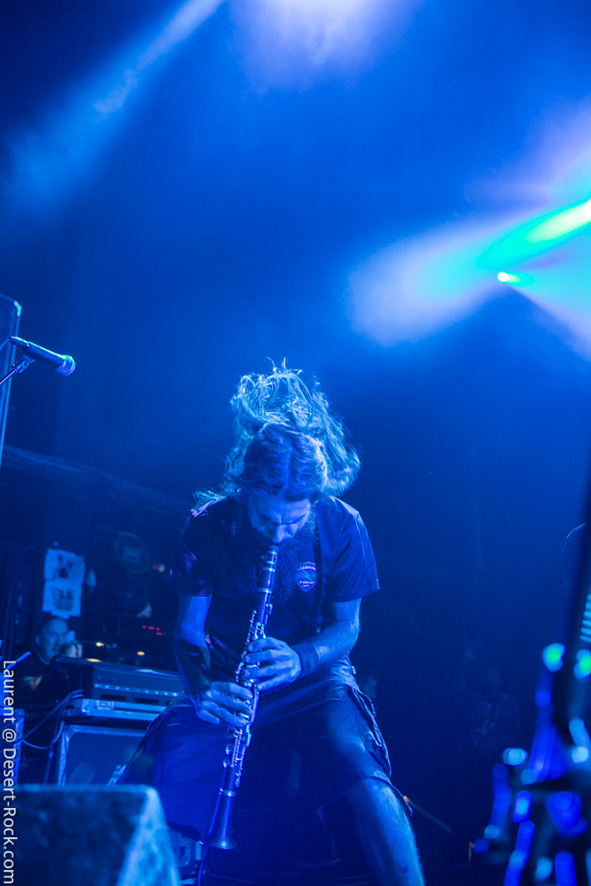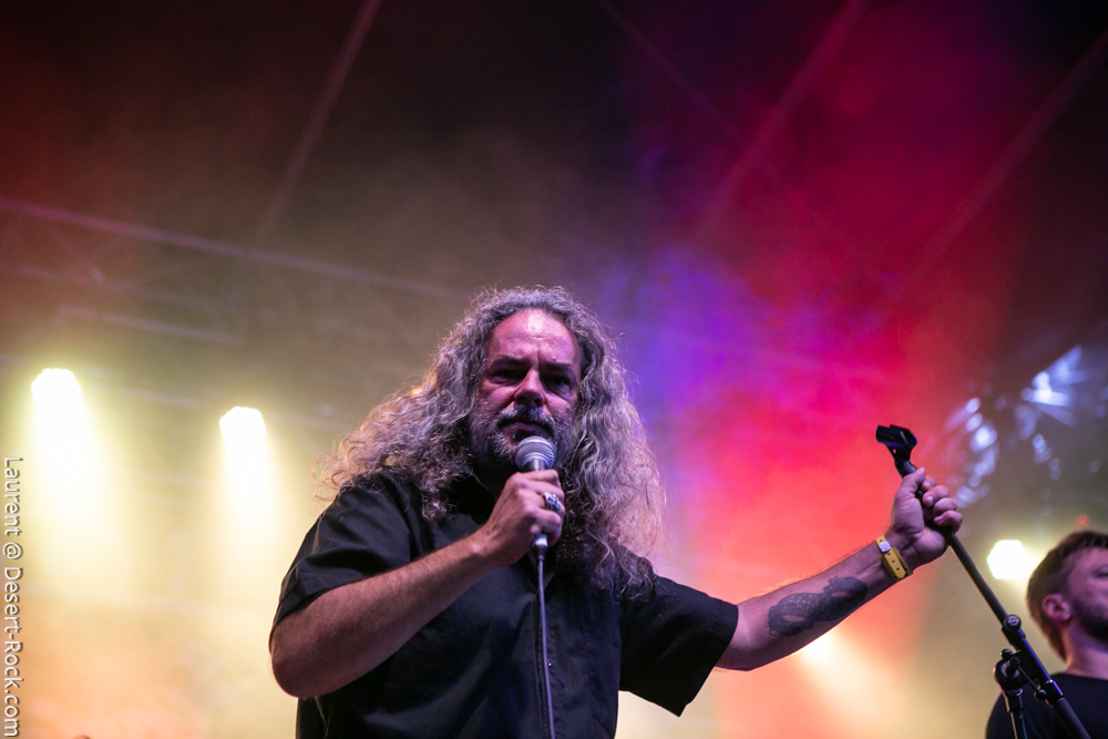 On se présente en soirée devant la main stage avec l’idée d’observer l’intrus de la soirée : comment un groupe aussi discret que V.I.C. se retrouve aussi haut sur l’affiche, au vu de la qualité de ceux qui l’ont précédé ? Il ne faut pas plus de quelques minutes pour comprendre qu’on n’a pas affaire à des perdreaux de l’année. Musicalement, le quintette repose sur une structure instrumentale en trio classique, déroulant un heavy rock fuzzé solide et nerveux, chargé de plans psyche qui ne tombent jamais dans le trip lourdaud et lancinant. Spécificité du combo, les deux autres musiciens proposent des plans d’instruments plus atypiques (clarinette, didjeridoo, cornemuse…) qui apportent des arrangements franchement inédits et rafraîchissants. La dynamique globale du set est excellente, bien emmenée par le charismatique mais jamais exubérant frontman Alex, et le public, qui remplit bien la grande salle, prend son pied. Il faut croire que la Grèce devient l’un des meilleurs fournisseurs de groupes qualitatifs d’Europe.