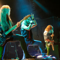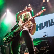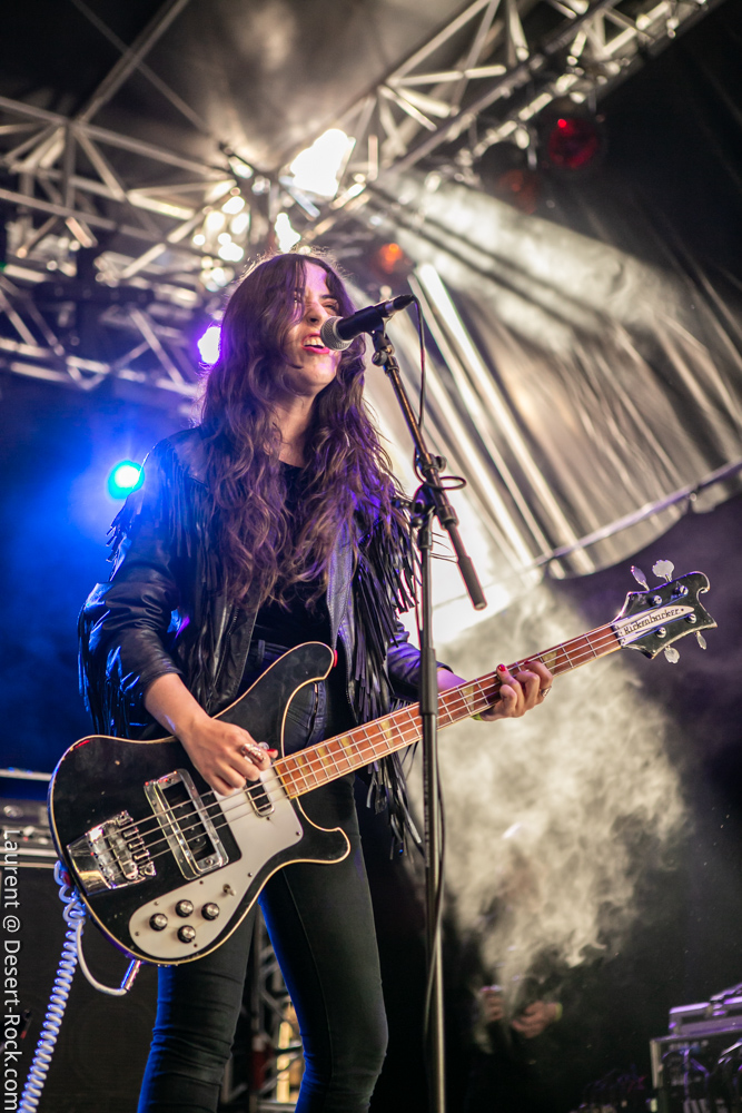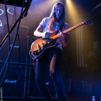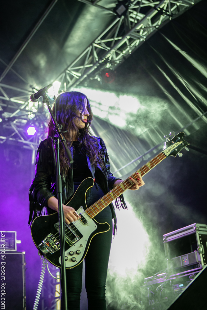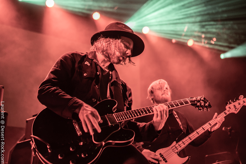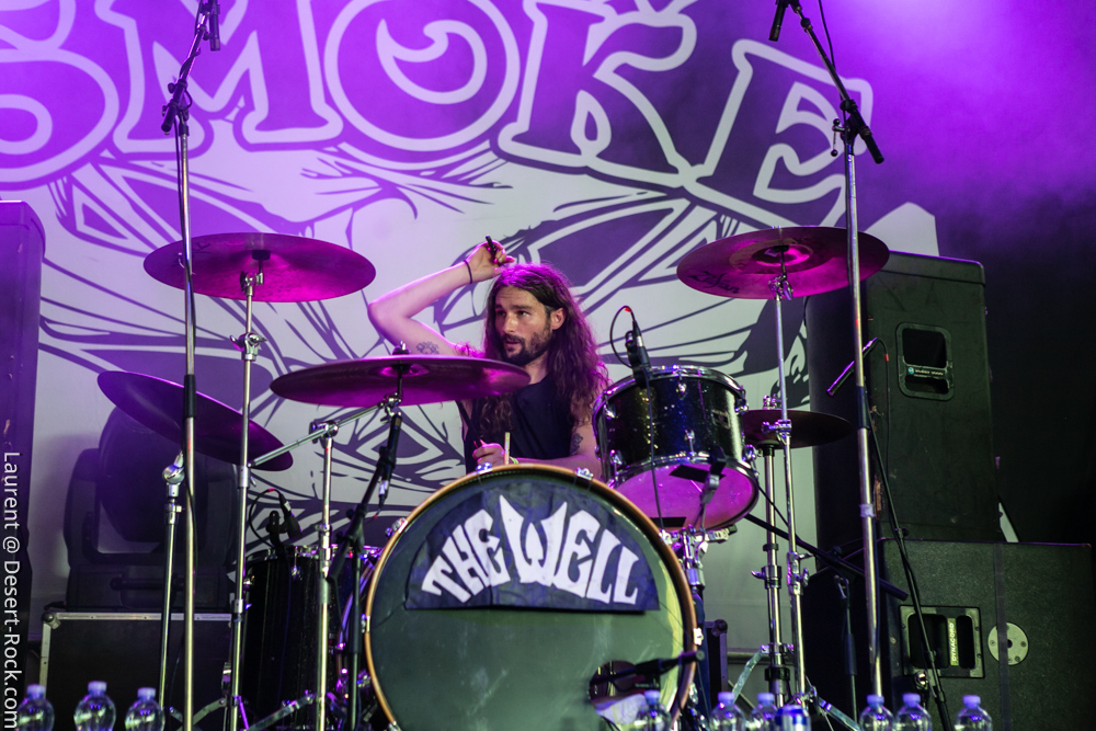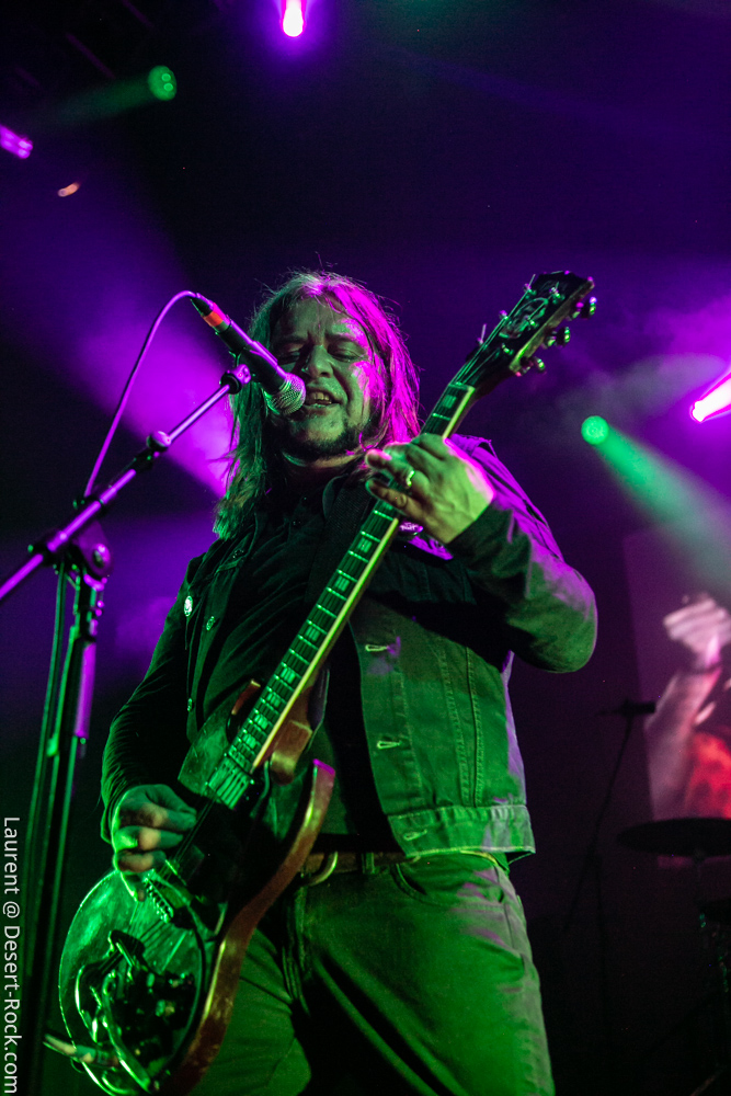 On a bien usé les deux excellentes galettes de The Well et on ne cache pas notre enthousiasme d’enfin voir le trio texan sur les planches, où il se fait trop rare (en tout cas sur le Vieux Continent). Il n’y a pas besoin de plus de 3 ou 4 accords pour nous rassurer quant à la qualité d’interprétation et à l’énergie développée sur scène. A croire que c’est dans leurs ADN (il doit y avoir un sacré paquet de trucs chimiques dans leur lait, faut dire), les combos texans ont généralement ce « truc en plus », cette dynamique singulière et souvent débridée, cette assurance qui en fait de terribles machines de scène (cf. Duel, Dixie Witch, Mothership, Honky, Wo fat…). The Well confirme l’appartenance à cette lignée tout en proposant un heavy rock plus nuancé et moins nerveux : piochant dans des influences clairement old school, une main côté heavy doom US, l’autre main dans le proto-heavy rock 70s, le groupe propose une mixture aiguisée et emballante qui semble ravir le public. Scéniquement, le trio est impeccable, sans surjouer, en pleine capacité d’embarquer un public : Lisa assure peinard une rythmique galopante à grands coups de Rickenbacker et des lignes vocales impeccables, parfois aidée par Ian Graham, entre deux poignées de riffs cinglants et de soli réjouissants. On notera l’insertion de quelques samples ici ou là qui permettent de densifier les compos du trio (dans certains cas ces ajouts en live sont un peu foutraques, reconnaissons-le). Et ca déroule ainsi pendant 45 minutes qu’on ne voit pas passer, devant un public bien tassé qui lui aussi semble prendre son pied (en particulier les deux gros blaireaux hilares au premier rang et tout à fait confiants dans leur pouvoir comique qui se lanceront leur peluche requin pendant une bonne partie du set…).