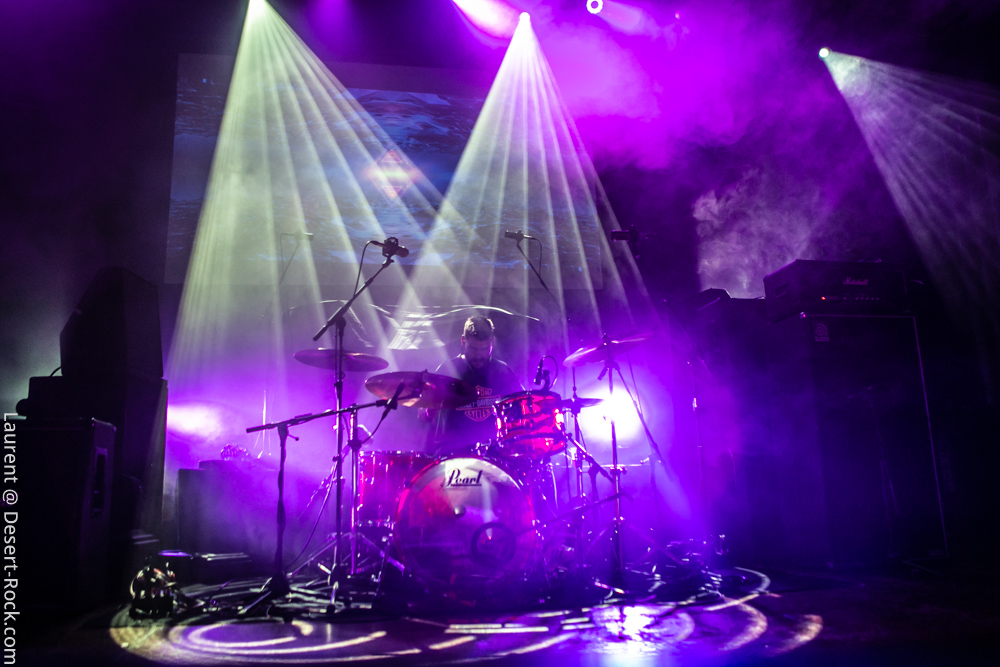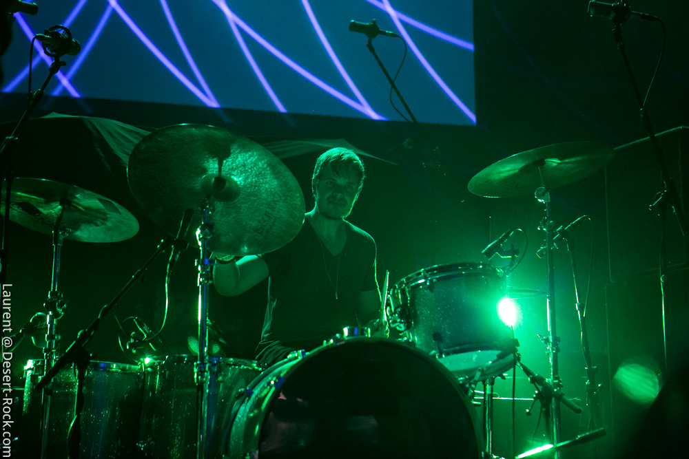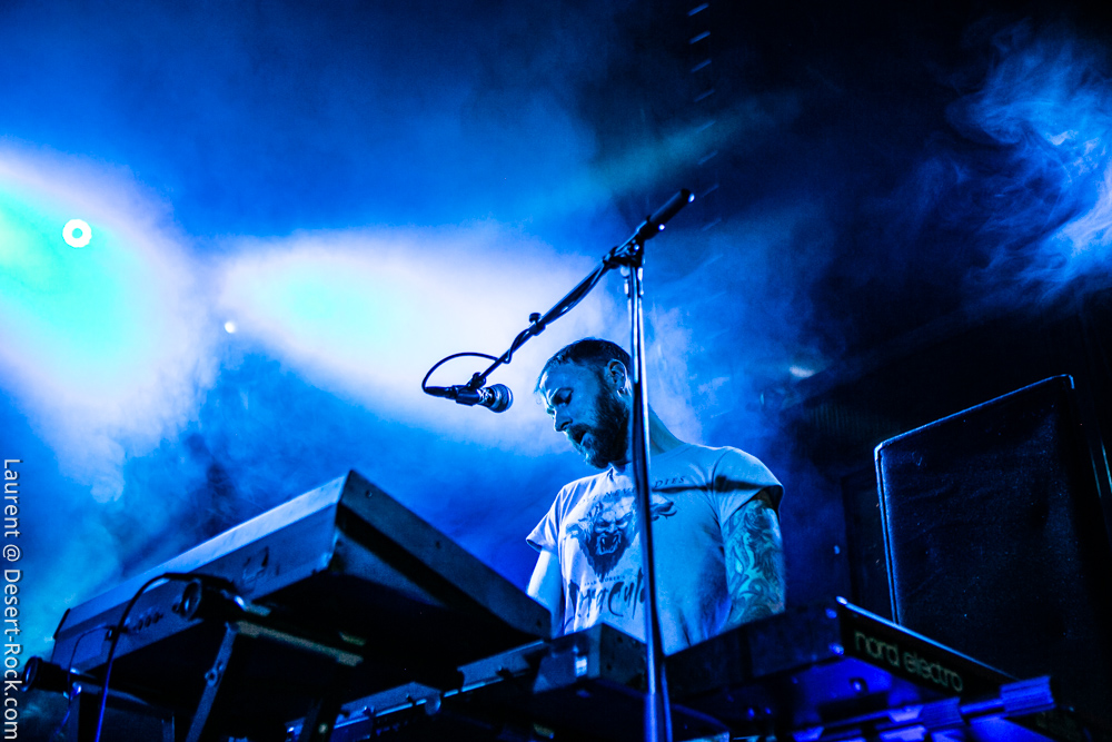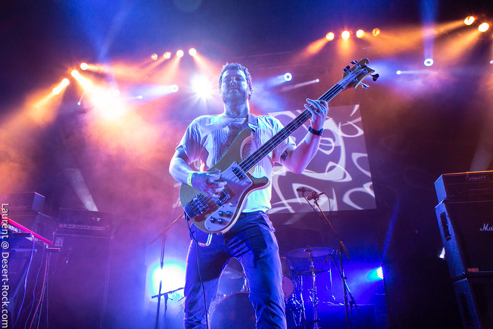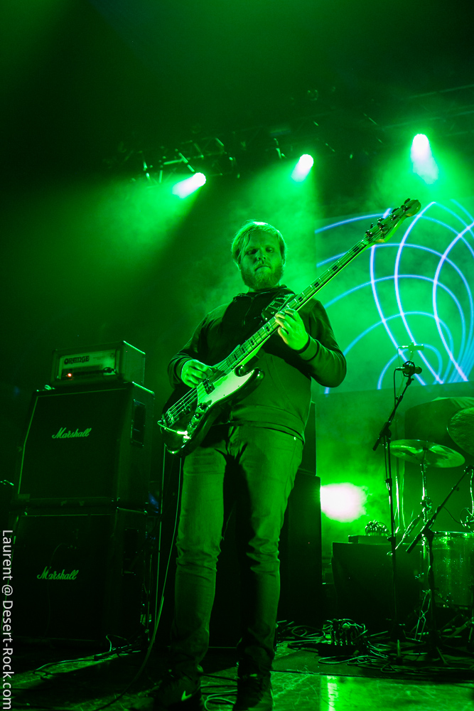 On a beau apprécier la discographie du trio grec, on sait aussi, tandis qu’on se dirige vers la main stage, que les groupes évoluant dans ce style musical jouent sur la corde raide, en équilibre précaire entre immersion trippante enthousiasmante et set ennuyeux et laborieux étiré en longueur via des pseudos jams mal inspirés. Vos serviteurs n’ayant jamais eu l’occasion de capter le groupe sur les planches auparavant, nous voyons nos doutes balayés au bout de quelques minutes, devant le simple constat d’une sorte de vague bienheureuse qui se déploie dans le public, qui ondule béatement pendant trois beaux quarts d’heure. Les trois jeunes musiciens, baignant dans un light show très bien étudié, déploient tranquillement un savoir faire remarquable, fait d’un talent d’interprétation inattaquable, et d’une inspiration dans les compos qui fait toute la puissance du set : basculant de passages psyche à des plans plus lourds, parfois chargés en grosses doses d’un space rock classieux, le groupe prend son public par le col et ne le lâche plus. Les quelques interventions sympathiques de John Vagenas ne viennent jamais complètement rompre l’enchantement des titres, parmi lesquels le groupe nous propose un avant goût de son prochain album à travers un morceau inédit. On ressort de cette expérience avec la farouche conviction qu’un nouveau grand groupe est en train d’émerger dans ce genre musical exigeant.