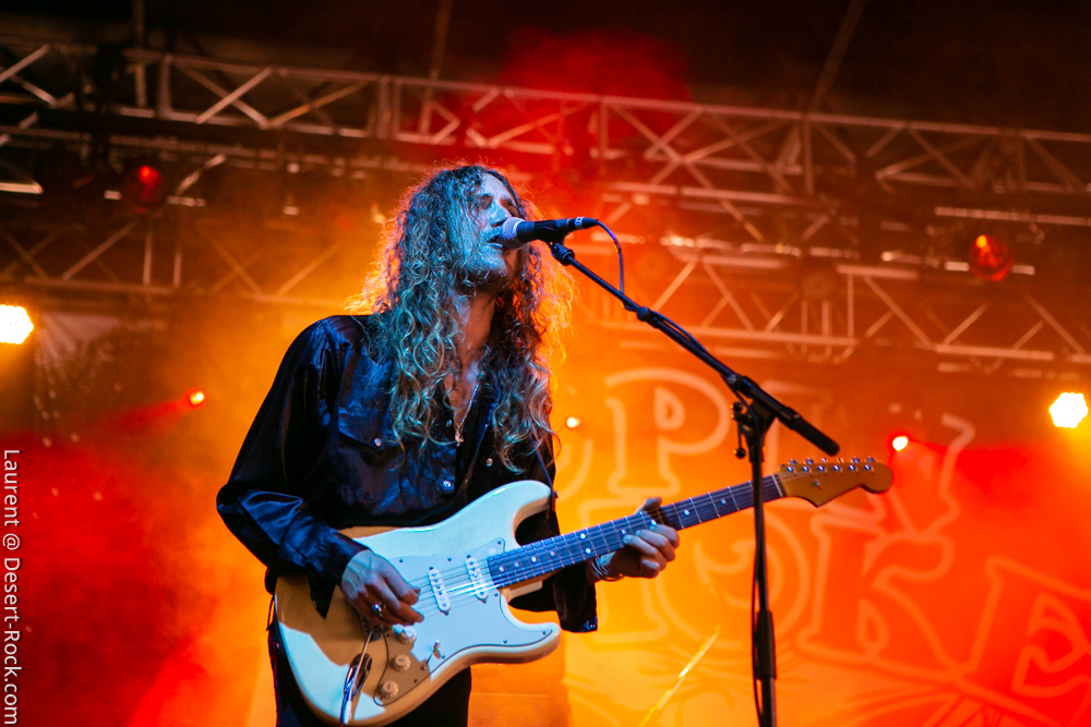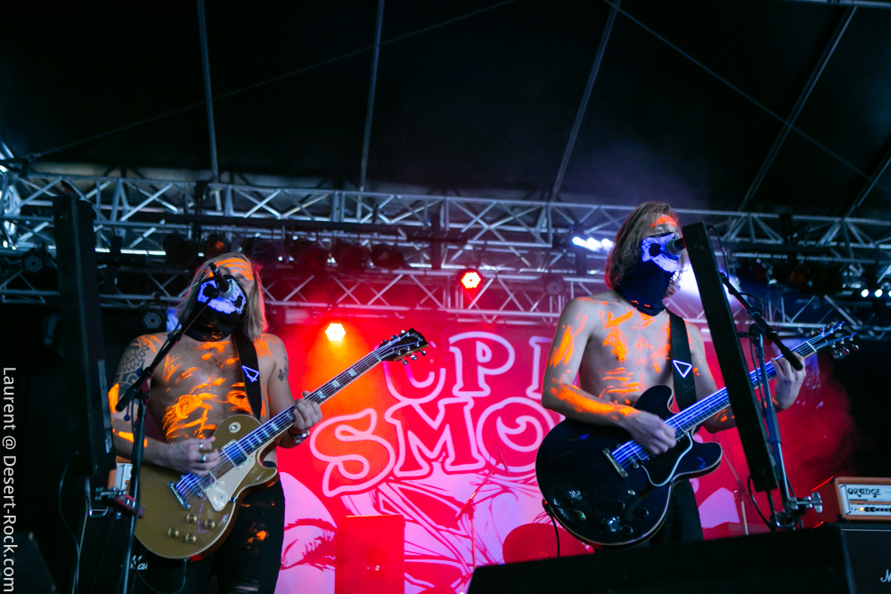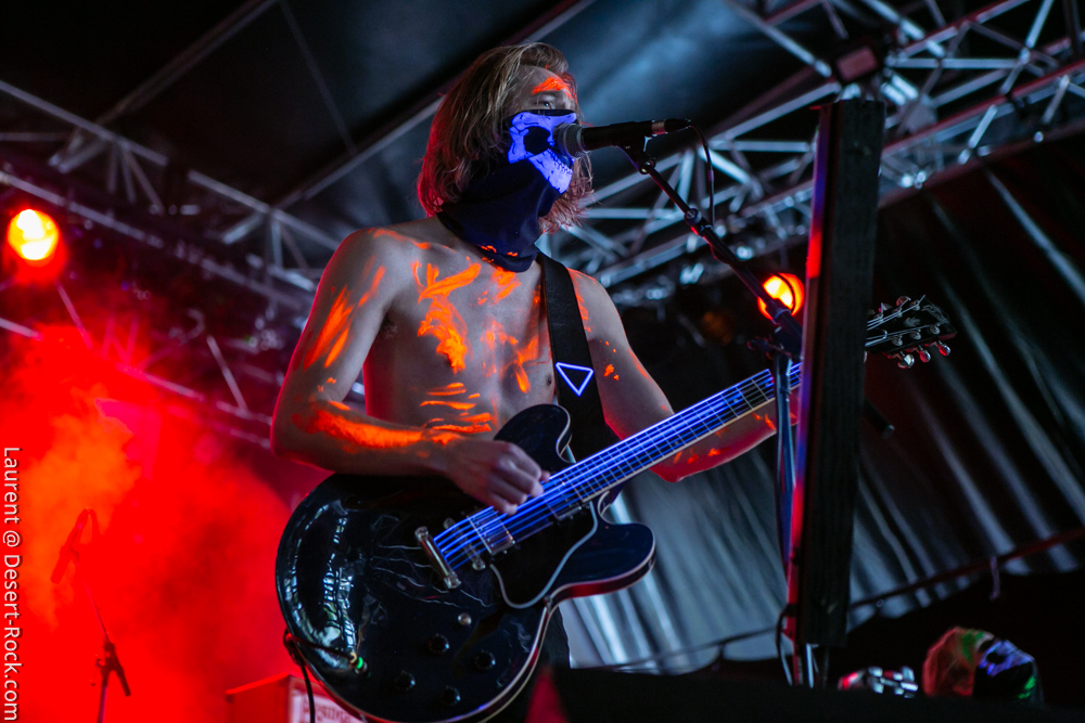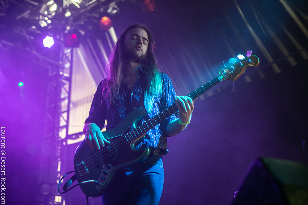 Le moins que l’on puisse dire c’est que durant cette journée, on aura passé agréablement d’un style à l’autre et que, entre nous, on y aura trouvé notre compte la plupart du temps. Avec le style très progressif du quatuor californien, nous nous sommes lovés dans un cocon aérien baigné de volutes bleutées ; le quatuor de la Cité des Anges a dû user les productions de David Gilmour ainsi que celles de Roger Waters jusqu’à la corde pour en extraire ses influences principales. Un peu à la rencontre d’Earthless et de Monkey 3, les Américains déploient des titres qui s’étalent dans la durée en empruntant tous à un moment ou à un autre un chemin intimiste qui était souligné par l’impassibilité de ses membres ainsi que par un jeu de lumière résolument sombre (les photographes de l’assistance ont apprécié). Cette prestation planante (et parfois pompier) de quarante minutes a trouvé son public elle aussi même si vos deux serviteurs n’ont pas réellement été transcendés par le combo de Los Angeles qui demeure toutefois des plus intéressants sur disque. Leur set aura eu le mérite d’explorer un style assez en retrait de la programmation 2018 du Up In Smoke de cette année, mais clairement pas hors sujet pour les festivaliers. Au rayon rencontre du troisième type, quatre autres types allaient eux aussi nous emmener hors du cadre sur la scène extérieure, et nous avions hâte d’aller jeter un coup d’œil sur la suite des festivités.
