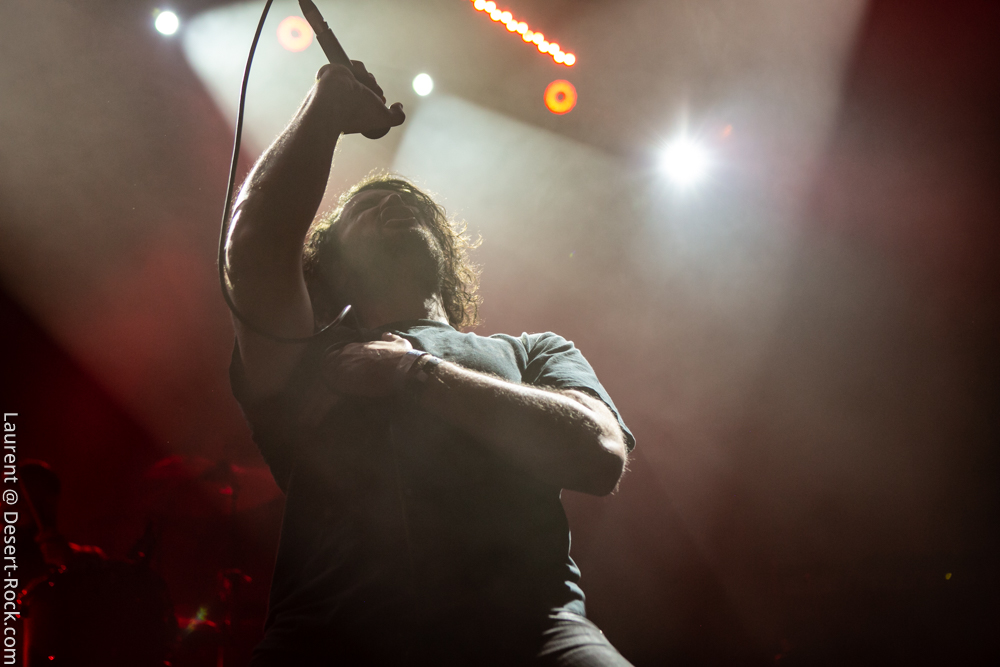 Puisqu’on parle de beaux morceaux, et sans jeu de mot foireux, les gaillards de Lo-Pan montent sur la side stage… Mâchoires serrées, mise en place immédiate, les ricains ne sont pas venus là pour louvoyer. Ça commence par le super-catchy groove de basse de « Sage », et ça ne s’arrête plus pendant trois quarts d’heure. Ce ne sera d’ailleurs pas le seul extrait du dernier album du groupe, dans lequel ils piocheront l’essentiel du set du jour – pas de motif de plainte à l’horizon, il est excellent (et il rend bien en live). Les fans les plus anciens regretteront néanmoins que la pourtant qualitative discographie du groupe ne soit pas mieux représentée… Mais abandonnons immédiatement toute perspective de déception, Lo-Pan sur scène c’est une machine à l’efficacité remarquable : un bassiste solide et nerveux, un batteur hargneux et puissant, un guitariste taciturne mais redoutable, et bien sûr l’imposant Jeff Martin, vocaliste au registre atypique, aussi mélodique que puissant. On était habitués à le retrouver plus discret, parfois en fond de scène sur tout le concert, on le retrouve aujourd’hui aux côtés de ses collègues, assuré, à l’aise dans la communication avec le public et dans son rôle désormais assumé de frontman. Du coup le kif est total, et le concert se termine trop tôt à notre goût, on en aurait bien repris un peu…