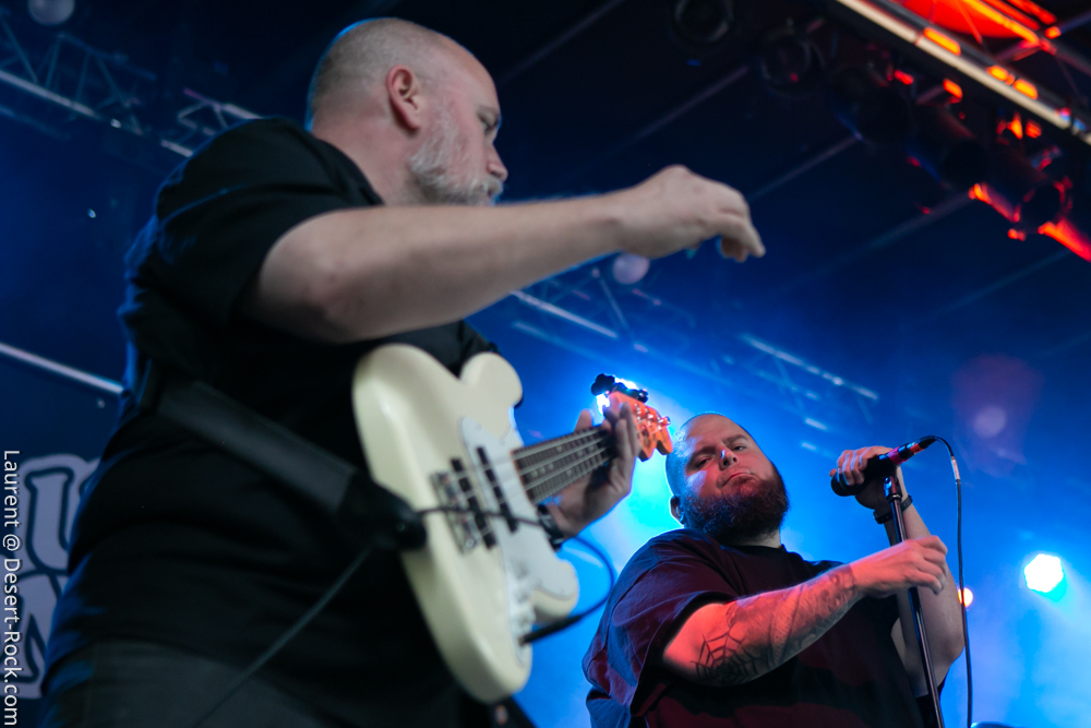 Ah, là, voilà un groupe pour lequel on ne pourra pas avancer qu’il est très présent sur les routes : Lowrider, hormis un break discographique qui se compte en décennies (ce qui va beaucoup changer dans les prochains mois….), n’est pas vraiment suractif sur scène depuis sa « réactivation » il y a quelques années. Chacune de ses prestations est donc un événement en soi… il ne faut pas nous pousser beaucoup pour nous retrouver au premier rang (où on est fort serré, on n’est pas les seuls à se languir des suédois semble-t-il). Le quartette engage les hostilités sur une série de classiques, « Caravan » et « Dust Settlin’ », on est en terrain connu, mais ô combien attendu… Puis rapidement, le concert bifurque, mais pas dans le mauvais sens du terme : Lowrider a désormais un paquet de nouveaux titres dans sa besace, posés sur bandes d’enregistrement, et est bien décidé à les partager (ou les tester ?). Du coup, ils les mélangent aux anciens titres, l’opportunité donc d’entendre des titres qui seront dans leur mini-album « Postwax » à venir ans quelques semaines et… d’autres ! On vous en dit pas plus. Quoi qu’il en soit, on a droit à ré-entendre « Into The Wild » (déja joué il y a 2 ans sur la même scène – cadeau : https://youtu.be/zREKvi_4Rcg) et une poignée d’autres (qu’il est difficile d’évaluer en première écoute, soyons honnête, en tout cas ça semble solide mais perfectible en live – on garde en mémoire une intro un peu bancale…), alternés avec quelques vieilles cartouches (« Convoy » bien sûr, « Lameneshma » chanté par Ola, mais aussi des titres plus rares comme « Ol’ Mule Pepe »). Le tout défile du coup bien trop vite… mais pas que pour nous, étant donné que le groupe vient bouffer son créneau horaire en dépassant d’une généreuse dizaine de minutes ! Régisseur magnanime, fin de fest en prévision, public en joie… Ça ne dérange personne ! Trop-plein de générosité : à un moment, ça déborde…