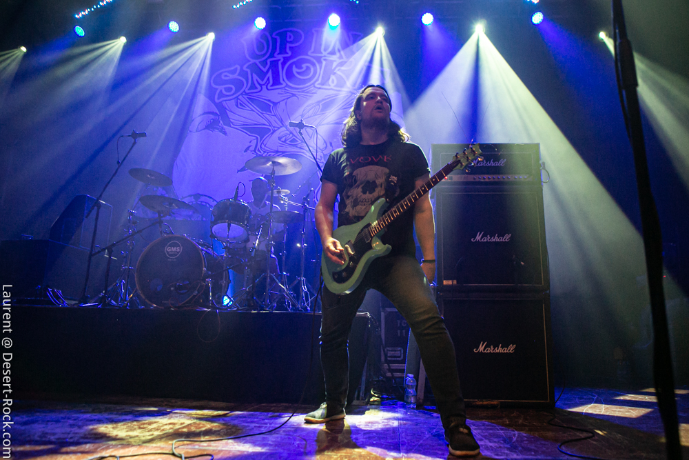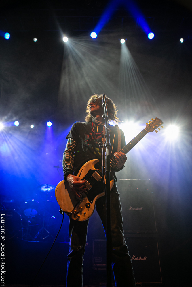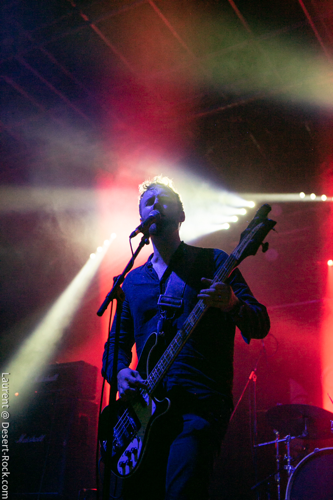 …et s’il fallait un énième groupe aujourd’hui pour appuyer ce postulat, Nebula débarque sur scène, tout auréolé de son statut de pionnier du genre musical qui nous intéresse. Après une parenthèse de plusieurs années qui ressemblait fort à un split, Eddie Glass et Tom Davies étaient revenus motivés et en grande forme montrer que Nebula avait encore des choses à dire et de sérieux arguments à défendre. Le premier constat à l’arrivée sur scène du trio c’est : « Mais où est Tom Davies ? ». En effet, un grand bassiste à la longue tignasse brune frisée occupe le côté gauche de la scène en lieu et place de l’emblématique musicien à l’éternelle Gibson Firebird. Point de malaise a priori, ni de signe avant-coureur de retour des mauvais travers de Nebula : simplement, le bassiste est bloqué à Los Angeles pour des besoins administratifs (pas ce que vous croyez…), et Ranch, leur technicien guitare, le remplace sur cette tournée. On se dit alors que le concert risque d’être un peu boiteux, sans l’un de ses piliers, mais maître Glass – ayant par ailleurs retrouvé ses oripeaux traditionnels et ses cheveux bruns – est bien déterminé à nous rassurer. Et il s’y emploie avec fougue et un argument inattaquable : une set list en béton armé, s’appuyant sur une discographie pour le moins solide ! D’ailleurs, même si le frontman balance quelques bons titres du dernier album Holy Shit, il va taper bien loin dans ses vieilles compos pour dégainer des petites perles, à commencer par son intro sur le classique spacy/heavy « To the Center », mais aussi des titres comme le terrible « Giant », « Freedom » ou encore l’agressif « Fall of Icarus ». Quel pied ! Glass virevolte, écrase sa wah wah, parle au public… Bref, il est en forme, et Nebula se repositionne comme sérieux challenger aux meilleurs groupes du genre… en activité ! Superbe surprise.