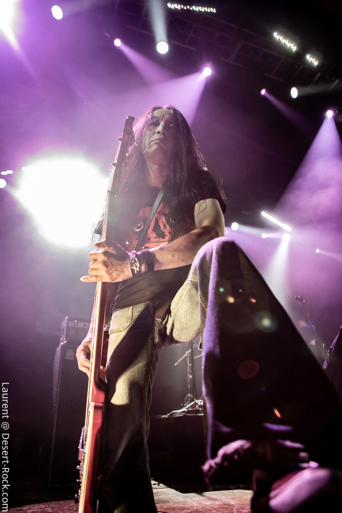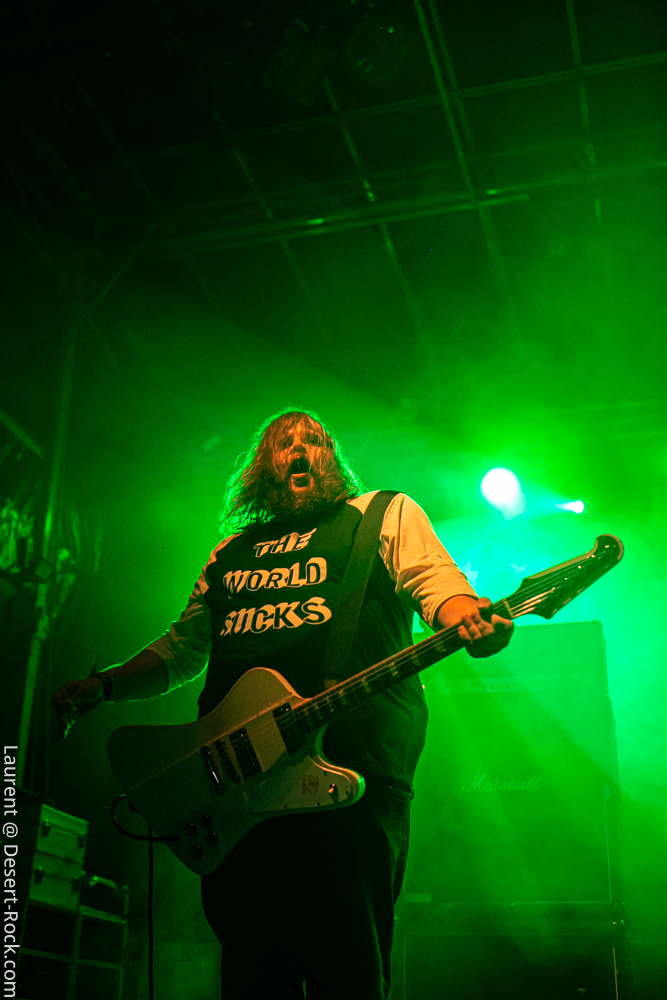 Un peu plus rares sur les planches (même si finalement assez actifs depuis leur dernier album) les japonais de Church of Misery se retrouvent bombardés bien haut sur l’affiche du jour, ce qui n’est pas pour nous déplaire. De même, le line up nous revient identique aux dernières (remarquables) interventions du quatuor, ce qui est plutôt une perspective sympa lors de l’arrivée sur les planches du groupe (Mikami étant susceptible de changer son line-up assez radicalement quand bon lui chante). On a très vite la confirmation de la bonne tenue du set en prenant un « El Padrino » en pleine poire dès l’entame de match. Enchaîné à « I, Motherfucker » puis « Brother Bishop », une autre information se dessine : ce soir, c’est un best-of que nous sert le groupe, rarement enclin malheureusement, il est vrai, à aller chercher quelques vieilles pépites oubliées au fond de sa foisonnante et excitante discographie. Autre constante avec le groupe : ils terminent leur set 5 minutes plus tôt que prévu, gâchant donc le potentiel de nous lâcher un toujours bienvenu « Murderfreak Blues », « Badlands » ou autre joyeuseté… Mais on va pas bouder notre plaisir, comme à son habitude le groupe est en grande forme, avec toujours Mikami (la basse sous les genoux et en pattes d’eph’) qui vient au contact du 1er rang assez souvent et un vocaliste/frontman que l’on a connu plus excité, mais qui fait largement sa part du boulot – en particulier en usant plus souvent de son thérémine, notamment sur le final de « Killfornia » en clôture de set. Bref, du bon, du très bon même, et encore un concert de très haut vol dans cette journée qui finit par être étourdissante.