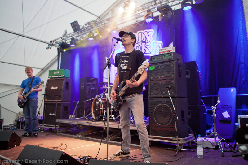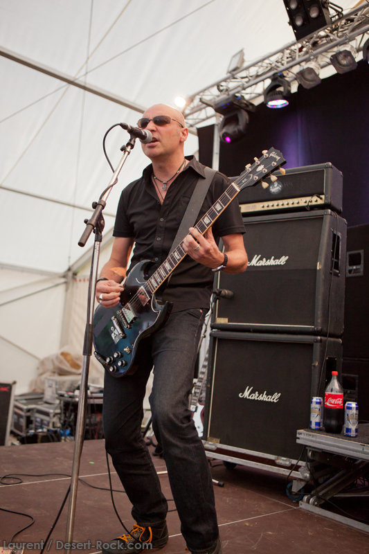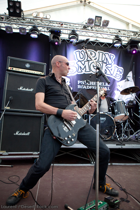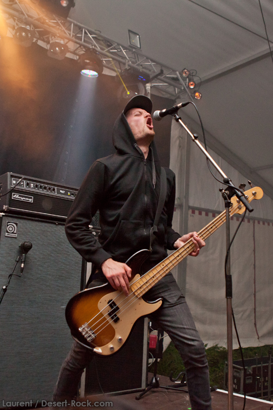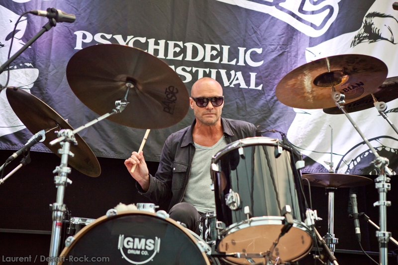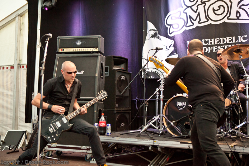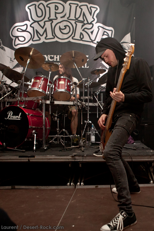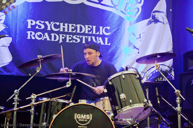 Avec quelques minutes de retard, comme quoi ça arrive aussi en Suisse, nous pénétrons (les premiers) dans le périmètre du festival qui a quelque peu évolué depuis l’an passé. La principale modification étant l’installation, sous une tente, de la Side Stage qui devient donc une scène à part entière sise hors de la salle entre l’entrée, les stands de (mal)bouffe et les tables pour desert-rockers fatigués. C’est sur cette scène de taille fort convenable que nous voyons évoluer la première formation de la journée : Phased. C’est les régionaux de l’étape, quoiqu’avec deux tiers du groupe d’origine scandinave on nage plutôt dans la Grand Europe, et ils ont leur public. Ça échange pas mal avec les premiers rangs même si nous ne sommes encore que quelques poignées de spectateurs dans la place. Le trio a visiblement des fans dans les parages et, vu la discographie impressionnante qu’ils ont déjà alignée depuis la fin des années 90, nous ne sommes pas vraiment étonnés. Au passage, nous notons que même des labels phares du style ont sorti certaines de leurs plaques. Bref ça envoie plutôt bien dans un registre lourd et lent dans la plus pure tradition du doom. Les rasés avaient une demi-heure pour convaincre et c’est chose faite. Les fans de combos alignant des compositions doom rock aux relents psychédéliques sont aux anges. Ca débute bien se dit-on !