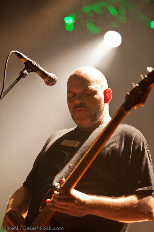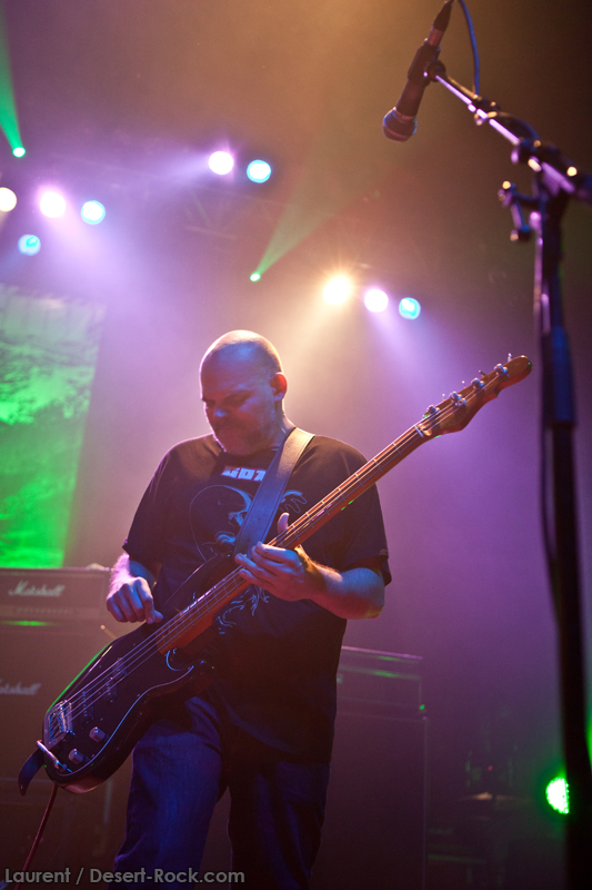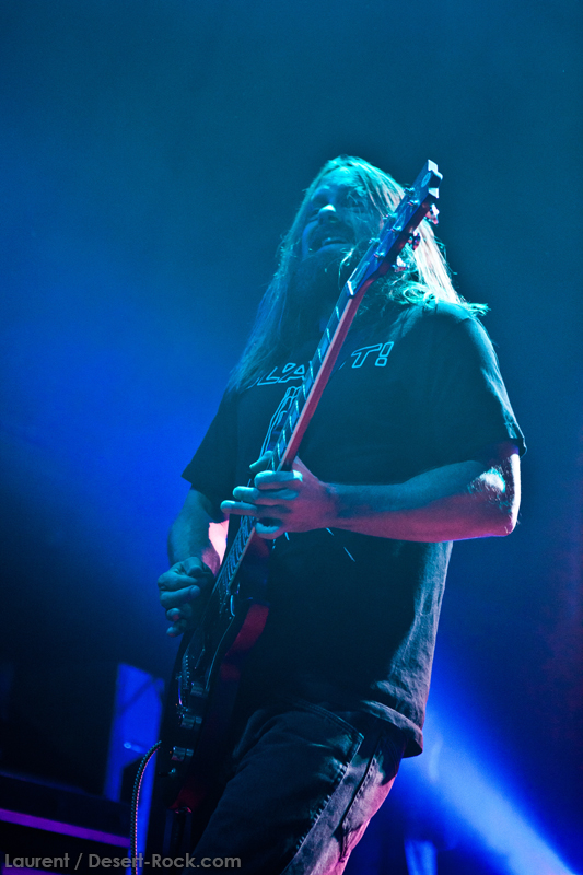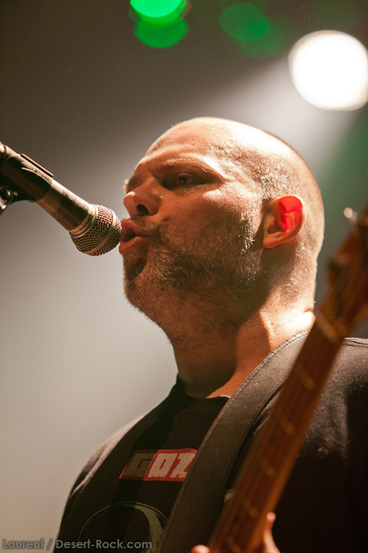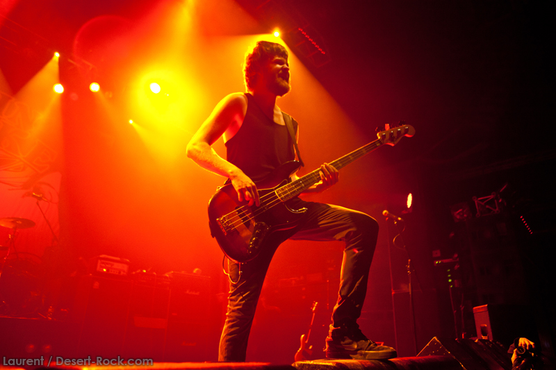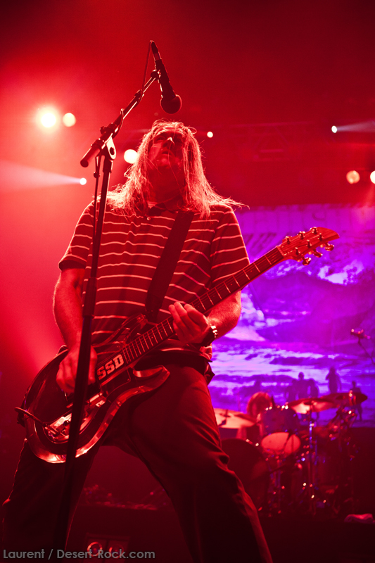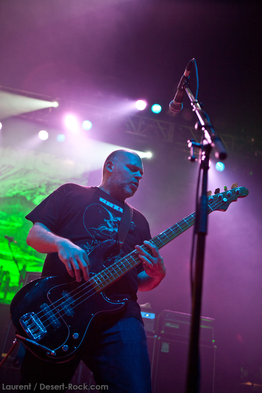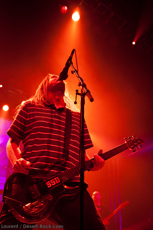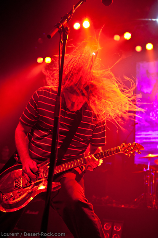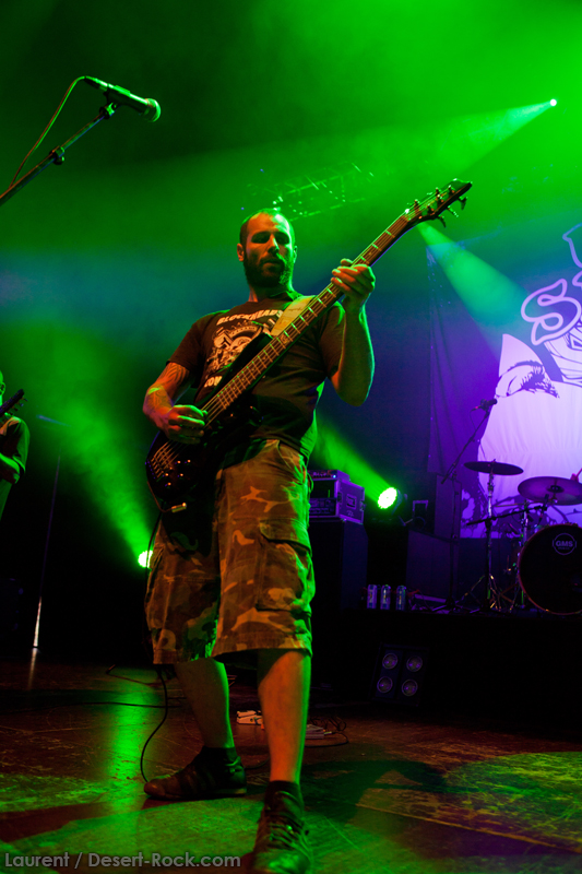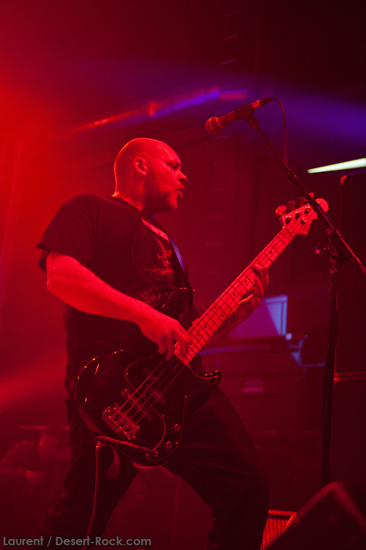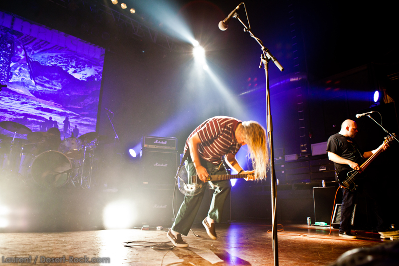 Quand les quatre gaillards de Fu Manchu montent sur scène et s’emparent de leurs instruments, l’excitation dans la salle est palpable, et l’on sait que l’on a sous les yeux la vraie tête d’affiche de la journée. A partir de là, les californiens n’ont qu’une ligne dans leur cahier des charges pour ce soir : assurer, ne pas décevoir. C’est donc avec une certaine facilité que le set commence par un bon gros « Eatin’ Dust » , son bon gros riff bien heavy préparant le terrain pour la première déflagration, sous la forme du classique « Hell on Wheels », qui donne la banane à tout le public. Sur scène, tout le monde est au taquet. Scott Hill est impeccable, déchaîné de la première à la dernière minute, il assure ses vocaux et ses lignes de gratte sans faillir. La communication avec le public passe par quelques échanges mais surtout par un véritable pont électrique invisible qui relie pendant environ une heure et quart les centaines de headbangers et slammers avec les quatre fuzz-surfers. Le groupe glissera trois nouvelles compos dans son set, qui fonctionnent bien en live (dont le presque punk-rock « Invaders on my Back » et le très efficace « Dimension Shifter »). Mais pour le reste, rien de vraiment récent à se mettre sous la dent, avec une set list old school, dont l’album le plus récent représenté ce soir est King Of The Road, qui date de 2000 ! Les fans de California Crossing ou des trois autres LP qui lui ont succédé devront se faire une raison : ce soir, c’est que des classiques ! Même les mid-tempo groovy (putain d’enchaînement « The Falcon has landed »/ « Boogie van ») mettent le feu… Le sprint final approche, moment bienvenu pour dégoupiller les dernières grenades fuzzées : « Evil Eye » d’abord (qui voit Bob Balch (ab)user frénétiquement de sa wah-wah pour le plus grand bonheur des premiers rangs, devenus incandescents), puis « King of the Road », évidemment. Le Fu ressort de ses cartons un bon vieux « Push Button Magic » rarement entendu en live, aux passages planants fort bienvenus qui mènent au tout aussi trippant « Saturn III », qui clôture en douceur un set mené de main de maître… On attendait le combo exactement sur ce terrain, on imaginait qu’ils étaient capables de jouer à ce niveau dans un bon jour, et on n’a pas été déçus : ils ont été au rendez-vous, et ont même surpassé nos attentes de fanboys. Les vieux roublards. Ils sont revenus et ils frappent forts !