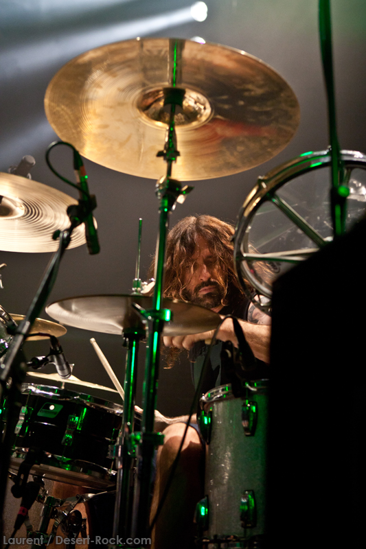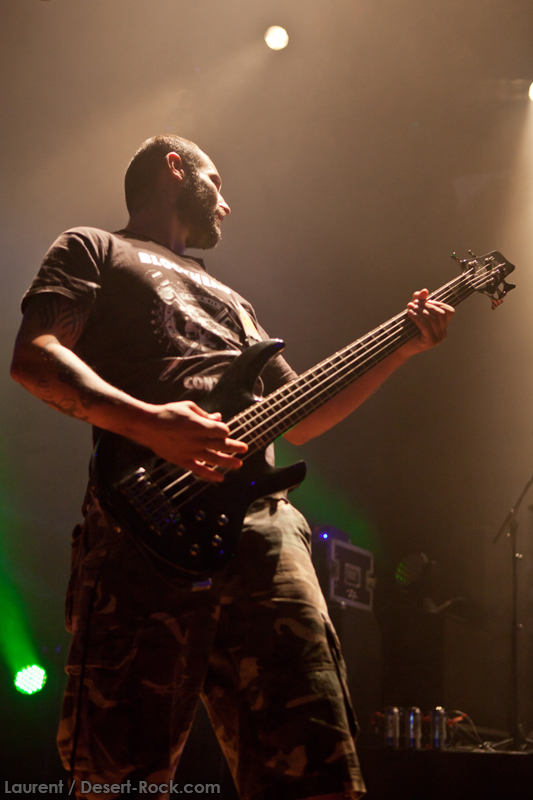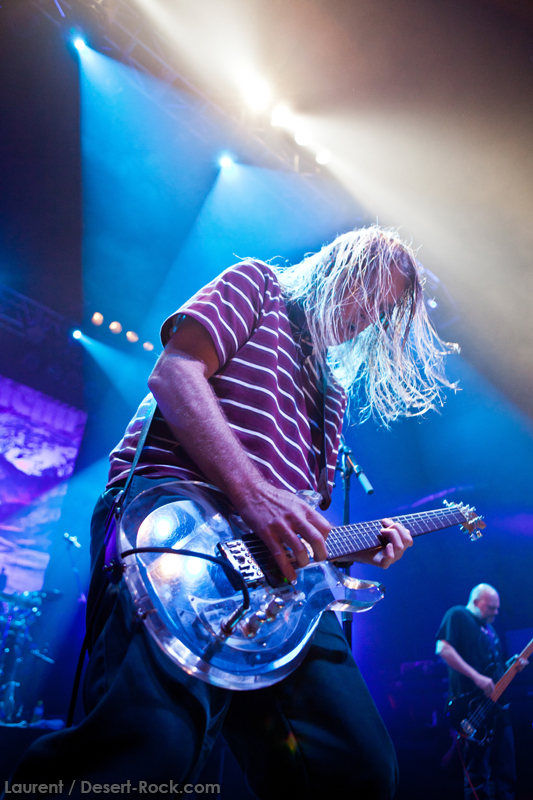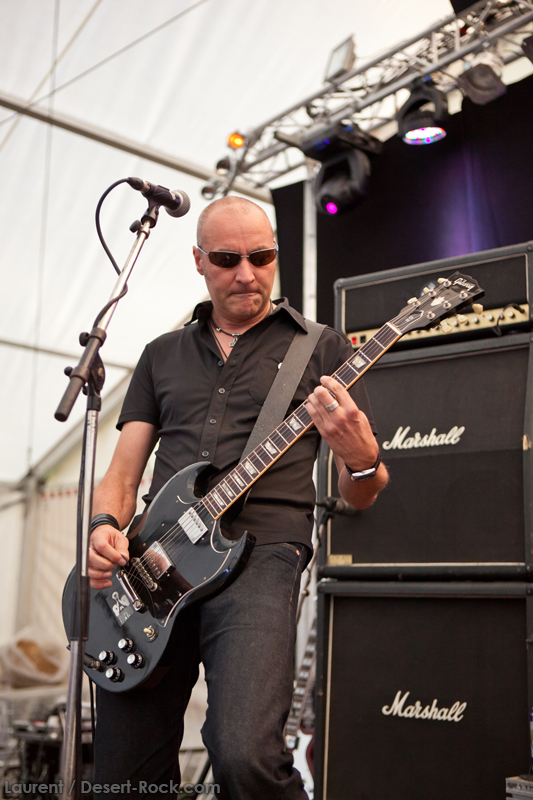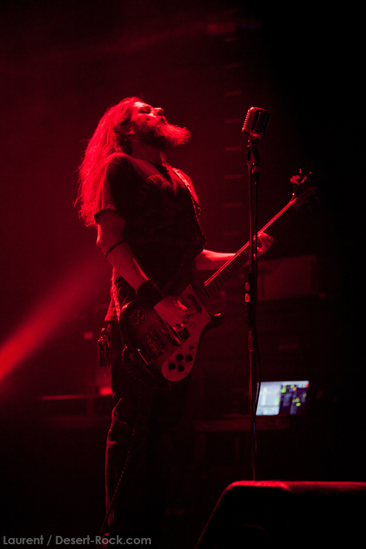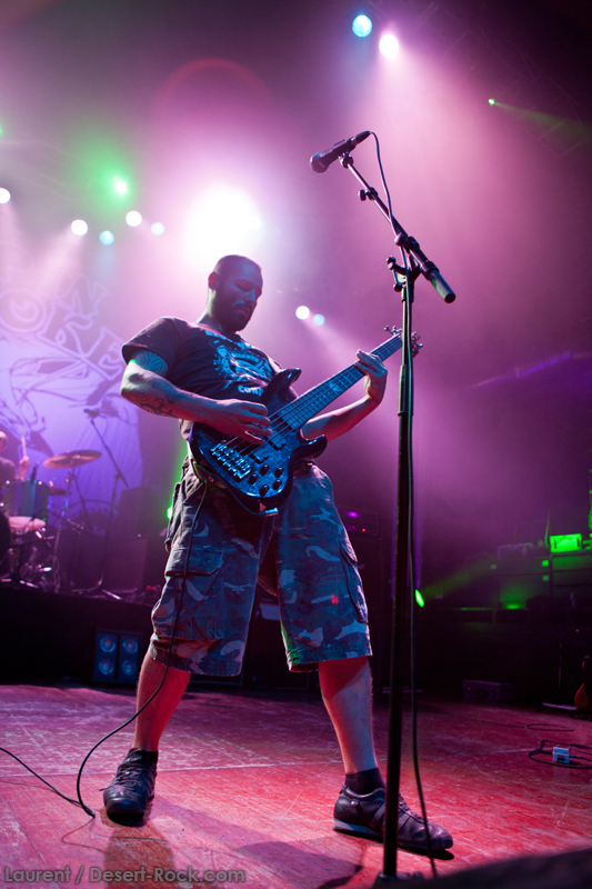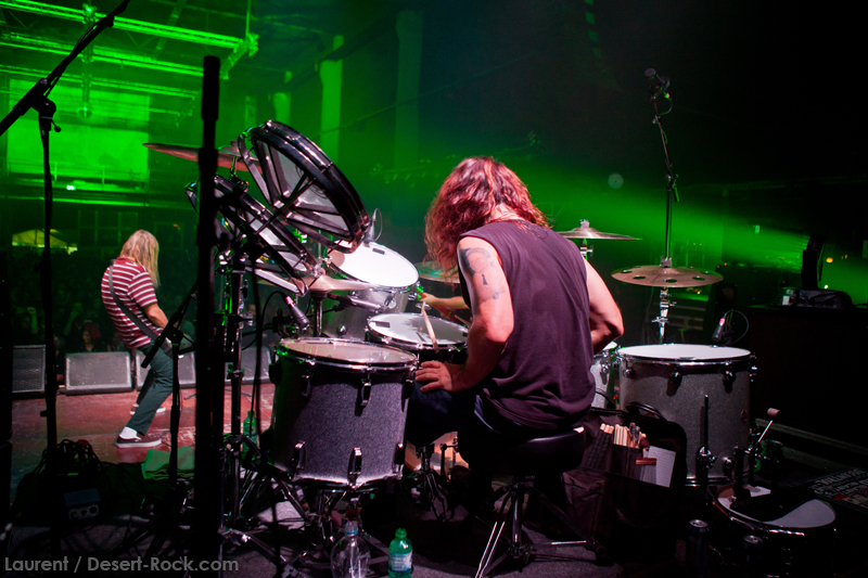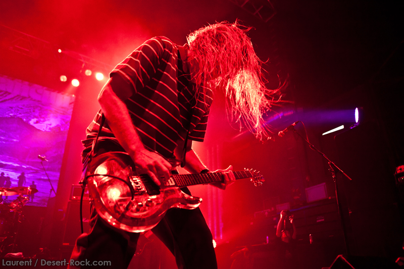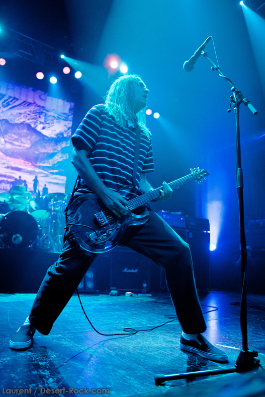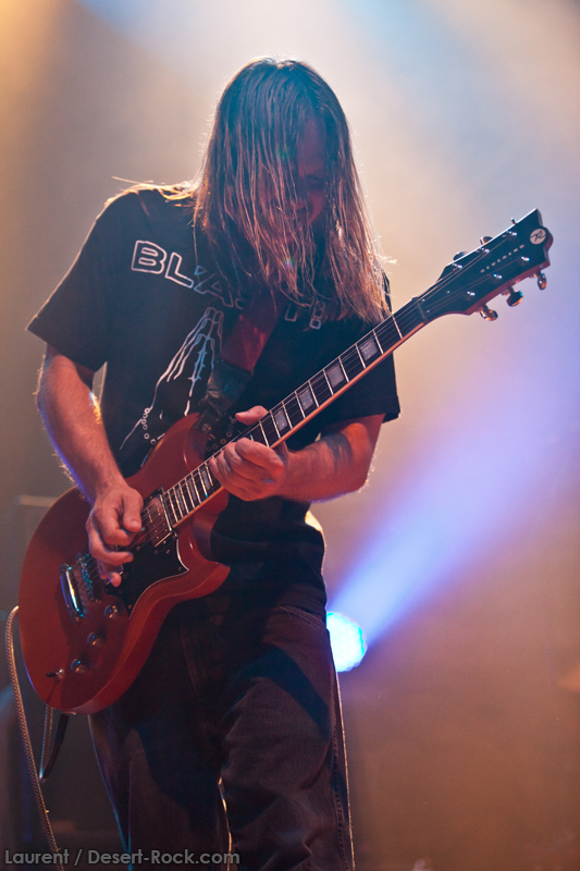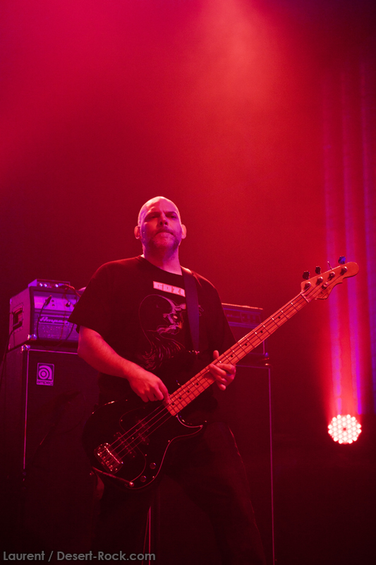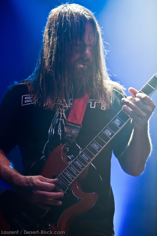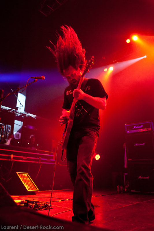 Quand les quatre gaillards de Fu Manchu montent sur scène et s’emparent de leurs instruments, l’excitation dans la salle est palpable, et l’on sait que l’on a sous les yeux la vraie tête d’affiche de la journée. A partir de là, les californiens n’ont qu’une ligne dans leur cahier des charges pour ce soir : assurer, ne pas décevoir. C’est donc avec une certaine facilité que le set commence par un bon gros « Eatin’ Dust » , son bon gros riff bien heavy préparant le terrain pour la première déflagration, sous la forme du classique « Hell on Wheels », qui donne la banane à tout le public. Sur scène, tout le monde est au taquet. Scott Hill est impeccable, déchaîné de la première à la dernière minute, il assure ses vocaux et ses lignes de gratte sans faillir. La communication avec le public passe par quelques échanges mais surtout par un véritable pont électrique invisible qui relie pendant environ une heure et quart les centaines de headbangers et slammers avec les quatre fuzz-surfers. Le groupe glissera trois nouvelles compos dans son set, qui fonctionnent bien en live (dont le presque punk-rock « Invaders on my Back » et le très efficace « Dimension Shifter »). Mais pour le reste, rien de vraiment récent à se mettre sous la dent, avec une set list old school, dont l’album le plus récent représenté ce soir est King Of The Road, qui date de 2000 ! Les fans de California Crossing ou des trois autres LP qui lui ont succédé devront se faire une raison : ce soir, c’est que des classiques ! Même les mid-tempo groovy (putain d’enchaînement « The Falcon has landed »/ « Boogie van ») mettent le feu… Le sprint final approche, moment bienvenu pour dégoupiller les dernières grenades fuzzées : « Evil Eye » d’abord (qui voit Bob Balch (ab)user frénétiquement de sa wah-wah pour le plus grand bonheur des premiers rangs, devenus incandescents), puis « King of the Road », évidemment. Le Fu ressort de ses cartons un bon vieux « Push Button Magic » rarement entendu en live, aux passages planants fort bienvenus qui mènent au tout aussi trippant « Saturn III », qui clôture en douceur un set mené de main de maître… On attendait le combo exactement sur ce terrain, on imaginait qu’ils étaient capables de jouer à ce niveau dans un bon jour, et on n’a pas été déçus : ils ont été au rendez-vous, et ont même surpassé nos attentes de fanboys. Les vieux roublards. Ils sont revenus et ils frappent forts !