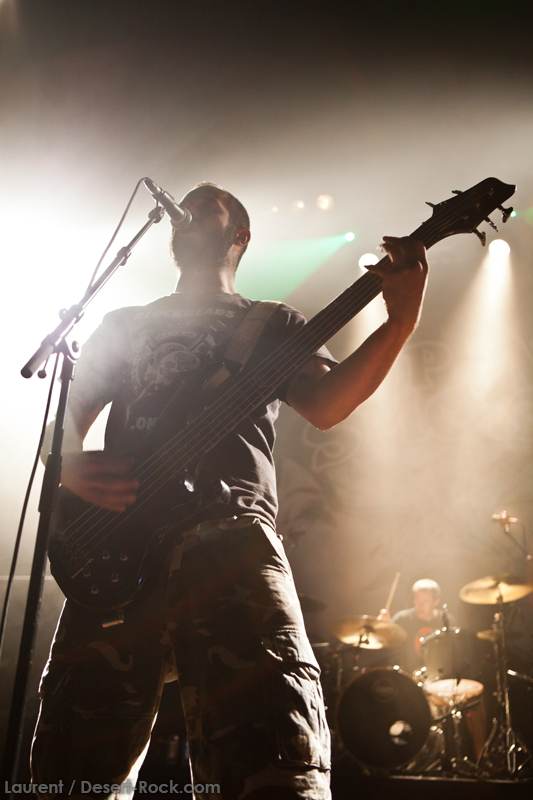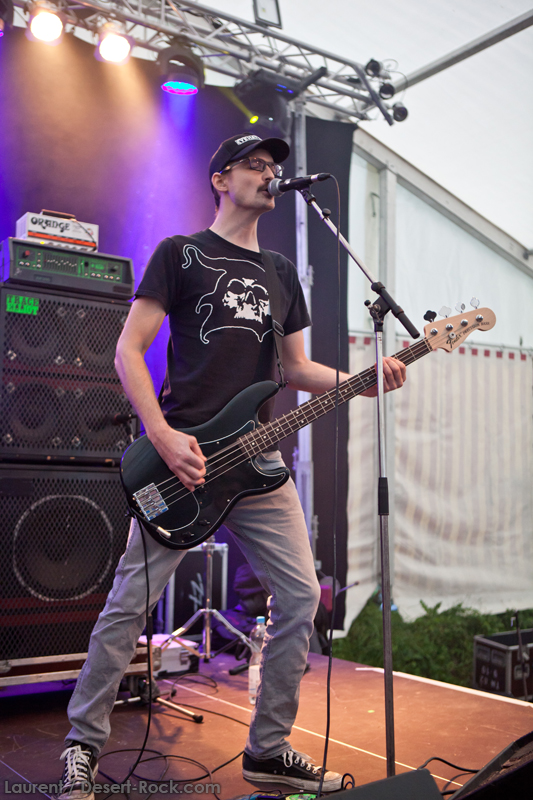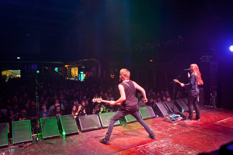 Après un groupe originaire du lieu et du pays des vikings, on tape dans le national avec les Genevois d’Intercostal. Rompu aux exercices scéniques non seulement avec leurs formations parallèles ou passées, mais aussi avec cette structure, le quatuor est à l’aise sur la scène principale de cette manifestation. Les rédacteurs de ces pages virtuelles avaient déjà eu le plaisir d’admirer cette formation plusieurs fois depuis 2009 où ils avaient ouvert pour Acid King à l’Usine de Genève et presqu’à chaque fois des éléments la constituant avaient changé, mais à chaque fois aussi le plaisir était présent tant ce groupe est fantastique sur scène. Cette fois, c’est un nouveau batteur qu’il nous a été donné d’apprécier pour sa première représentation avec cette formation. Le garçon a du métier et les trois ou quatre répétitions faites en commun ont porté leurs fruits : Intercostal est au top et le public qui commence à affluer dans la salle bâloise ne s’en retourne pas descendre des bières dehors à l’extérieur : il demeure à l’intérieur et ne boude pas son plaisir en se régalant d’un show court (trente minutes), mais intense qui fait furieusement bouger la nuque et taper le pied au sol. Débuté avec des titres récents incluant des parties vocales délivrées par deux hurleurs, le set s’aventure pour sa deuxième partie dans les terres instrumentales que le groupe explorait à ses débuts sans chant sur des tempi frénétiques. L’univers musical à la fois lourd, trépidant et technique que déploie Intercostal les rapproche musicalement de Karma To Burn avec une bonne grosse d’influences de la scène de NOLA ; c’est un peu l’équivalent francophone de Superjoint Ritual et c’est carrément le panard. Terminant leur show les bras – pour la plupart tatoués – en l’air, le poing fermé et avec une corde de guitare en moins (qui n’entacha en rien le dernier titre envoyé à toute vitesse), les Suisses ont le sourire aux lèvres : ils savent qu’ils ont acquis à leur cause de nouveaux fans et c’est entièrement mérité.