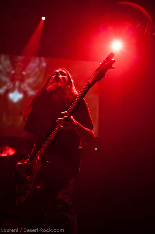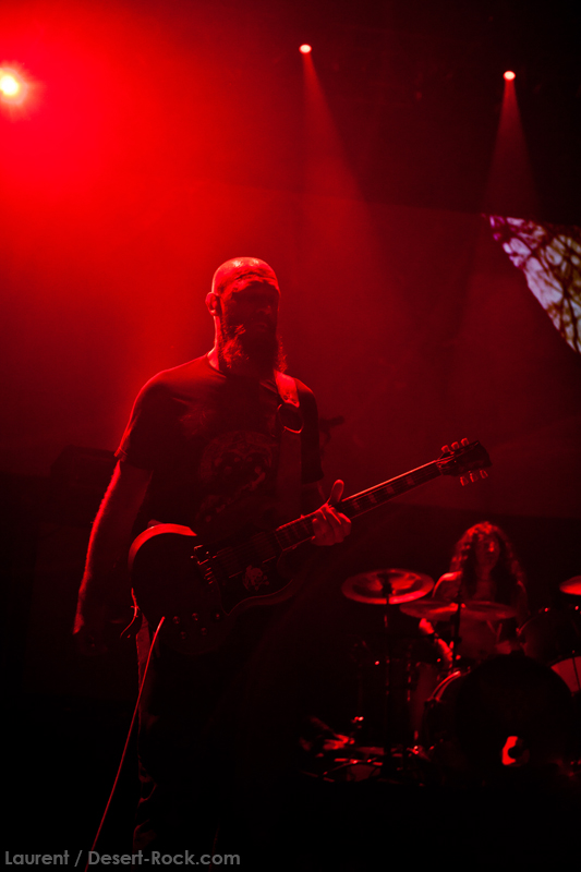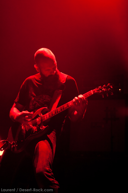 15 ans. 15 ans que le trio tricote un doom/sludge/psyché, 15 ans que le groupe érige un immense et brumeux mur d’Hadrien autour de l’Italie. Ce soir, ils ont habillé la main-stage de l’Up in Smoke d’un rouge sanguin et profond, d’une ambiance poisseuse doublée de vidéos miroirs projetées en fond de scène. Et l’on change clairement de braquet à ce moment du festival. Le son est aussi énorme que les joues des zicos sont poilues. Si Richter avait connu Ufomammut il aurait rajouté un échelon à son échelle tellement le trio fait trembler le Z7. La gestion des boucles d’effets et de nappes synthétiques tissent un immense champ d’appui pour que la quatre et la six cordes explorent toutes les facettes de leurs discussions. Il y a une cohérence effrayante entre ces riffs et ces breaks de batterie, une violence inouïe aussi dans chaque note jouée par Urlo, le bassiste. Mais ce soir, nous n’écoutons pas le Ufomammut période Eve, influencé par Pink Floyd, non. Ce soir, leur sludge est clairement sale, violent, dégueulasse, période Oro. Chaque titre est martelé à chaud, chaque instant binaire est souillé de contrepoints vicelards, de frappes ternaires. Le trio explose littéralement les esprits en ralentissant dangereusement le tempo. Nous nous prenons leur live dans la tronche, nous ressentons cette lourdeur au plus profond de nos vésicules biliaires. Ufomammut vient juste de trouver le point de rupture entre l’équilibre et le chaos. Vu le nombre de nuques brisées qui jonchent le sol, les italiens peuvent quitter la scène avec la satisfaction du devoir accompli.