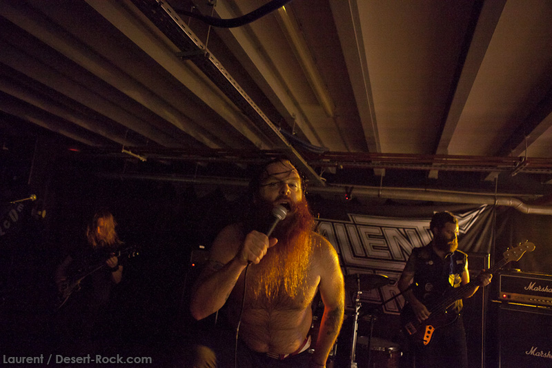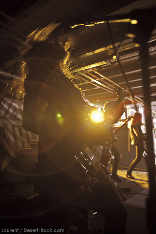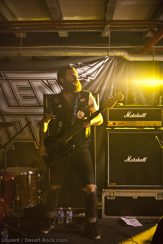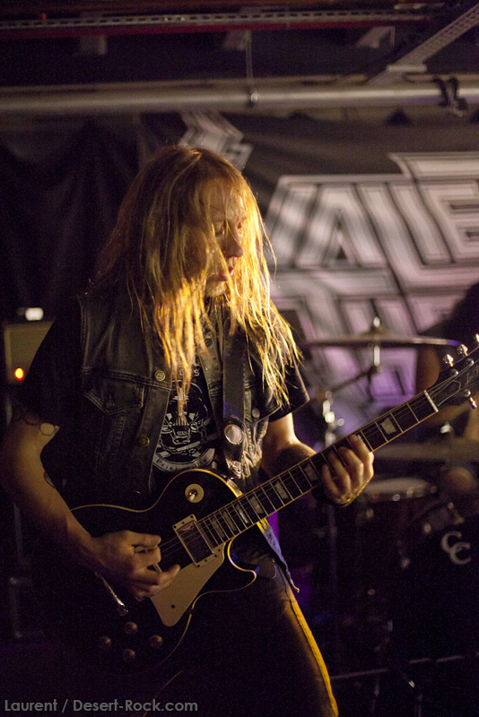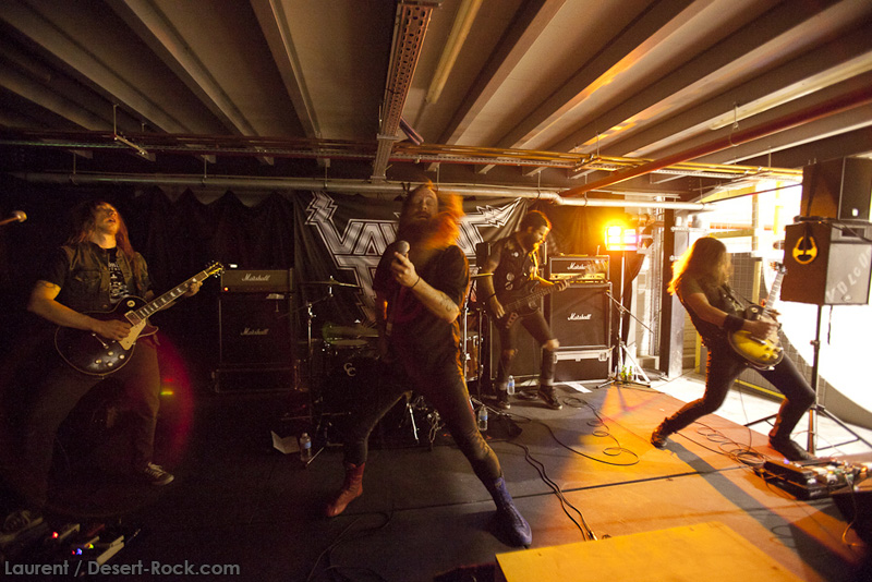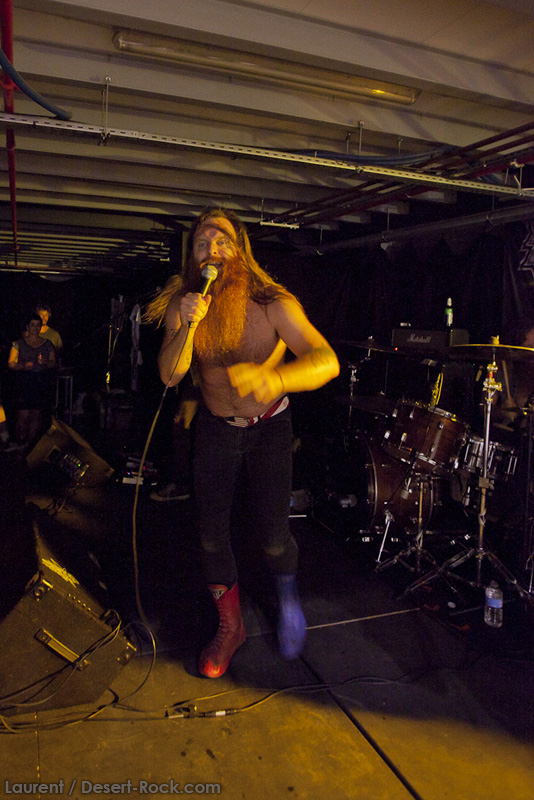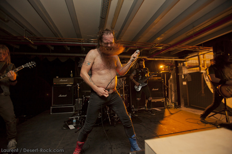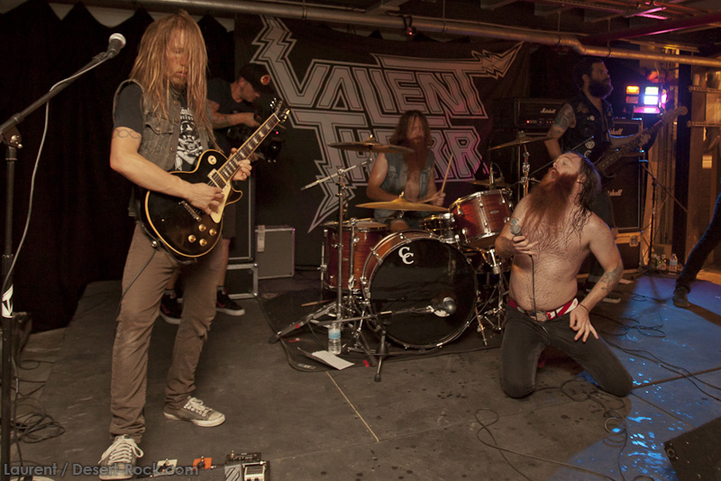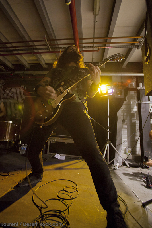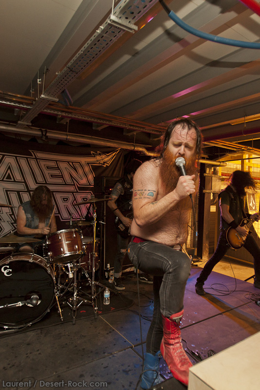 Scéniquement, le spectacle offert par le quintette est toujours aussi spécial : déjà, ils se la donnent devant ces quelques dizaines de spectateurs comme si les bonhommes étaient en tête d’affiche devant 100 000 personnes. Chaque solo est arraché comme si leur vie en dépendait, chaque ligne vocale est éructée avec rage, chaque frappe de caisse claire est violemment asséné… Evidemment, même si les chœurs constituent une composante importante de la musique de VT, c’est Valient Himself au chant qui mène la barque : le charisme inéluctable du chanteur perturbe d’abord, son physique approximatif (cheveux longs, calvitie naissante, bide velu protubérant, chaussures de catcheurs sur jean moulant…) n’évoquant pas forcément le bellâtre de base. Ses vocaux en revanche sont inattaquables : dans un registre puissant, il donne l’impression de hurler tout le temps, mais n’est jamais mal à l’aise dès que des passages plus mélodiques sont nécessaires (il nous fera même penser à feu-Bon Scott sur certains passages). Au-delà de sa performance vocale, il faut le voir courir dans tous les sens, haranguer les gars du premier rang, faire asseoir tout le public pour le rejoindre et le faire « pomper »… la communication avec le public est continue. Par ailleurs, il sait aussi rendre à César ce qui est à César, et par la même rendre hommage au Dieu guitare : il faut le voir s’agenouiller et se prosterner devant ses gratteux dès lors qu’ils crachent un solo stellaire comme ils en ont le secret. Car il serait temps de leur rendre honneur : la paire de gratteux de Valient Thorr est énorme, aussi à l’aise sur les rythmiques que sur les innombrables soli, impeccablement exécutés. Une belle paire de shredders, portée de mains de maîtres par un Nitewolf toujours dans le registre de la force brute derrière sa basse.