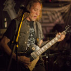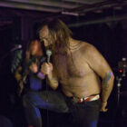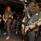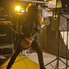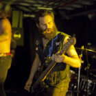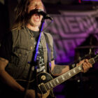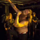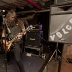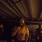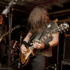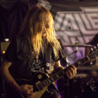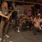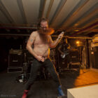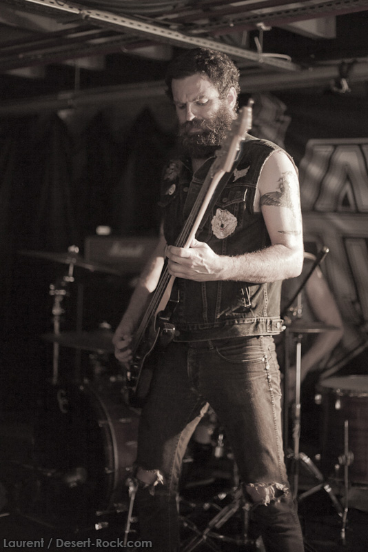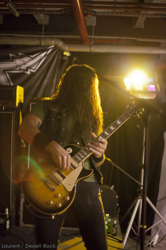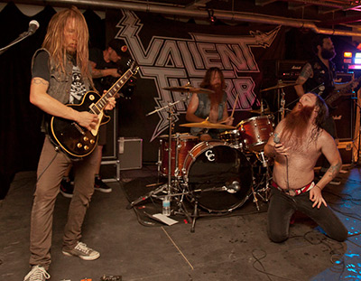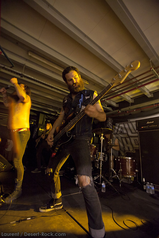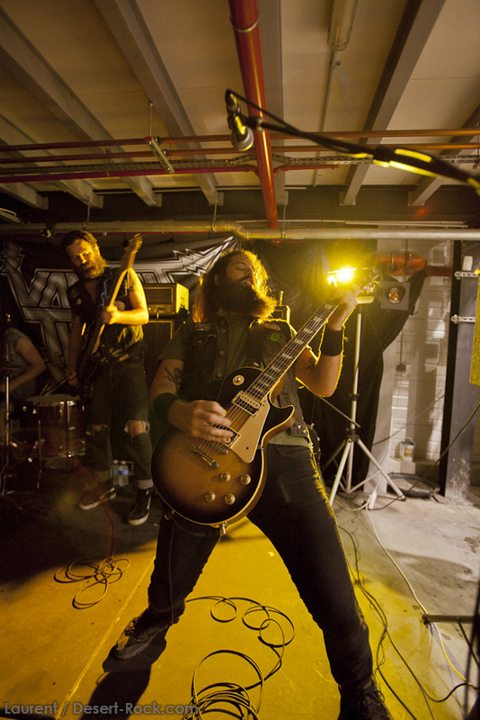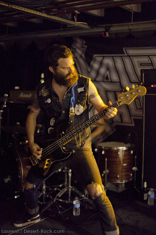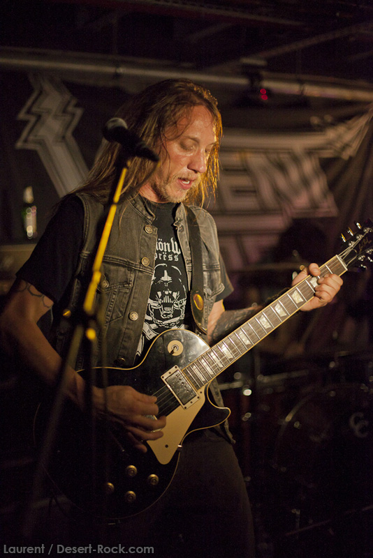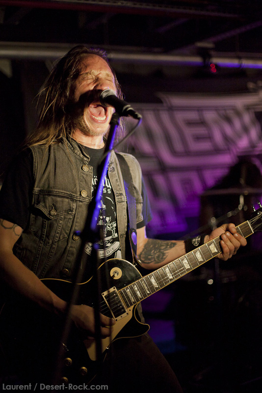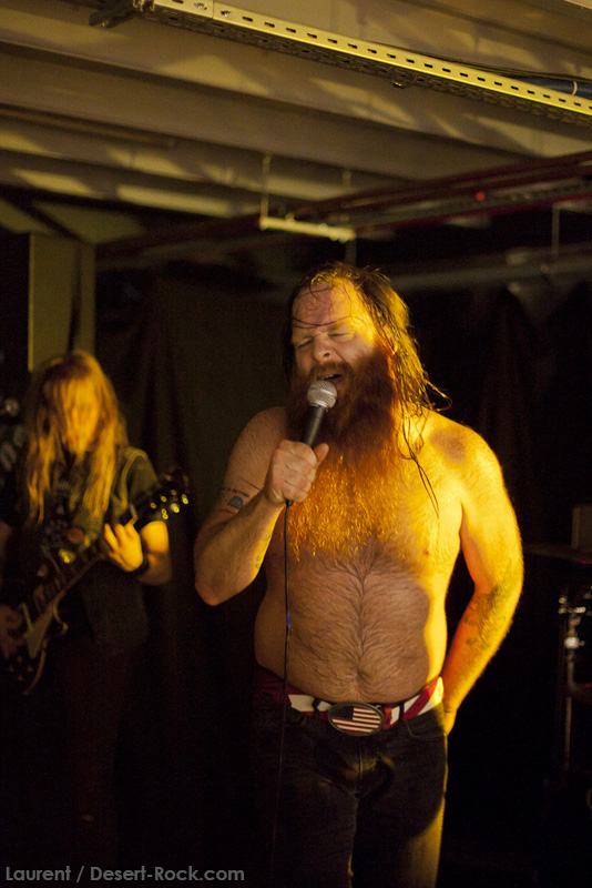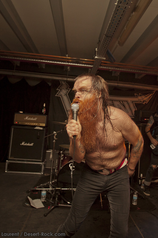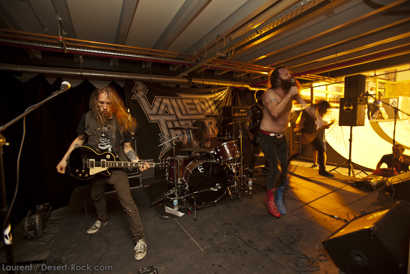 Scéniquement, le spectacle offert par le quintette est toujours aussi spécial : déjà, ils se la donnent devant ces quelques dizaines de spectateurs comme si les bonhommes étaient en tête d’affiche devant 100 000 personnes. Chaque solo est arraché comme si leur vie en dépendait, chaque ligne vocale est éructée avec rage, chaque frappe de caisse claire est violemment asséné… Evidemment, même si les chœurs constituent une composante importante de la musique de VT, c’est Valient Himself au chant qui mène la barque : le charisme inéluctable du chanteur perturbe d’abord, son physique approximatif (cheveux longs, calvitie naissante, bide velu protubérant, chaussures de catcheurs sur jean moulant…) n’évoquant pas forcément le bellâtre de base. Ses vocaux en revanche sont inattaquables : dans un registre puissant, il donne l’impression de hurler tout le temps, mais n’est jamais mal à l’aise dès que des passages plus mélodiques sont nécessaires (il nous fera même penser à feu-Bon Scott sur certains passages). Au-delà de sa performance vocale, il faut le voir courir dans tous les sens, haranguer les gars du premier rang, faire asseoir tout le public pour le rejoindre et le faire « pomper »… la communication avec le public est continue. Par ailleurs, il sait aussi rendre à César ce qui est à César, et par la même rendre hommage au Dieu guitare : il faut le voir s’agenouiller et se prosterner devant ses gratteux dès lors qu’ils crachent un solo stellaire comme ils en ont le secret. Car il serait temps de leur rendre honneur : la paire de gratteux de Valient Thorr est énorme, aussi à l’aise sur les rythmiques que sur les innombrables soli, impeccablement exécutés. Une belle paire de shredders, portée de mains de maîtres par un Nitewolf toujours dans le registre de la force brute derrière sa basse.