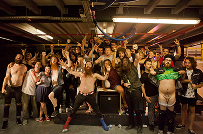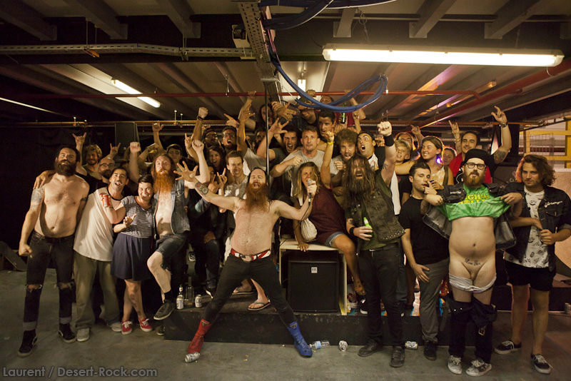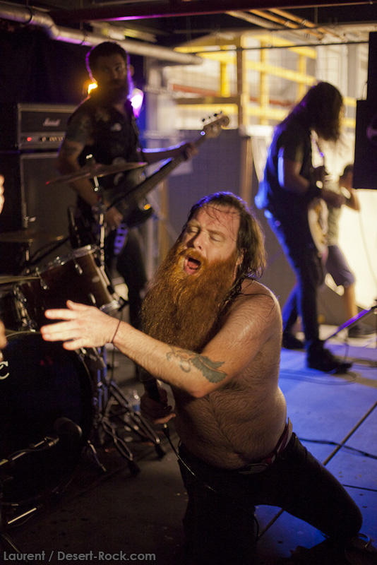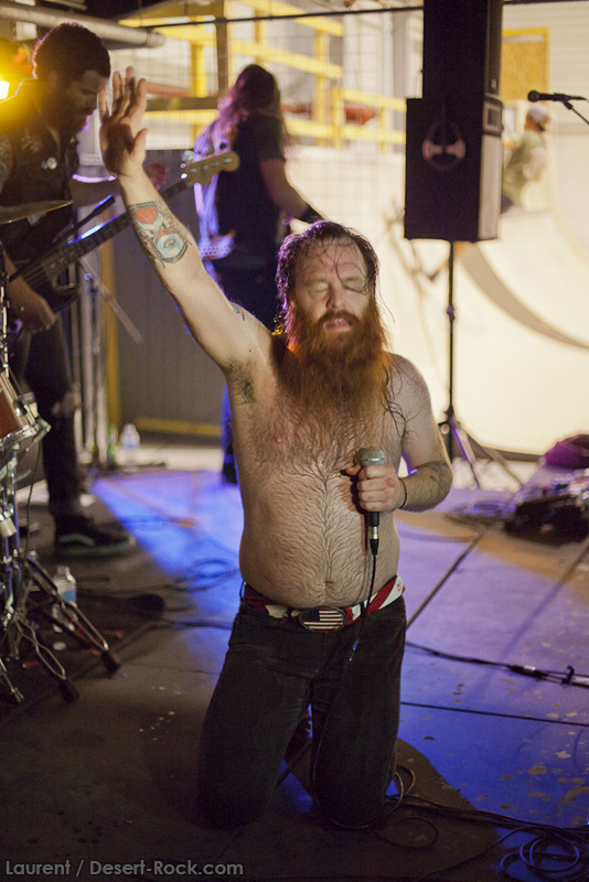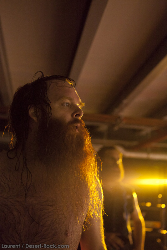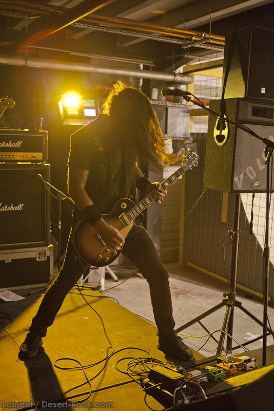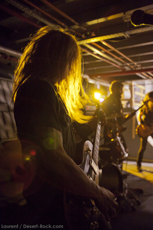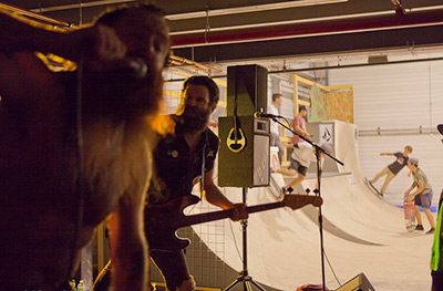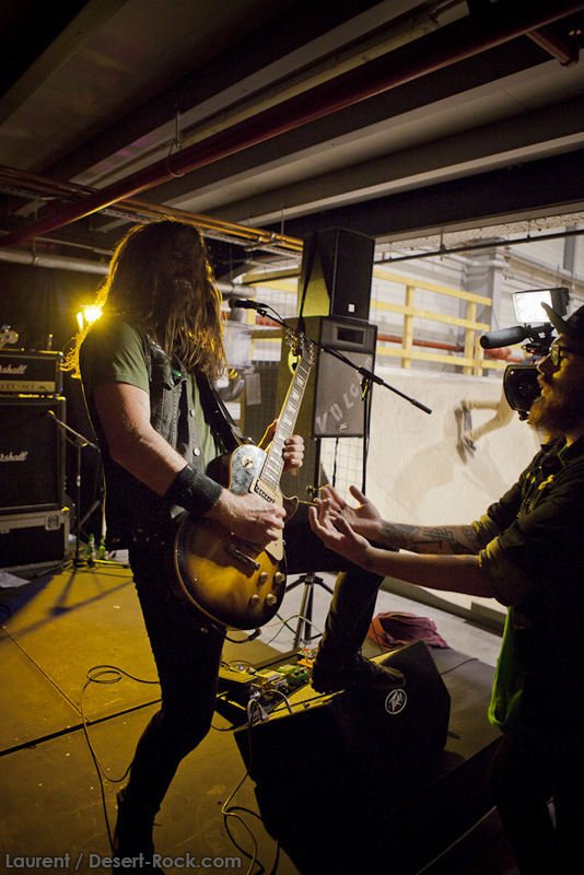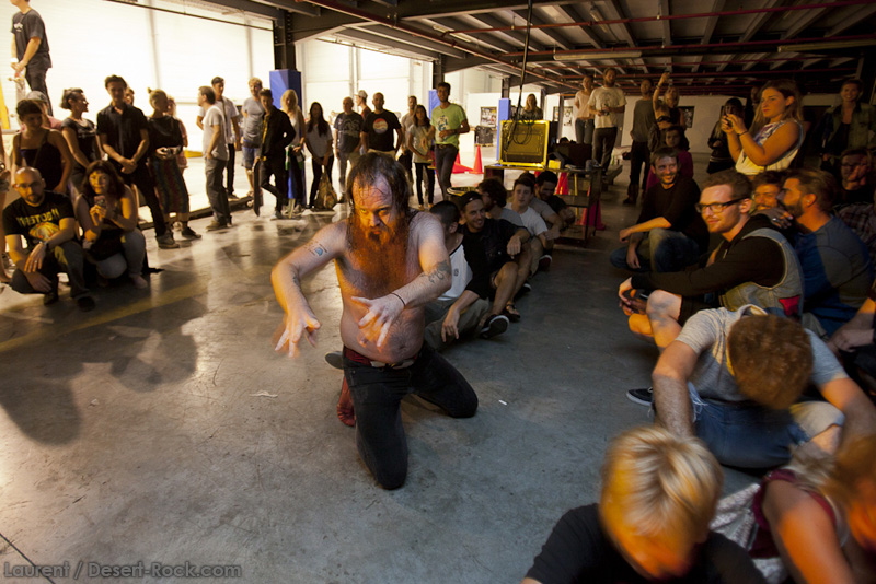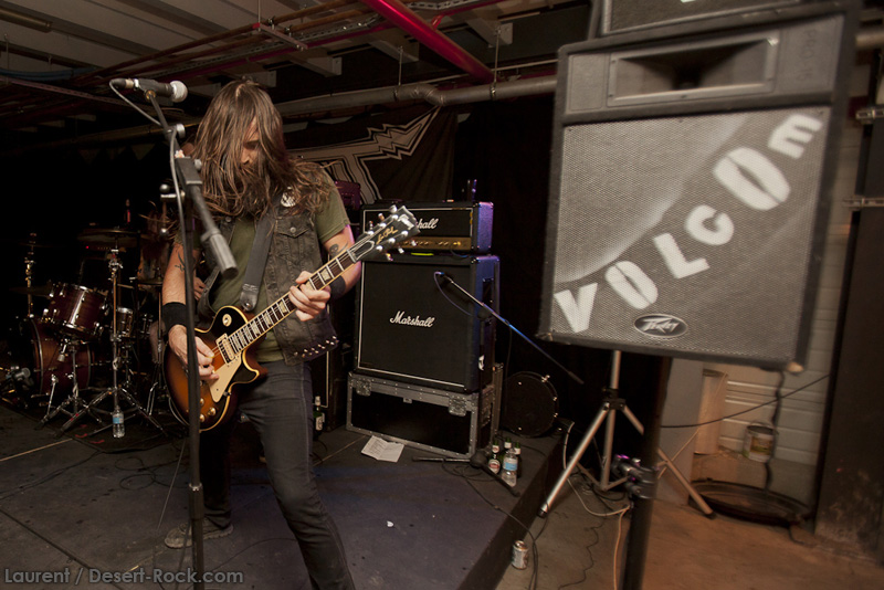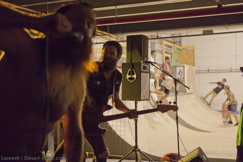 Dans un contexte très similaire, et à l’initiative des mêmes gars très cools, on avait assisté il y a quelques années à un concert de Karma To Burn avec les musiciens suspendus sur une plateforme en bois de 2 m² au bord d’une rampe de skate. L’événement de ce soir transpire le même feeling : concert gratuit, bières gratuites, des rampes de skate à gogo (le concert se déroule dans les bureaux mêmes de Volcom, qui disposent au rez de chaussée d’un énorme hangar dédié aux skaters), une pub minimale (via facebook et le bouche à oreilles « local »)… Coefficient coolitude au top !