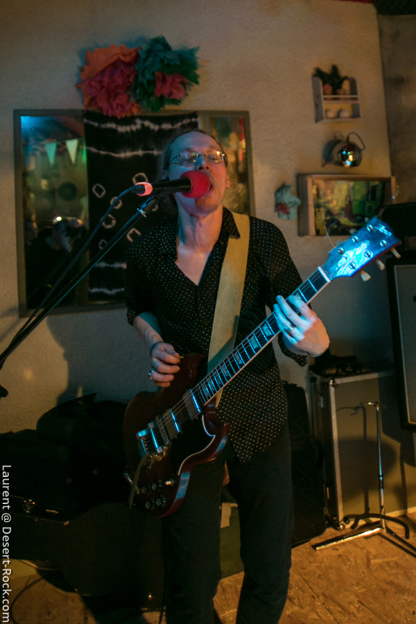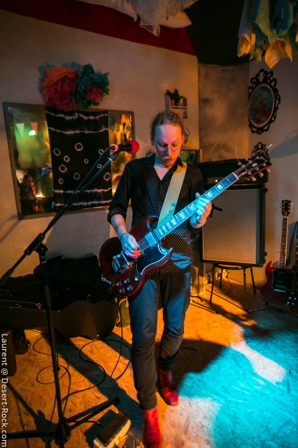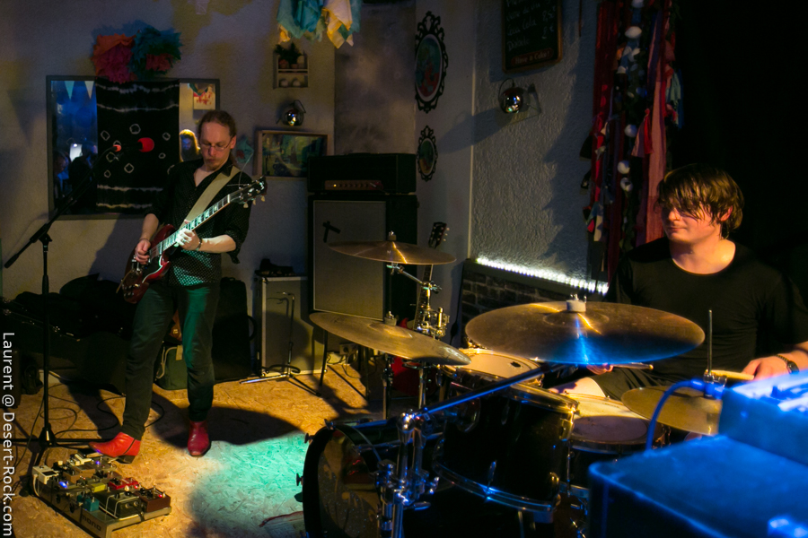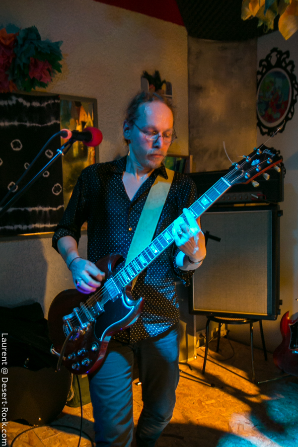 Son pote David Götz, l’homme du match, l’artisan de l’ombre, émerge des amplis. Le discret bassiste cisèle une rythmique et un socle mélodique qui sont un élément clé du son du groupe. Et que dire quand il lâche sa 4-cordes pour faire chanter son double clavier Korg, ses doigts dansant sur les touches et son pied actionnant la discrète cabine Leslie dans son dos… Groovy ! Sans oublier qu’à ses côtés, Holger frappe ses futs avec détermination et efficacité, c’est carré, et ça communique bien en rythmique. La place de chacun dans le spectre sonore est ainsi équitable, et chacun trouve de généreuses séquences où il peut s’exprimer sur des soli jamais trop longs ni trop chiants. Sourires, communication régulière avec le public, jeu ample… Même devant une petite assistance le groupe se donne avec générosité.