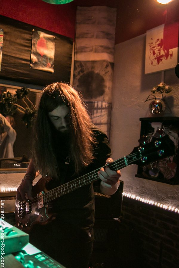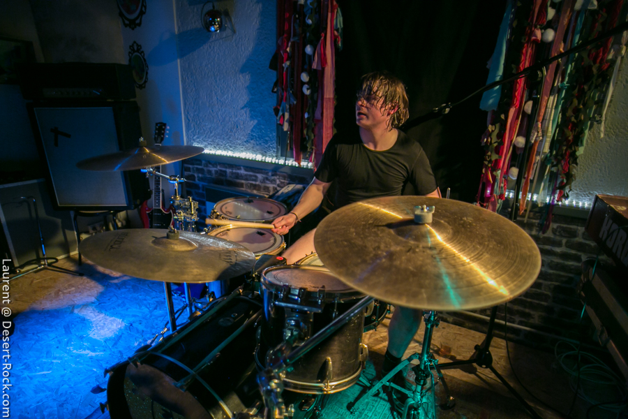 On commence dans la capitale avec Thousand Watt Burn, quatuor de stoner rock garage à l’énergie sombre. Le portail de l’enfer s’ouvre par le lourd riff de « My darling » et nous propulse aussitôt dans l’univers occulte du groupe. La violence de la batterie fait ressortir la rythmique lancinante des grattes sur laquelle vient se poser la voix énervée et tout en réverbe de Roxane. En dépit de leur présence musicale, on sent les membres quelque peu timides sur scène, comme envoûtés par leur propre magie. Le seul qui semble véritablement s’éclater c’est le bûcheron assis derrière ses fûts. Un charmant jeune homme au T-shirt Sleep immanquable qui donne toute son importance à la qualité d’un hardware de batterie. Le quatuor parisien déroule un set qui s’enchaine bien, notamment grâce aux multiples samples de film à la Dopelord intercalés entre chaque titre. Tout s’arrête presque trop tôt, à l’instant où les nuques s’échauffaient et où la salle commençait tout juste à se remplir.
