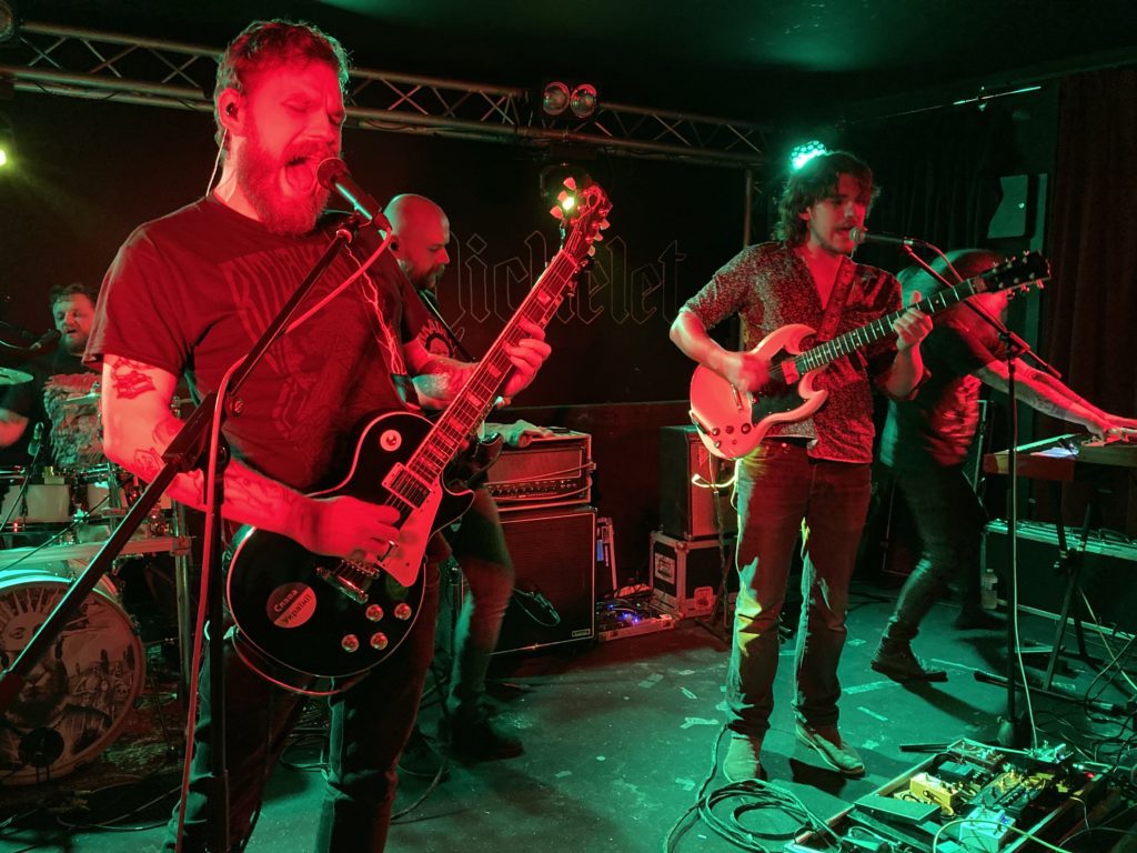 Le temps d’attraper une pinte au comptoir, on se retrouve déjà à remonter les marches pour l’arrivée du second groupe. A peine les Polonais de Weedpecker s’installent que déjà une vingtaine d’affamés du riff s’amassent devant les retours pour recevoir leur dose de saturation. Et sans autre forme de procès, l’équipe de Varsovie ouvre le bal avec « Molecule » ; valeur sûre extraite de sa pièce maitresse sortie en janvier 2018 : III. Piste qui s’enchaîne à merveille avec « Liquid Fire » et qui laisse pleinement apprécier le stoner psychédélique du quintet. La séduction s’opère de suite, le groove charme, les guitares envoutent de leurs mélopées oniriques, ponctuées par un discret clavier qui teinte l’atmosphère en arrière-plan. Instrument qui n’a d’ailleurs pas l’air de suffire à son musicien tant celui-ci se perd en air-guitare et en agitation de tous les membres de son corps. En comparaison de ce satyre déchaîné, les quatre autres gaillards paraissent presque calmes. Et pourtant l’énergie est là. Après deux morceaux issus de leur dernier album, on repart sur III avec « Embrace » qui reçoit un formidable accueil. Pas de là à provoquer des pogos, mais on sent tout de même graduellement monter la température. La scène parait à peine assez grande pour les cinq bonshommes qui commencent à gagner en frénésie. La section rythmique est d’une solidité minérale, avec un batteur au charbon et un bassiste, la barbe taillée d’un guidon magnifique, qui tricote copieusement sur sa quatre-cordes. Entre ces deux-là, les deux gratteux glissent leurs phrasés tantôt empruntés à la lourdeur du doom, tantôt aussi fragiles que le tissu d’un rêve, le tout agrémenté de ce chant éthéré si caractéristique du groupe. On aurait pu le souhaiter plus fort. Mais le son, et à fortiori le mixage, étant ce qu’ils sont dans ce type de salle, on aurait tort de se plaindre du rendu final, qui se révèle plus que satisfaisant.
