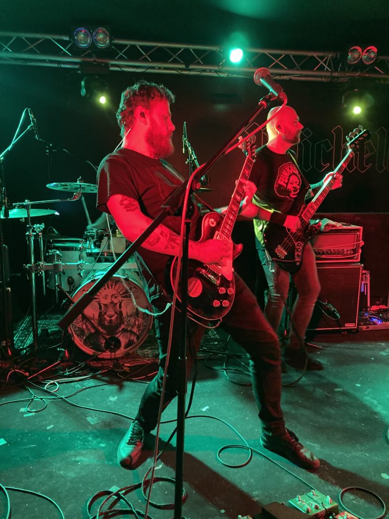 Comme le témoigne ce cliché atroce pris du fond de la salle, le cul collé contre la table de mixage, le premier groupe accueille un public en nombre et motivé. Les Nantais sont venus profiter de l’énergie dispensée par un trio d’énergumènes, nommés Léo, Léo (!) et Olivier, originaire de Paris et officiant sous une bannière intitulée Baron Crâne. Ensemble, ils proposent un stoner instrumental aux origines diverses, mais au groove certain. Phrasés de guitare progressifs, ligne de basse jazzy, et rythmique entêtante, ils naviguent entre un rock psychédélique maîtrisé et animé de cette frénésie organique propre à la sacrosainte composition guitare-basse-batterie. Et le moins que l’on puisse dire, c’est que la mixture prend. Les têtes s’agitent, les sourires s’échangent, et devant ce groupe affichant un plaisir si évident, on ne peut que communier ensemble. Pour le final, Léo nous invite à nous rapprocher encore plus les uns des autres, d’oublier les insécurités et angoisses du monde extérieur, pour simplement profiter encore un peu de ces instants suspendus. Et d’un riff planant, il clôture la messe.