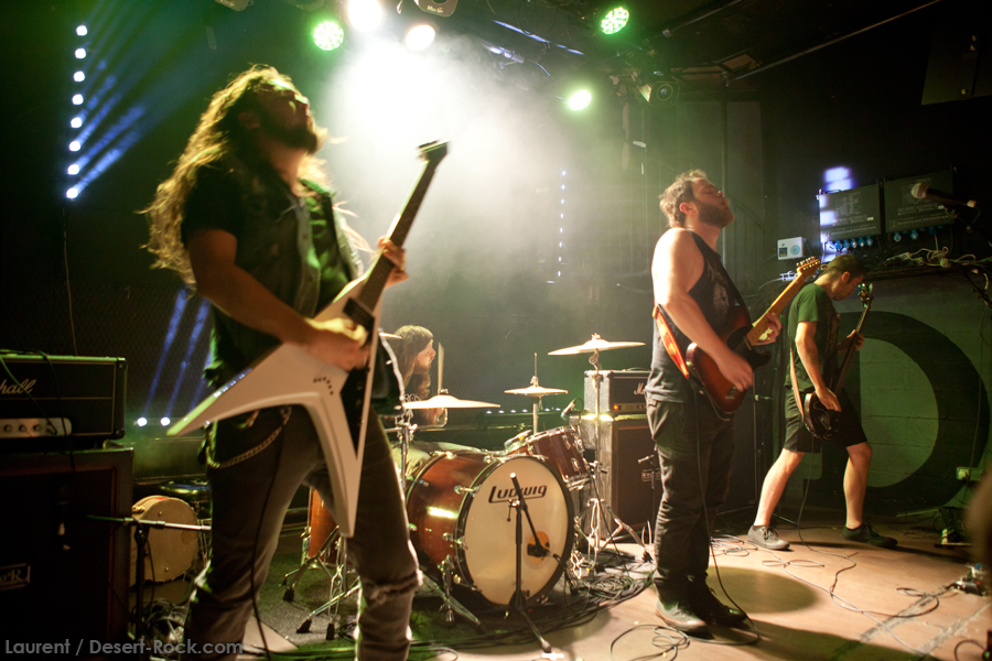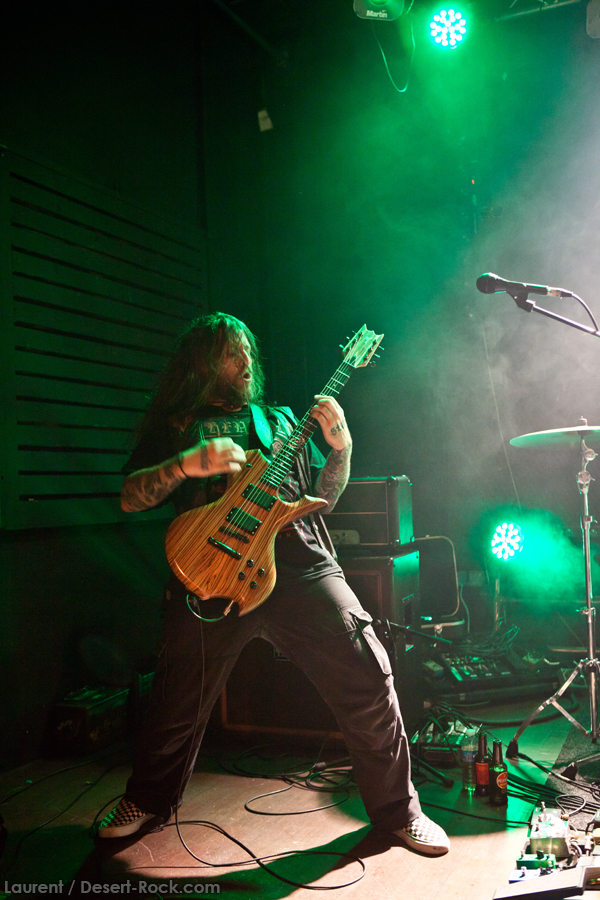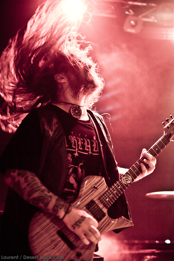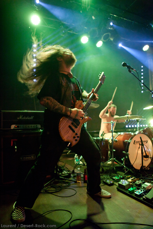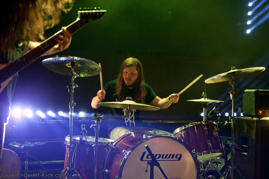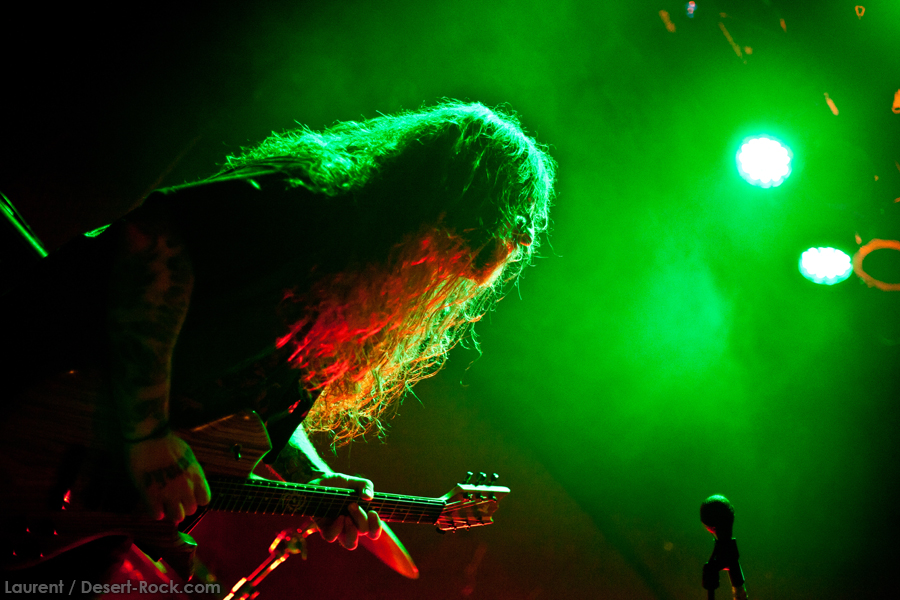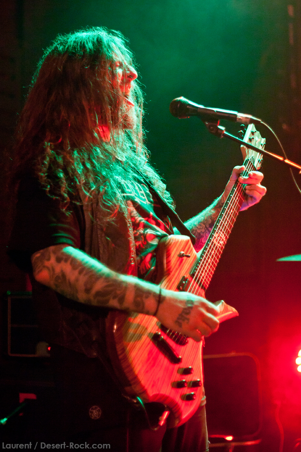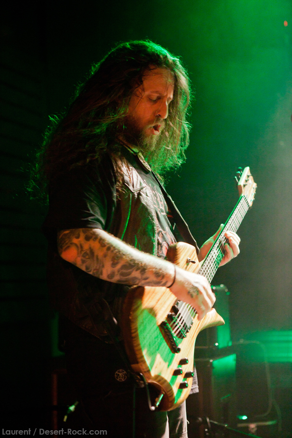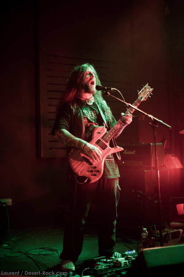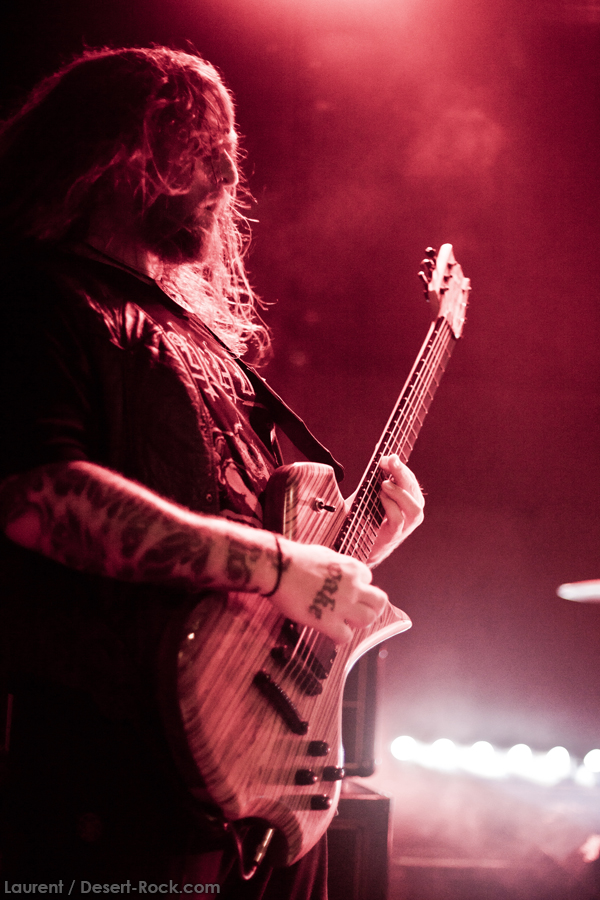 Quand Pallbearer prend la scène après nous avoir fait poireauter une bonne heure après l’ouverture des portes, les bonhommes, mornes à souhait, prennent quelques minutes tranquilles pour accorder leurs instruments, sans mot dire. Puis le set débute dans la même austérité, propice il est vrai à leur doom introspectif. Les titres sont tous joués sur un tempo pachydermique, les montagnes de grattes étant occasionnellement percées par les vocaux de Brett Campbell. La communication avec le public est presque inexistante, le quatuor enchaînant leur poignée de titres longs et épiques sans réelle interruption. Tout ceci est très lourd, mais un peu monotone dans l’interprétation, à l’image de la prestation toute en sobriété (terme politiquement correct pour dire qu’il a presque l’air de s’ennuyer…) de Campbell. Heureusement les pauses de guitar hero de Devin Holt et l’énergie de Joseph Rowland (qui vit le set avec intensité, chantant les paroles sans micro tout au long du concert) maintiennent la tension tout du long. Reste un manque de relief sur la longueur un peu ennuyeux de la part des collègues de label de Yob. Au bout de trois quarts d’heure de set, Campbell décoche une petite vanne sur la « stomach flu » du batteur, mais surtout annonce la fin du set d’un solennel « we’ve only got one more song, but we’re gonna make it worthy », avant de se lancer dans le fiévreux « Foreigner », bien entendu, un titre puissant et envoûtant, probablement leur titre phare. Le final, propice à des avalanches de soli en harmonie parfaitement exécutés, avec un fond de samples de flûte discrets, vaut son pesant de cacahouètes. Le morceau passe bien et, clairement, remonte la barre d’un set de bonne qualité, mais qui aurait pu sinon sombrer dans l’ennui, après quasiment une heure.