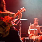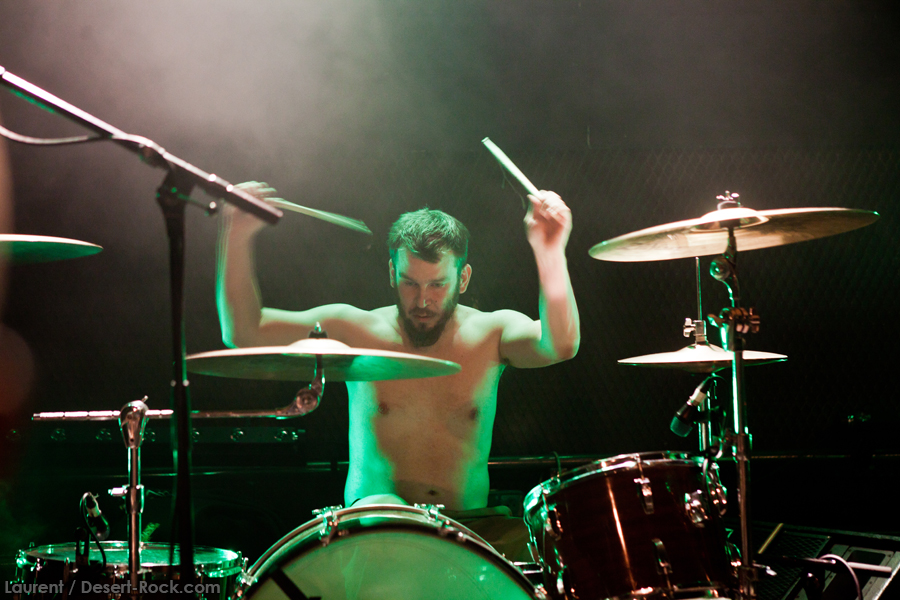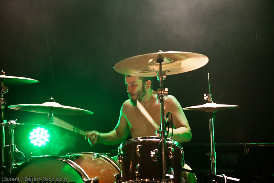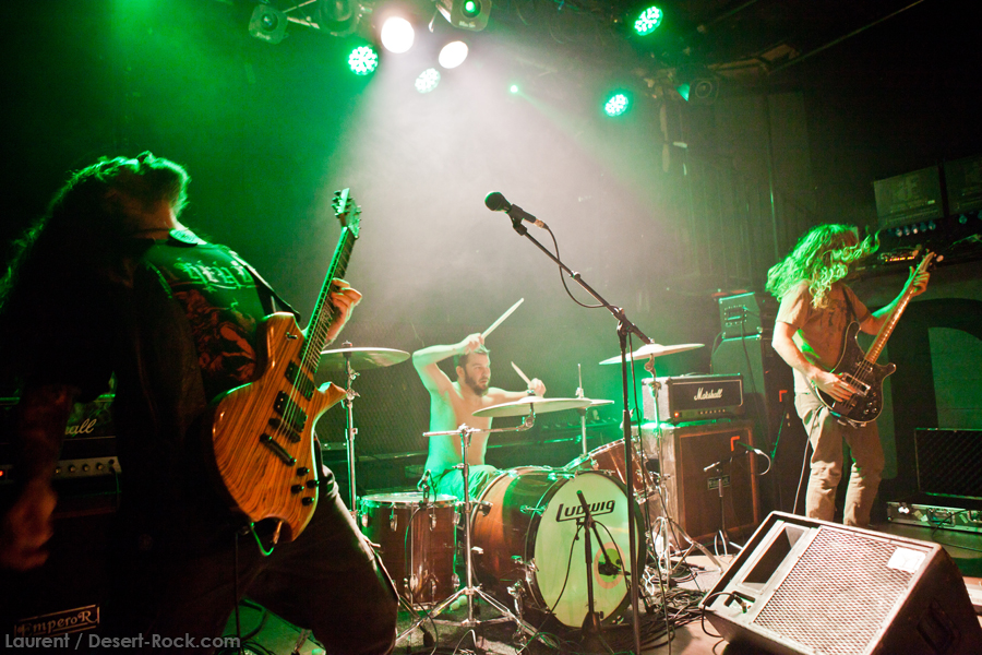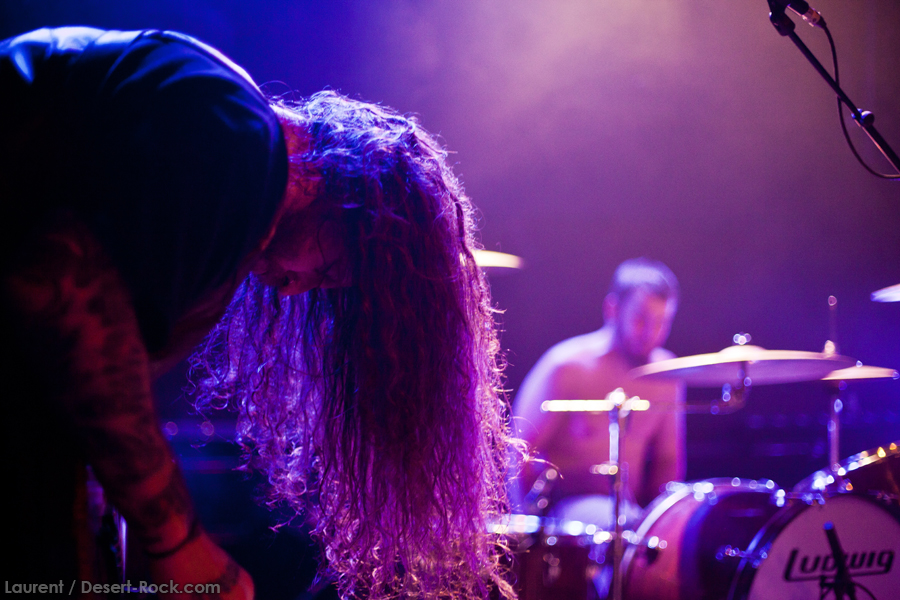 L’heure de Yob sonne enfin. Le trio tant attendu monte sur scène et, dans l’illusion d’une mise en place instrumentale improvisée, construit en réalité pendant quelques minutes l’introduction de « Ball Of Molten Head », par apport progressif des différentes nappes instrumentales. Montée en tension expresse pour un titre bien enlevé, qui donnera bien le ton d’une soirée pesante (dans le bon sens du terme). Ce titre qui a une bonne décennie dans les dents s’inclut bien dans une set list qui donne la part belle aux titres récents, dont trois (des quatre) chansons du petit dernier Clearing The Path To Ascend seront jouées ce soir – à commencer par le très lourd « In Our Blood » qui finit de construire la chape de plomb qui pèsera ensuite pendant une heure et demie sur le public ravi. Chaque titre tapant entre les dix minutes et le gros quart d’heure, l’engagement des musiciens est forcément la clé du dispositif live, et cet engagement ce soir est infaillible. Évidemment Mike Scheidt, entre rage pure, concentration, introspections extatiques, est le frontman que l’on attendait, mais aussi le chef d’orchestre d’un trio qu’il pilote continuellement. Mais ses collègues ne sont pas en reste, et tandis que Rieseberg à la batterie est plus concentré qu’expressif, le bassiste Travis Foster ne manque ni d’énergie ni d’efficacité dans son rôle crucial en rythmique. Même si Scheidt rencontre quelques difficultés techniques sur ce titre (il se reposera sur la base rythmique de ses collègues le temps de bidouiller ses branchements), son efficacité est indiscutable. Le rageur « Nothing To Win » vient par la suite terrasser un public qui est désormais complètement immergé, voire même noyé, la bave aux lèvres et la nuque hochante. « The Lie That Is Sin » s’incorpore lui aussi parfaitement dans le set, propice à une démonstration vocale du chanteur, impeccable de puissance dans des registres variés. La fin de ce titre voit le chanteur s’adresser au public pour le prévenir que, désespoir, il ne reste que deux titres à jouer. Mais, nous prévient-il, ils seront « méga extrêmes ». Les trois américains s’engagent alors dans un sentier dont peu de monde ressortira indemne, à savoir l’aventureux « Marrow », méandre émotionnel imparable sur disque, dont la retranscription live apporte, qui l’eut cru, une dimension encore différente. Le titre déroule ses différentes séquences pendant vingt bonnes minutes, tour à tour mélodiques et puissantes, créant une tension qui atteint là son paroxysme dans cette soirée qui n’en manquait pourtant pas. A ce stade, le public est dans un état de transe difficilement concevable : les visages pointent souvent vers le ciel, les yeux fermés, ou alors le regard dans le vide. Les corps, quant à eux, ondulent dans tous les sens, comme foudroyés sur place à chaque frappe de Aaron Rieseberg.